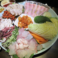 해삼,멍게,전복,문어,광어,숭어가 푸짐하게 놓여 있고