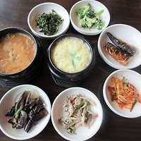 식사용 밑반찬들과 된장찌개