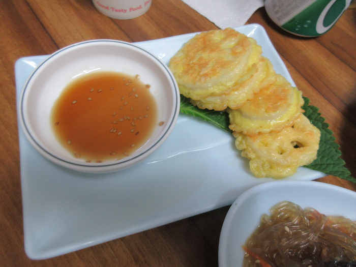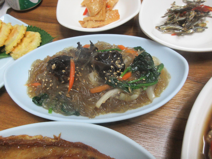 연근으로 만든 연근전, 고등어구이, 바로 만든 잡채도 나옵니다.