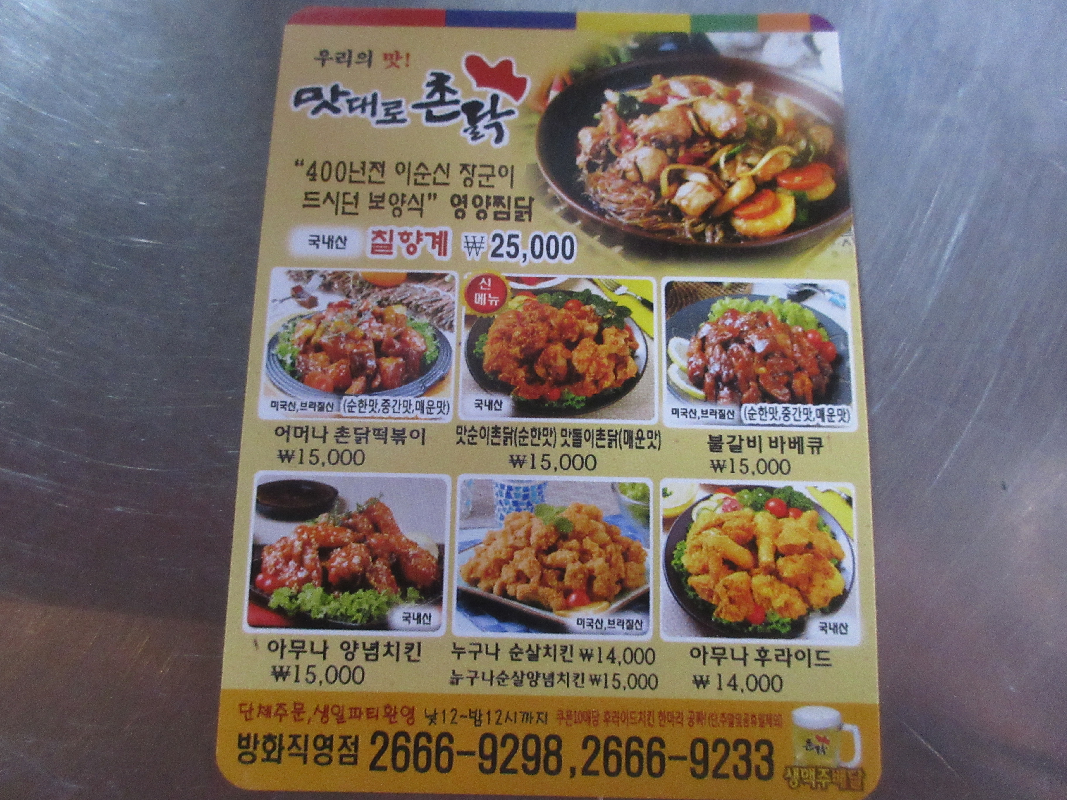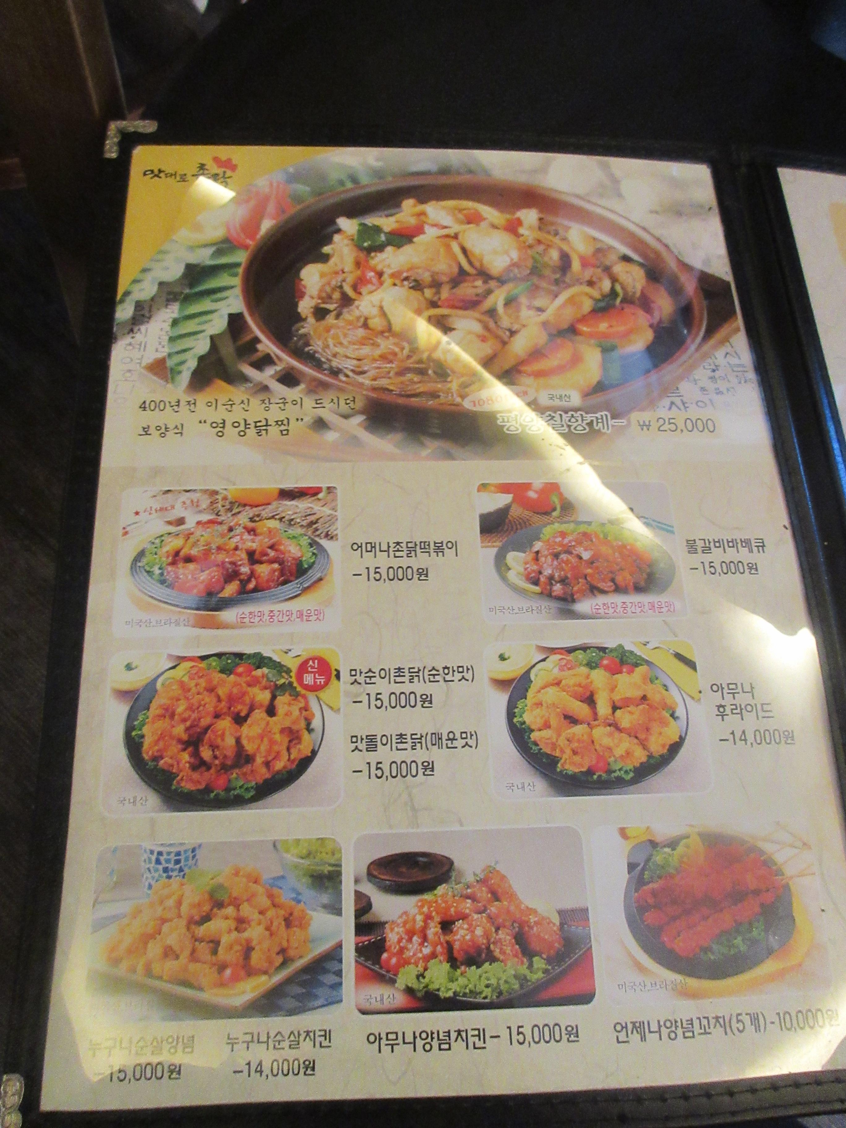 북한의 대표적 닭요리라는 칠향계 찜을 비롯하여 치킨떡볶이, 불갈비 바비큐, 후라이드 & 양념 치킨