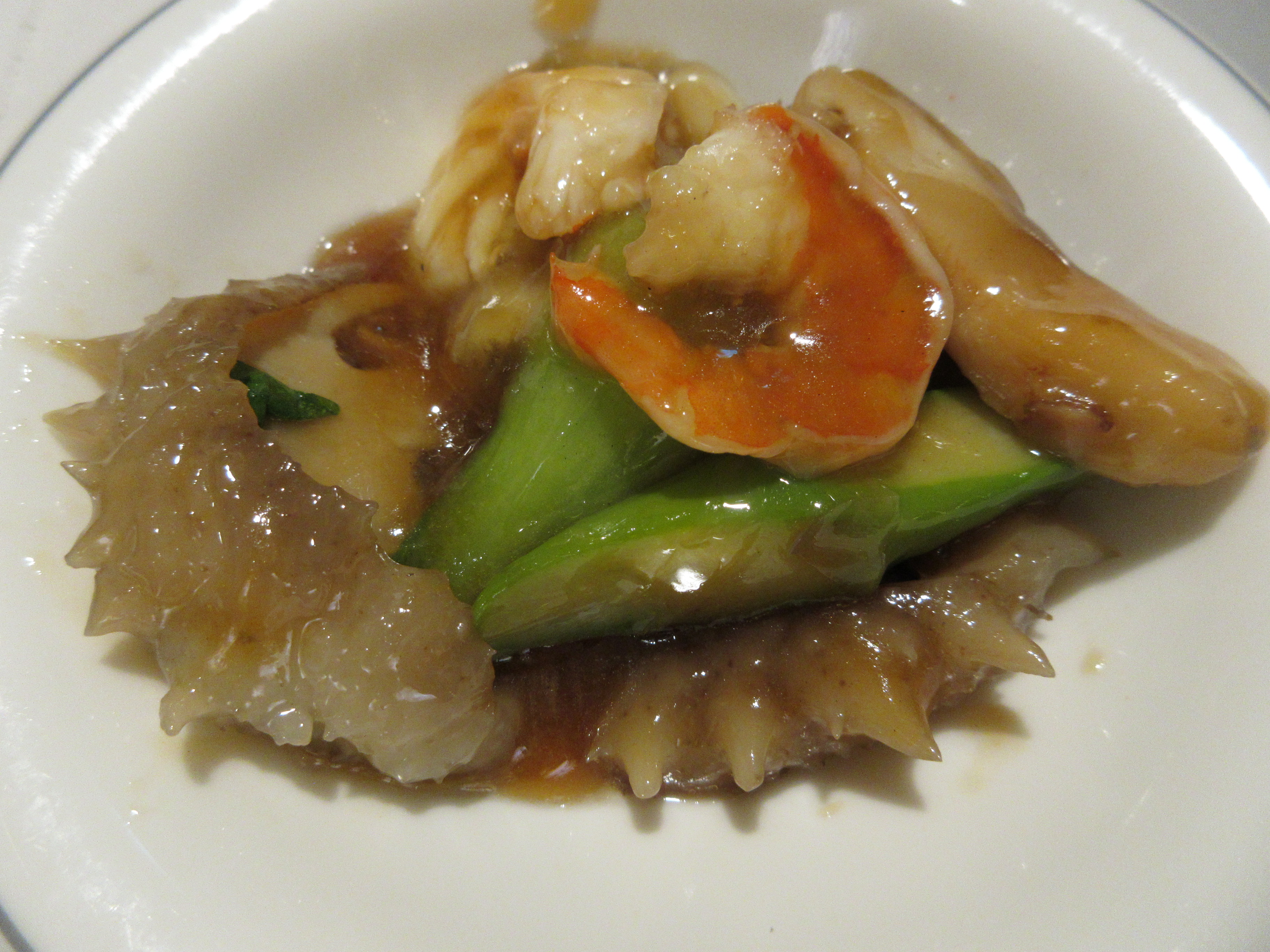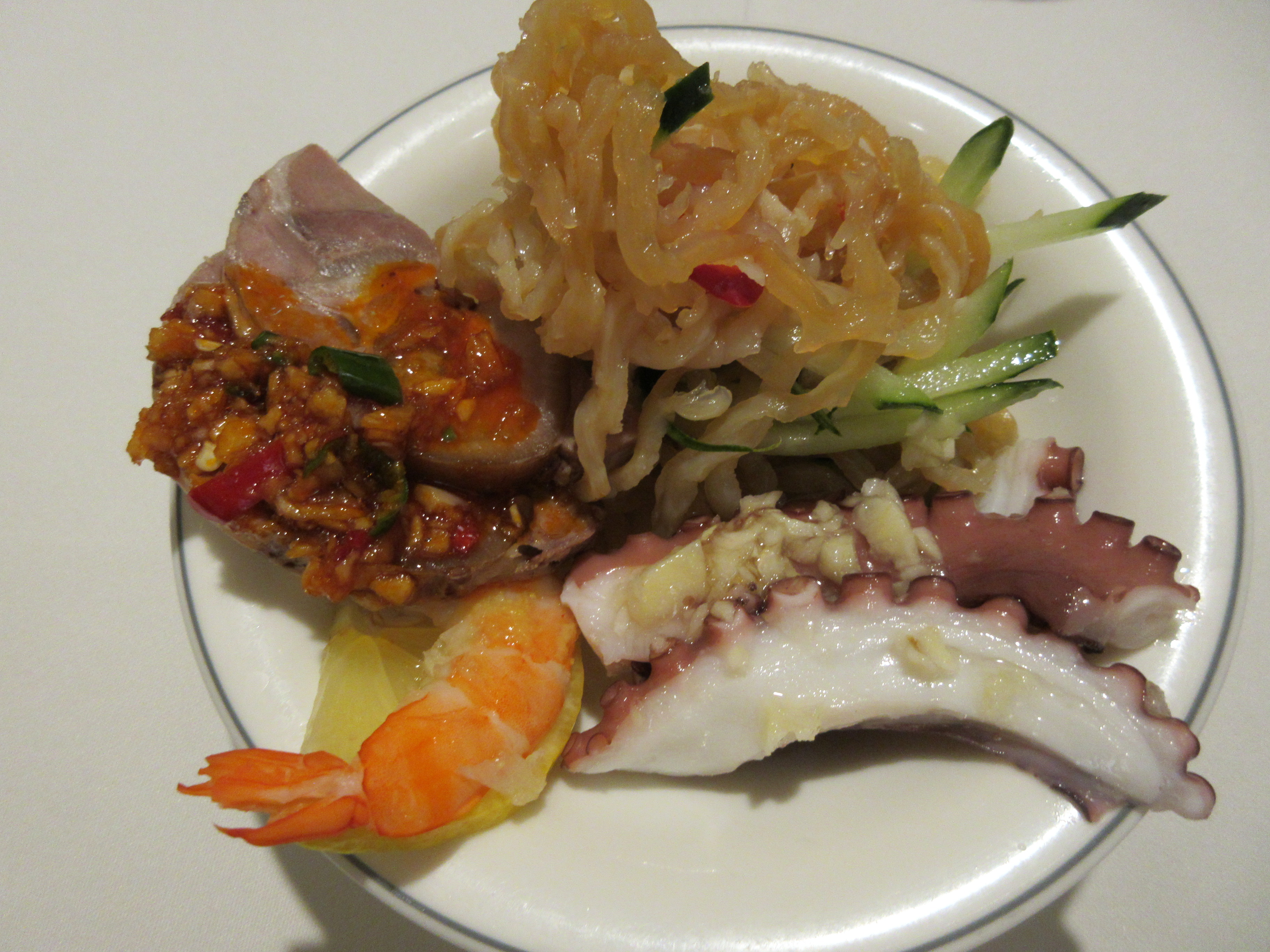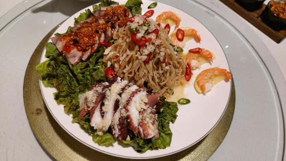 이 집 냉채는 국내 남해산 돌문어숙회에 새우와 족발, 그리고 상큼하고 꼬들꼬들한 식감의 해파리냉채가 나옵니다.