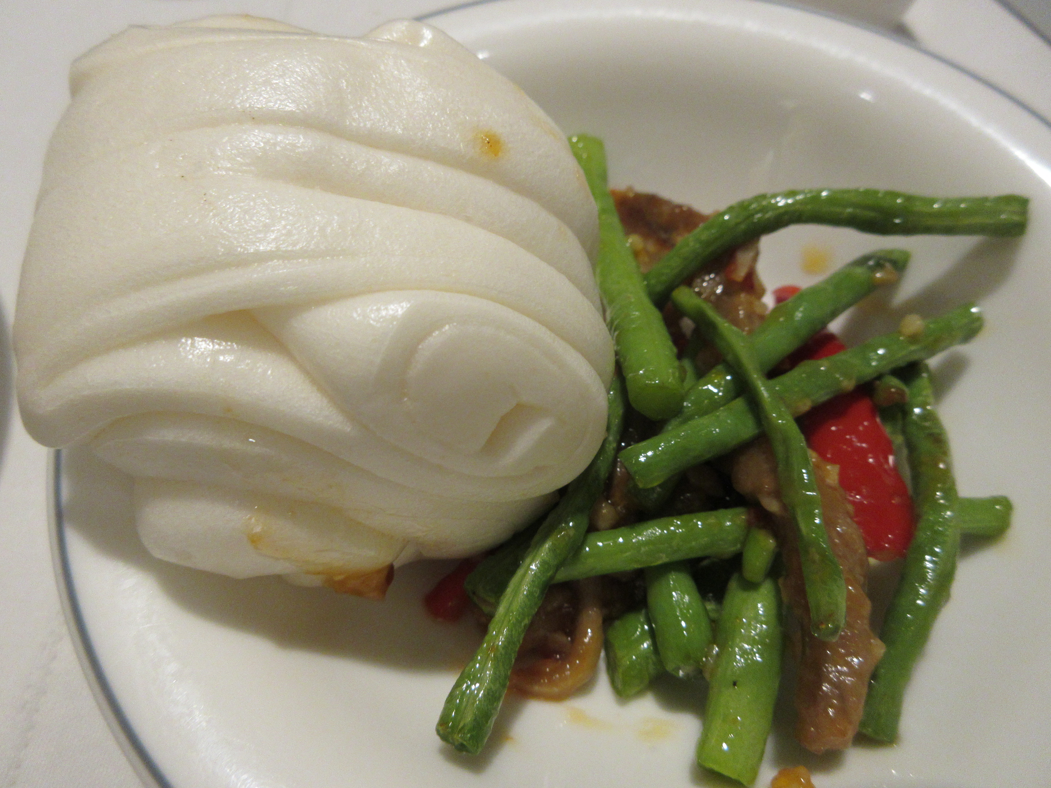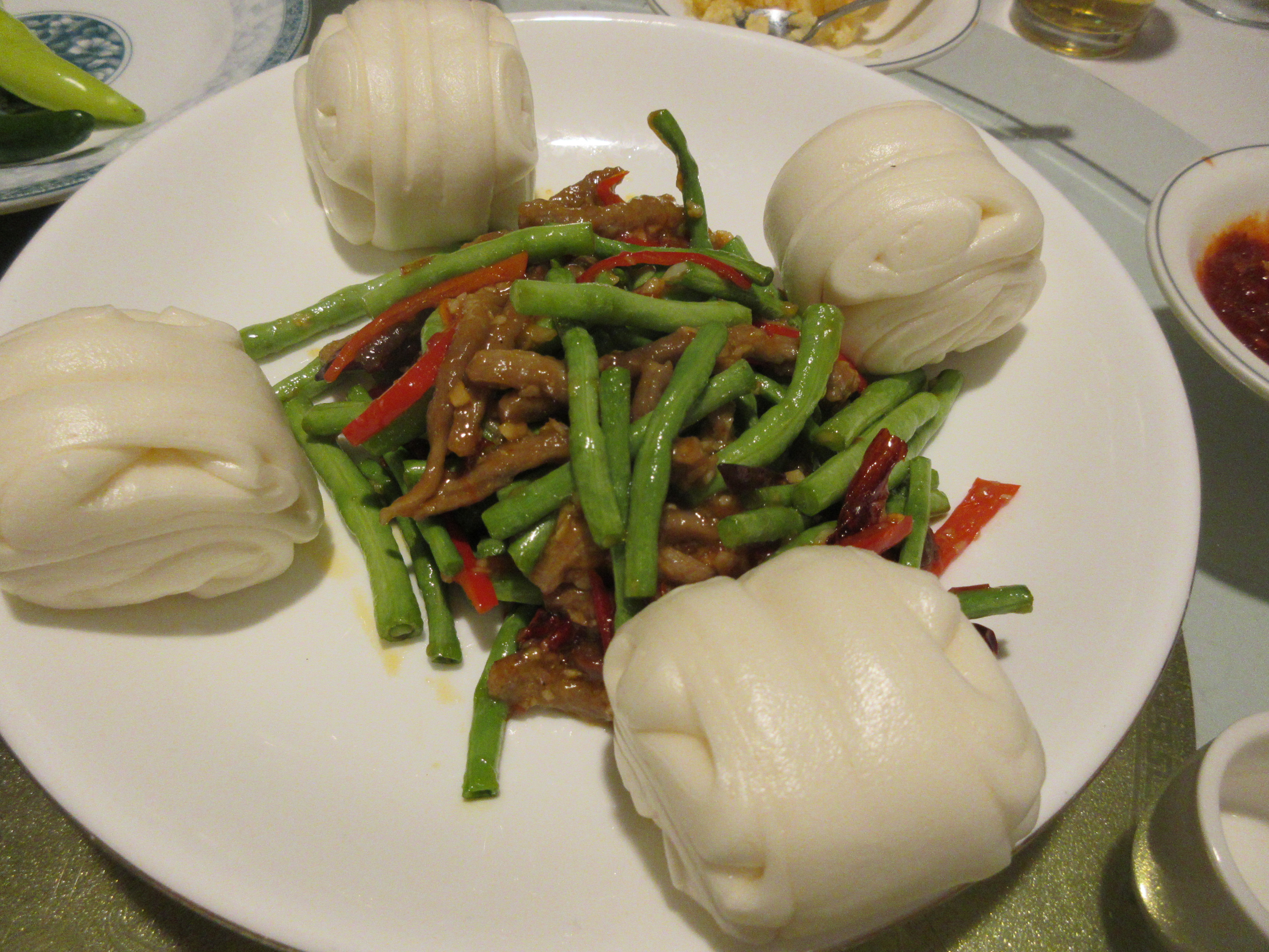 보통 꽃빵이 나올 때는 피망을 볶아 만든 고추 잡채나 중국 부추로 만드는 부추잡채가 나오는데
