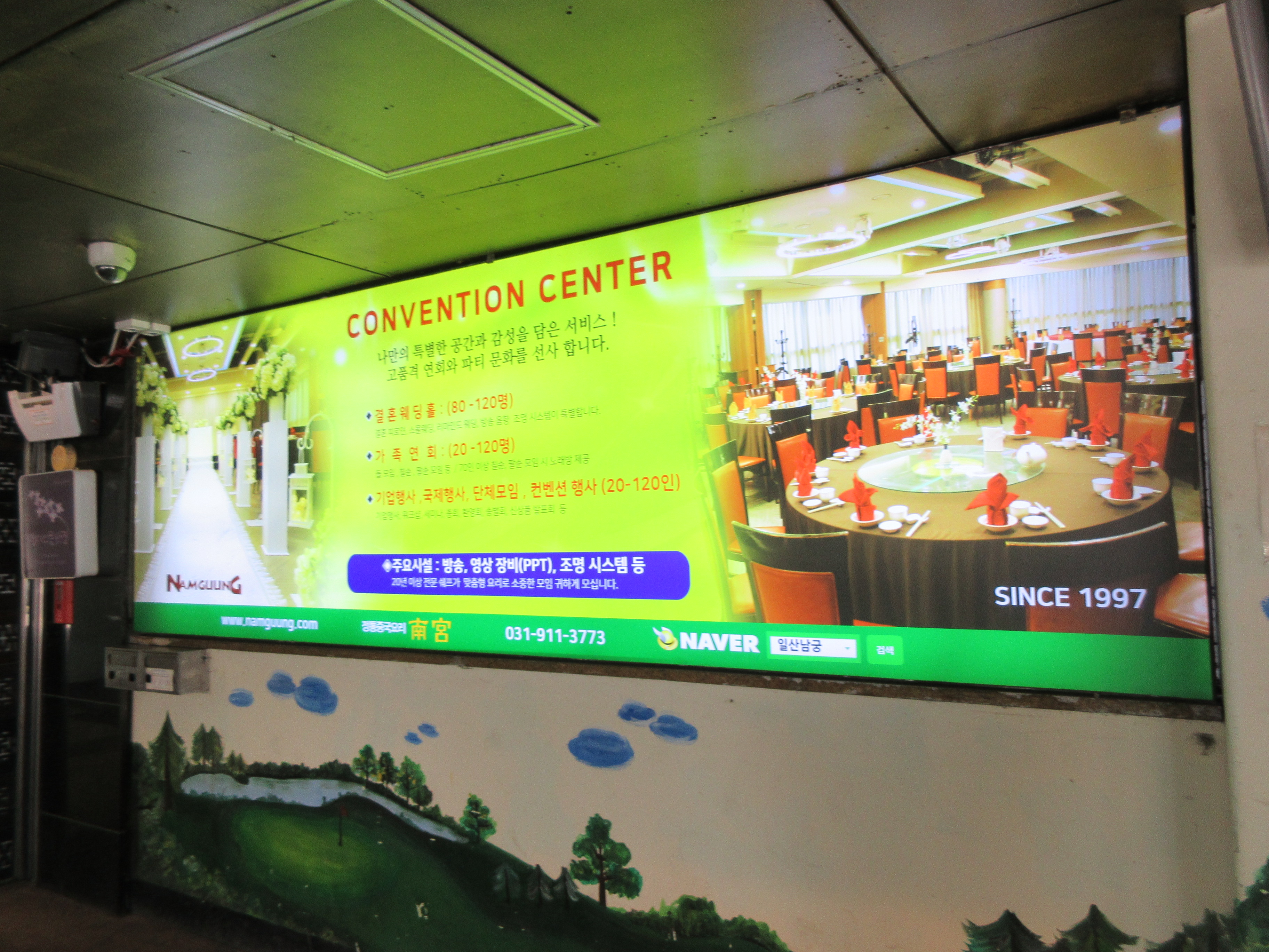 방송, 영상장비(PPT), 조명, 뮤직 시스템 등도 구비되어 있다는 광고문도 걸려 있습니다.