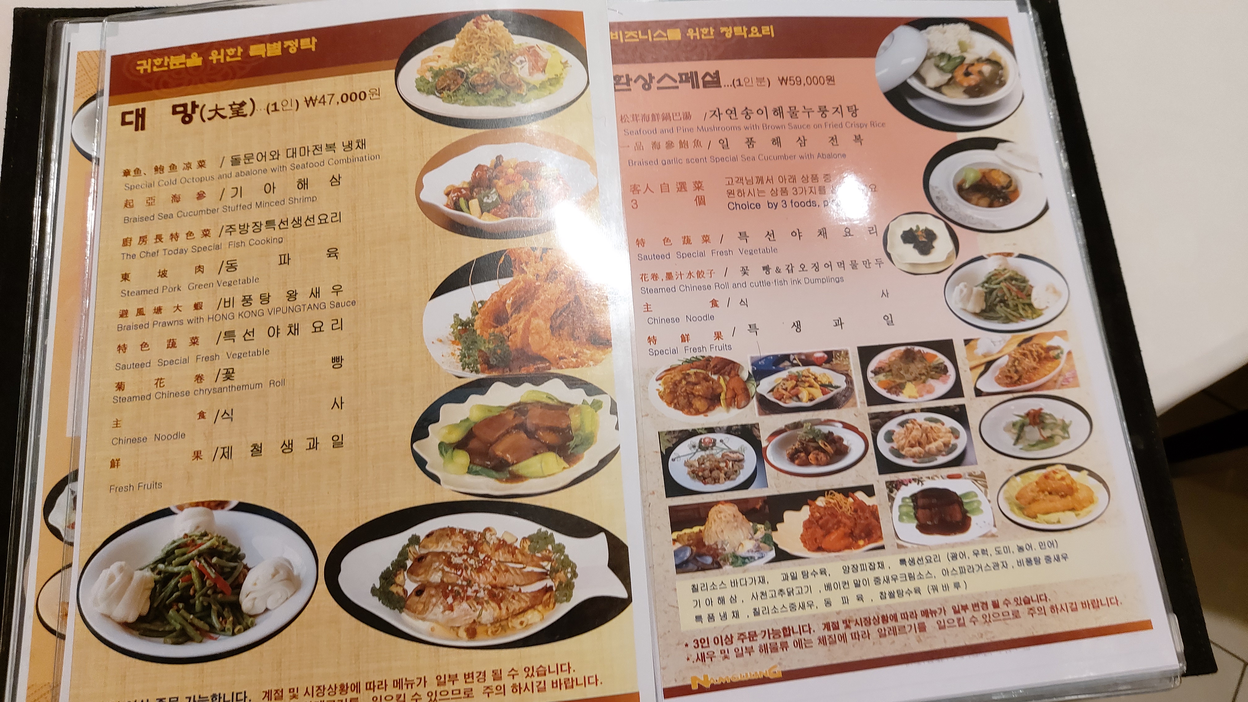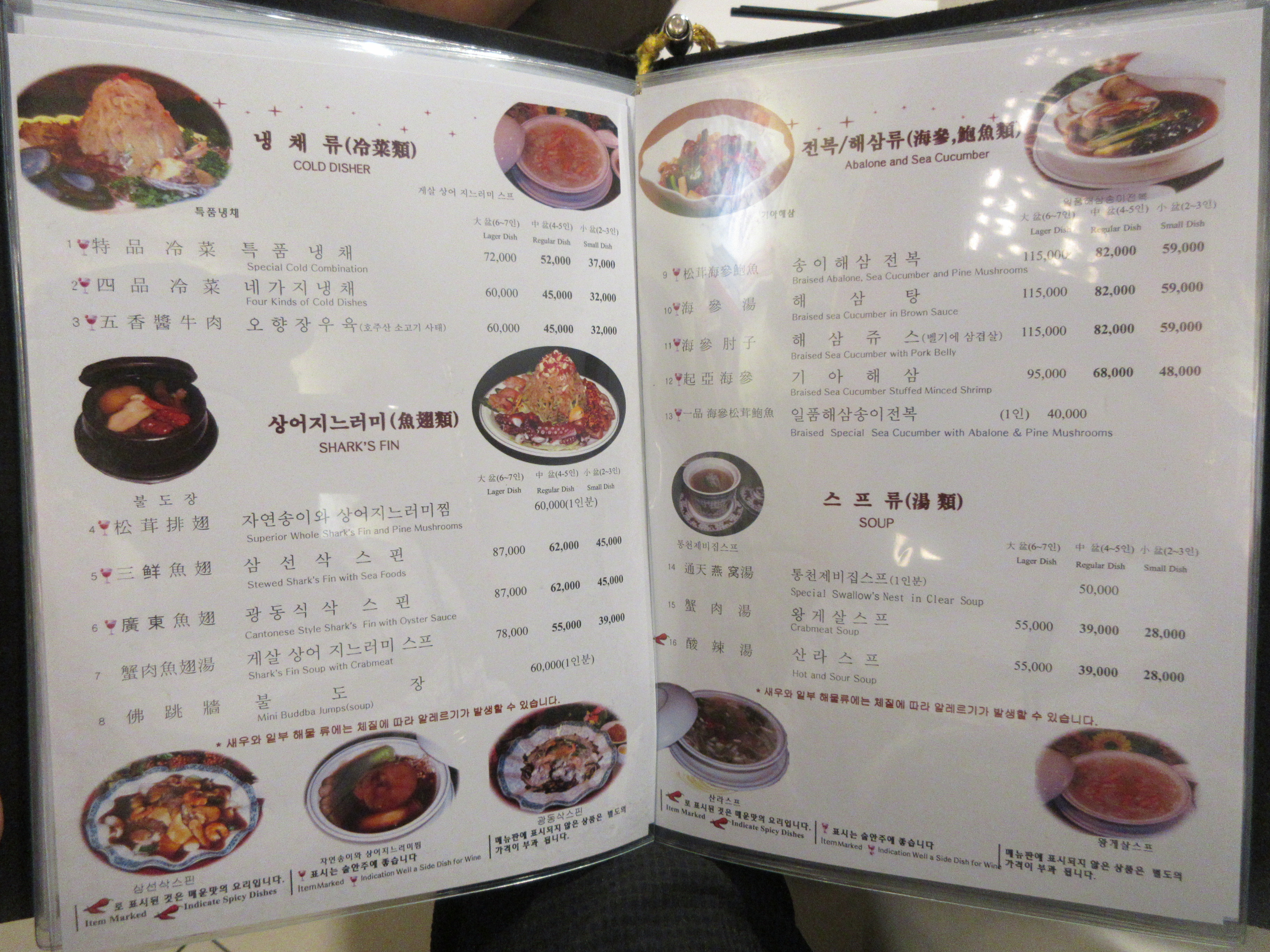 보통은 해파리냉채에 오향장육 고기, 새우요리, 송화단에 품수에 따라 한두 가지 요리가 더 추가되는 게 보통인데