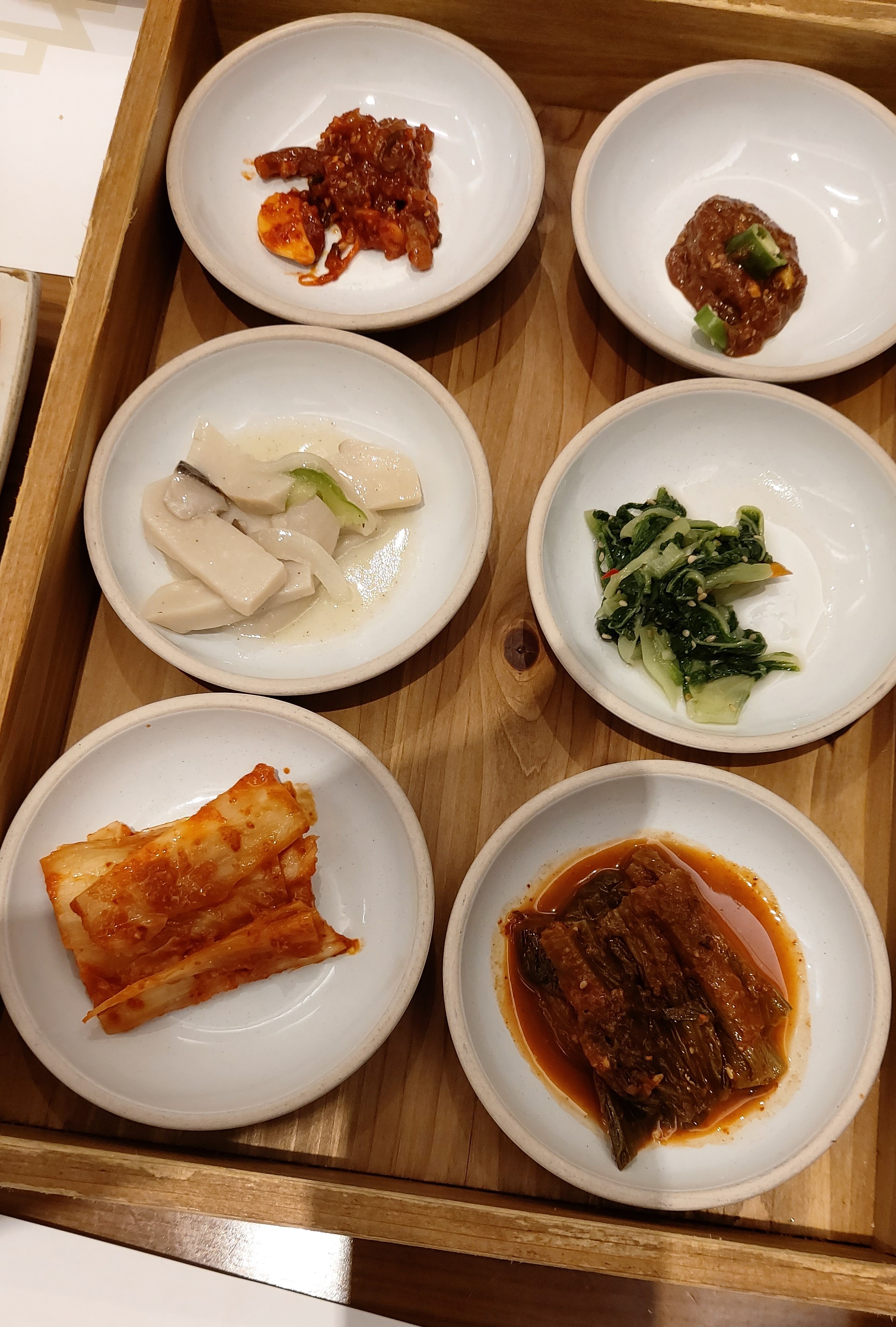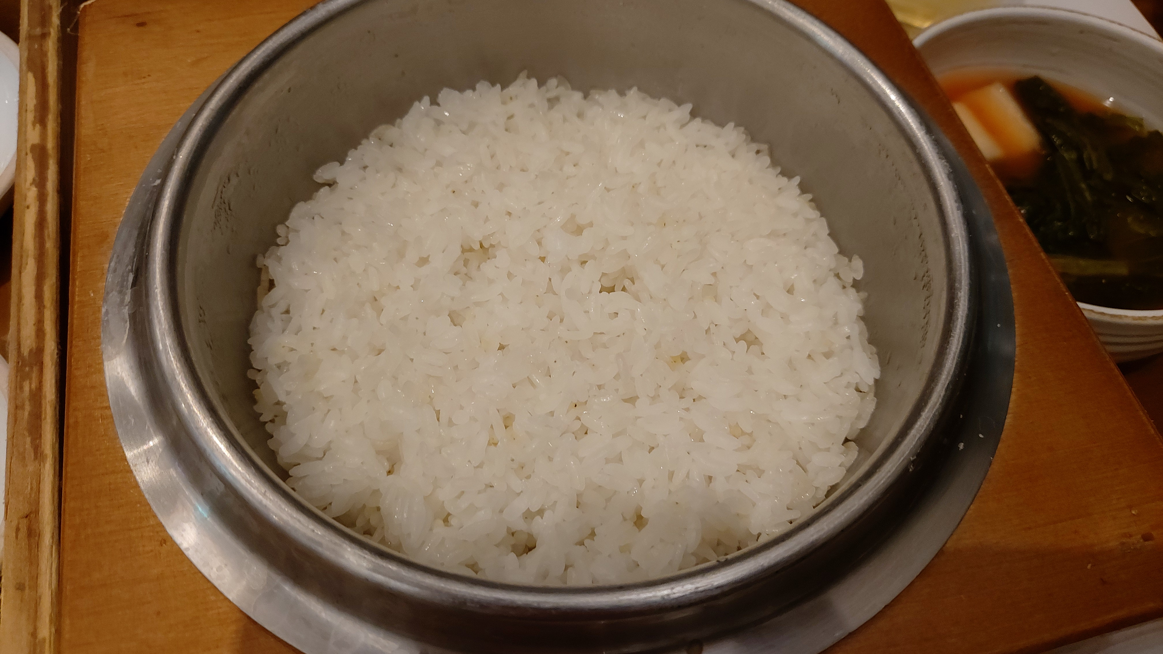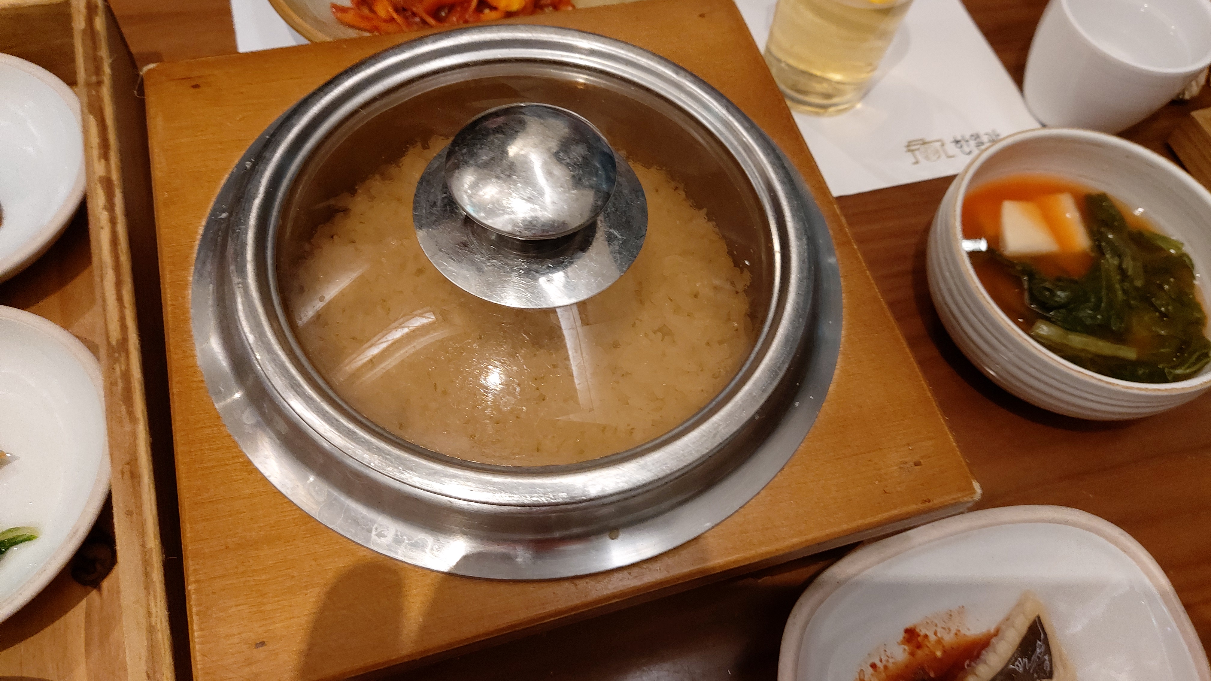 반찬 6종(김치 2종, 젓갈 2종, 나물 2종)에 솥밥 그리고 뚝배기 된장찌개가 나옵니다.