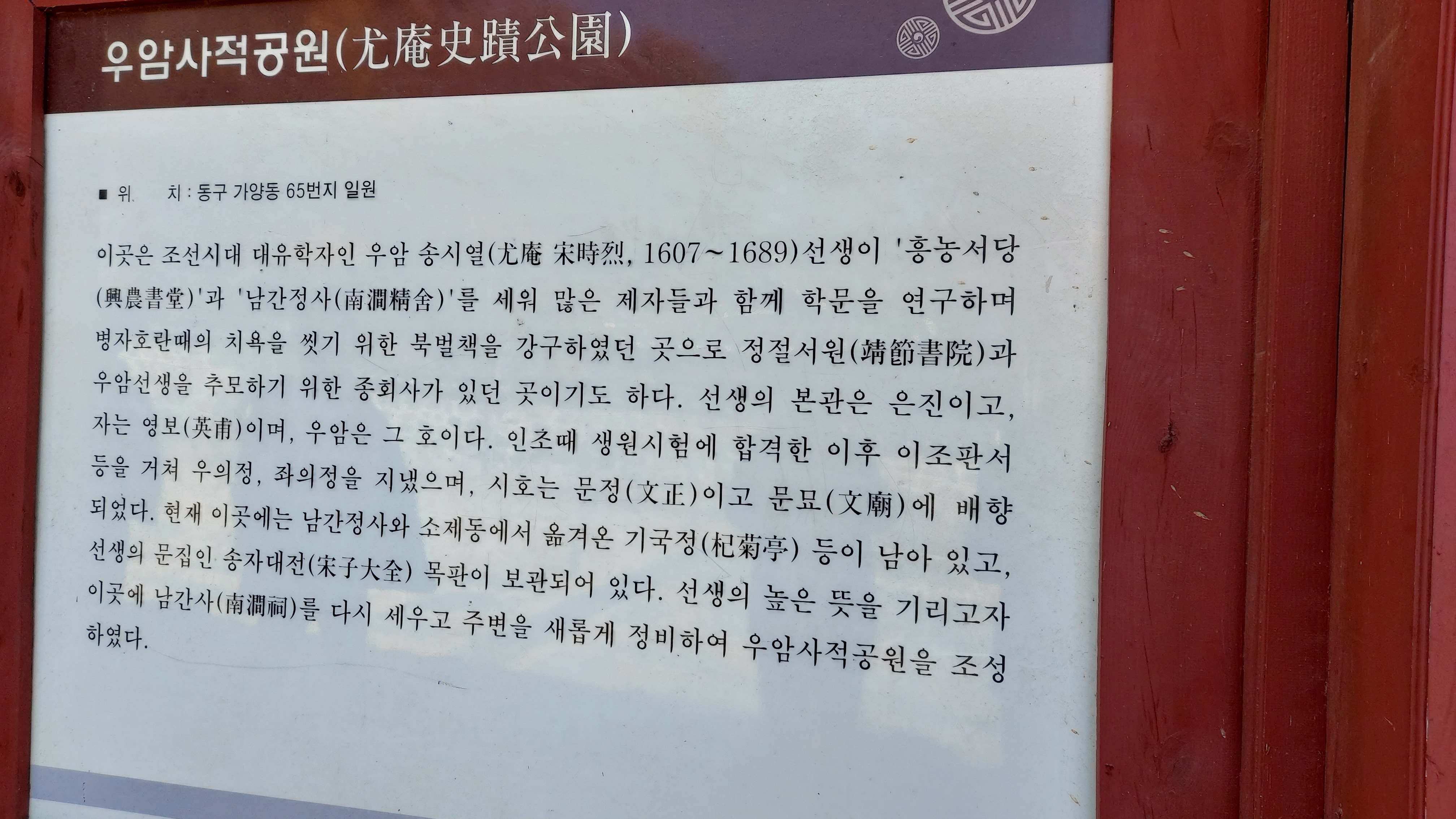 우암사적공원 : 대전광역시 동구 가양동 65 ( 충정로 53 ) TEL 042 - 270 - 8691