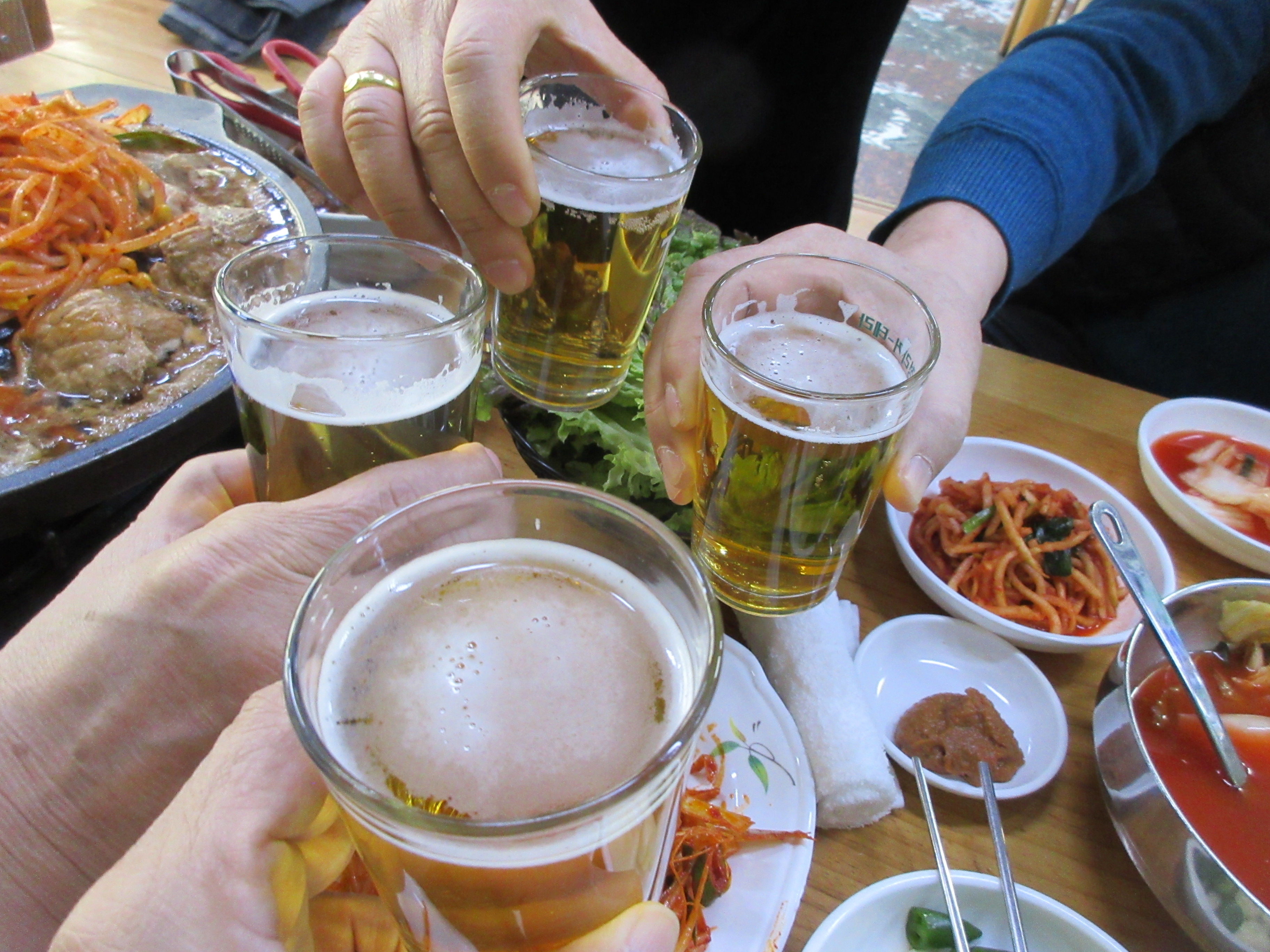 고기도 익었고 걷기도 했으니 시원하게 한잔 건배