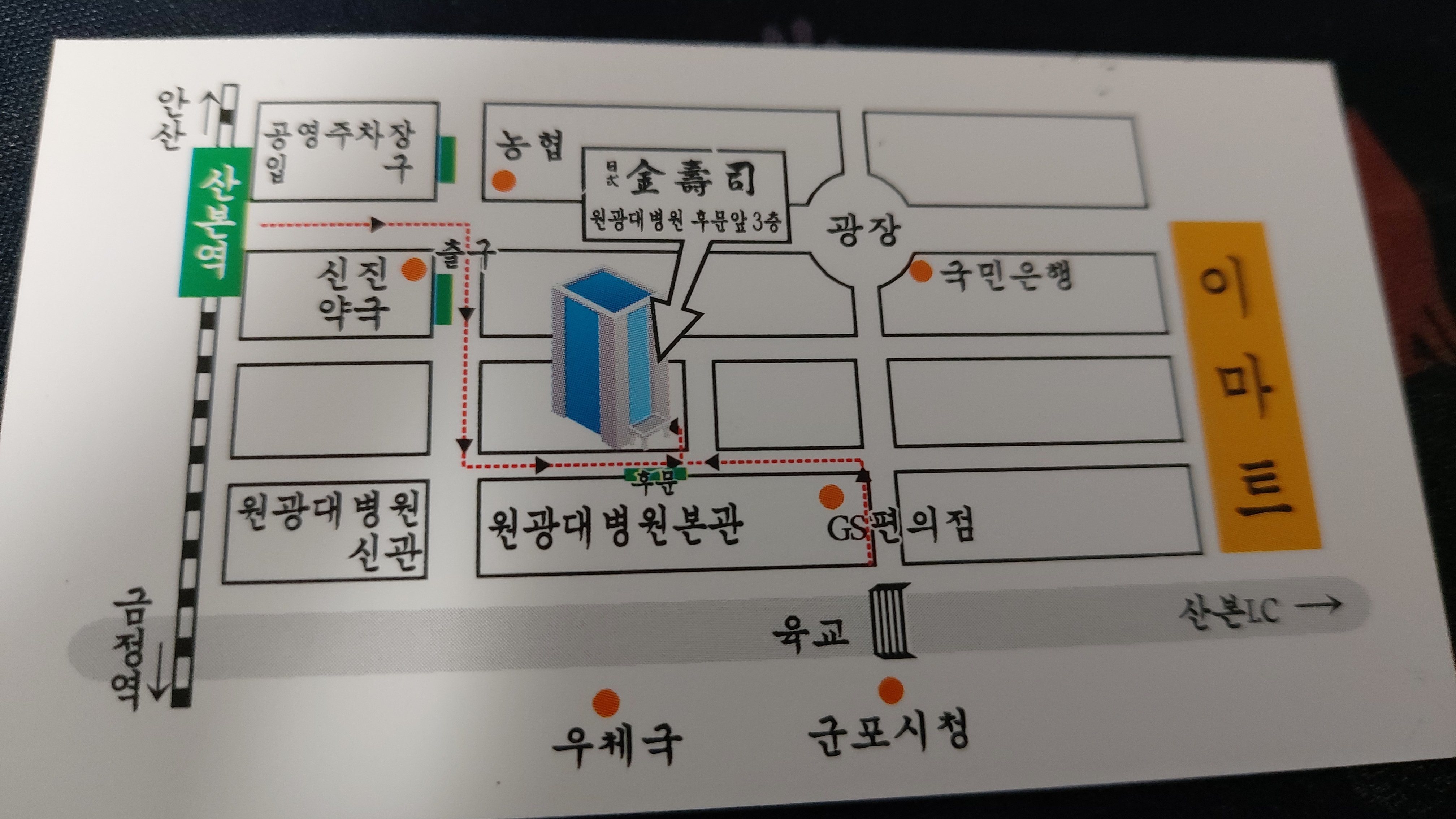 산본역앞 원광대병원 본관 후문 앞 청우빌딩 3층에 있습니다.