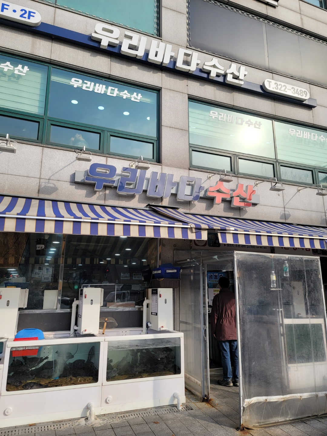 우리바다수산은 망원역 1번 출구에서 마포구청 방면으로 3~4분 정도 거리 대로변에 있습니다.