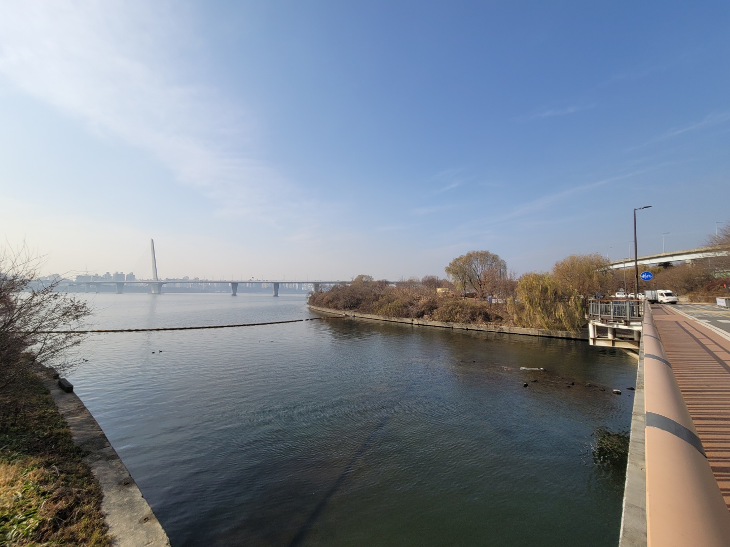홍제천을 따라 내려가서 성산대교 아래를 돌아 망원시장을 거쳐