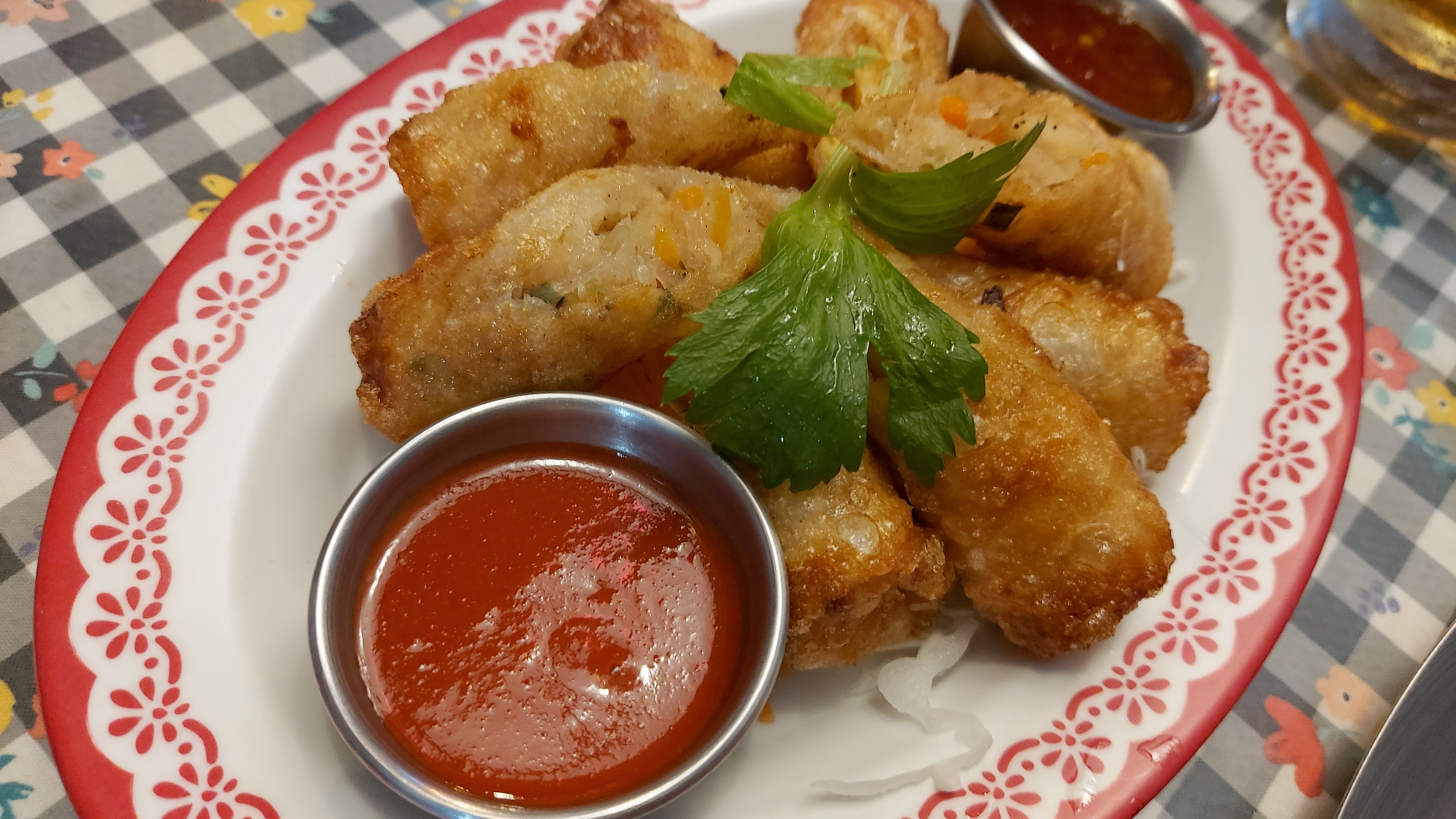 뽀삐아 톳 ( 스프링롤 튀김 : 8,000원 )과 돼지고기볶음인 무 팟 남픽파오 ( 칠리 돼지고기볶음 : 23,000원 )