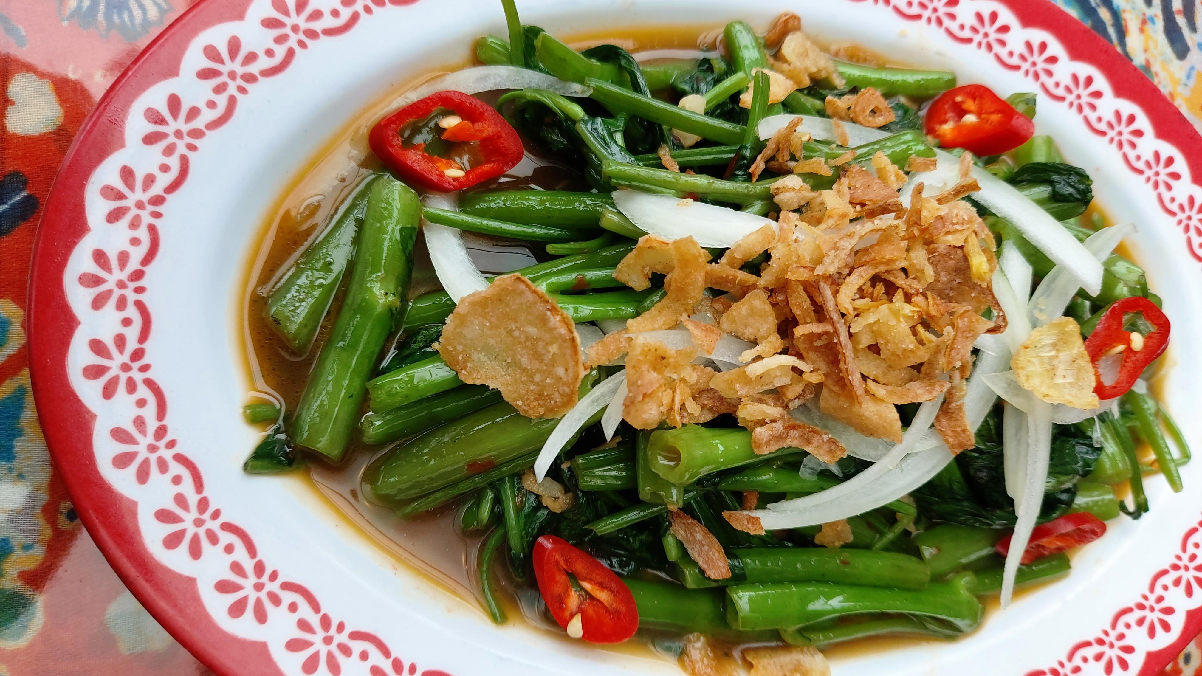 팍붕 화이텡(공심채볶음 : 15,000원)과 삣까이톳 ( 닭날개튀김 : 8,000원 )