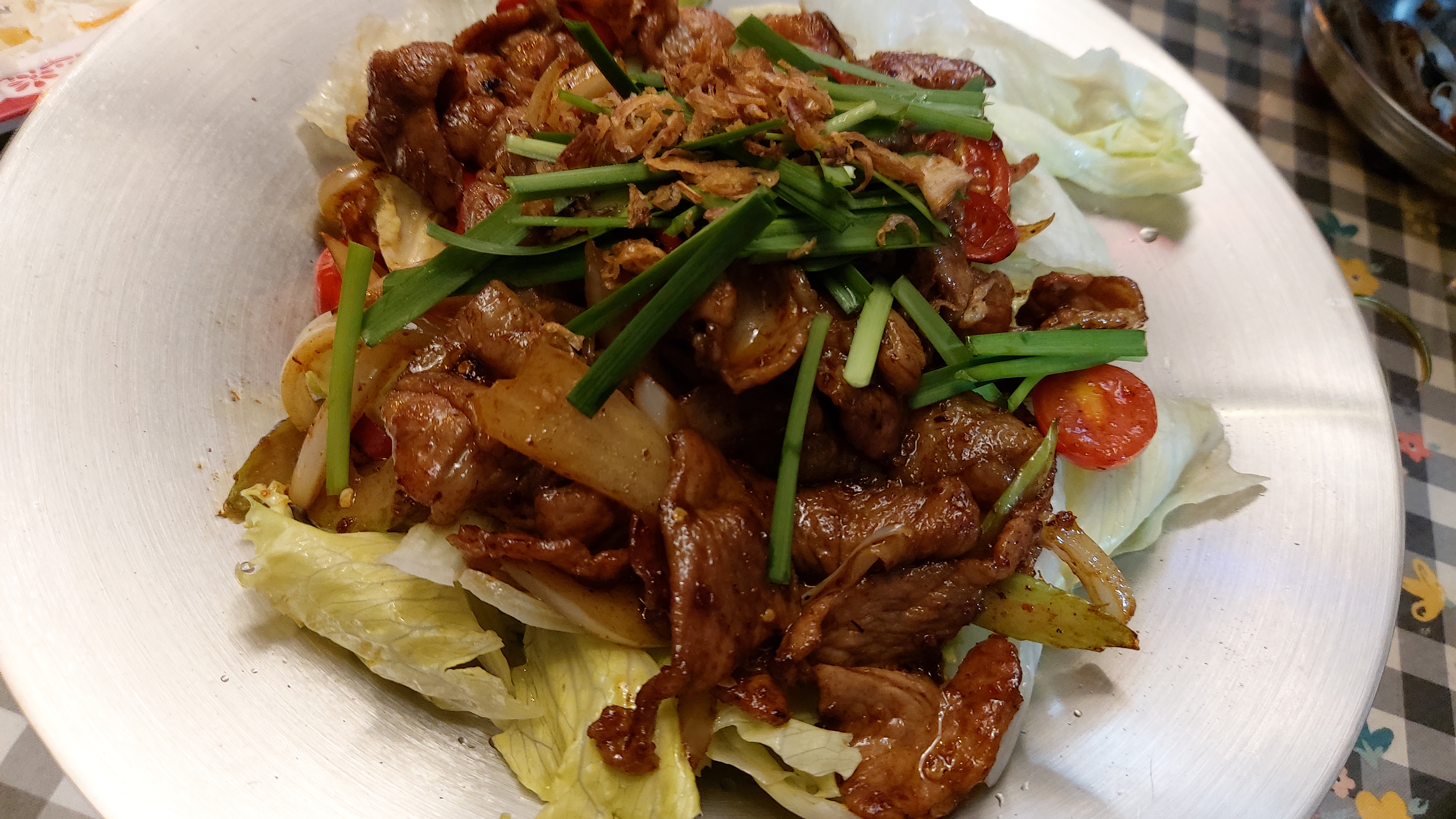 돼지고기를 태국식으로 불맛 나게 볶아 양상추와 같이 주는데 양상추에 고기를 싸서 먹으면 좋습니다.