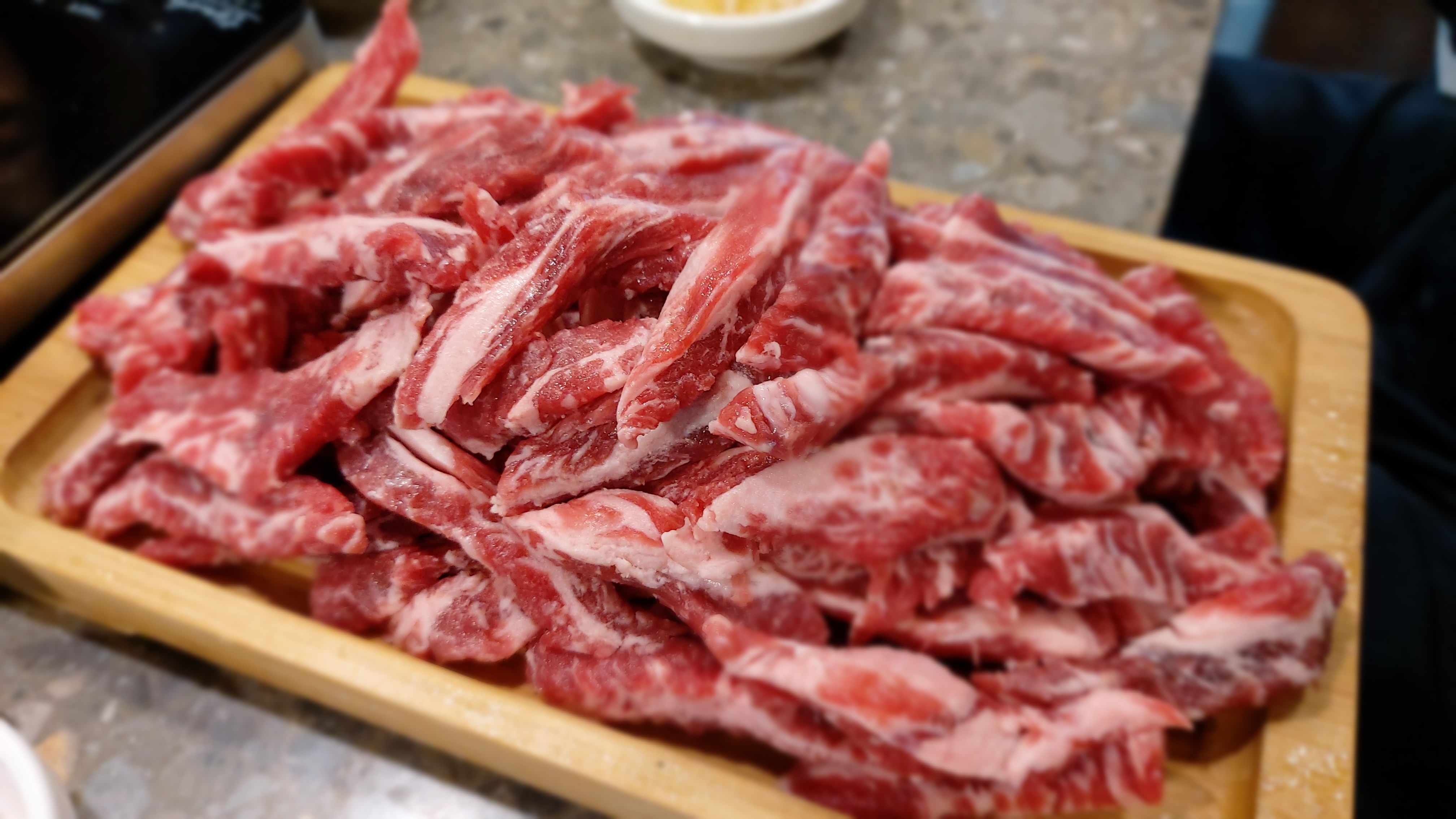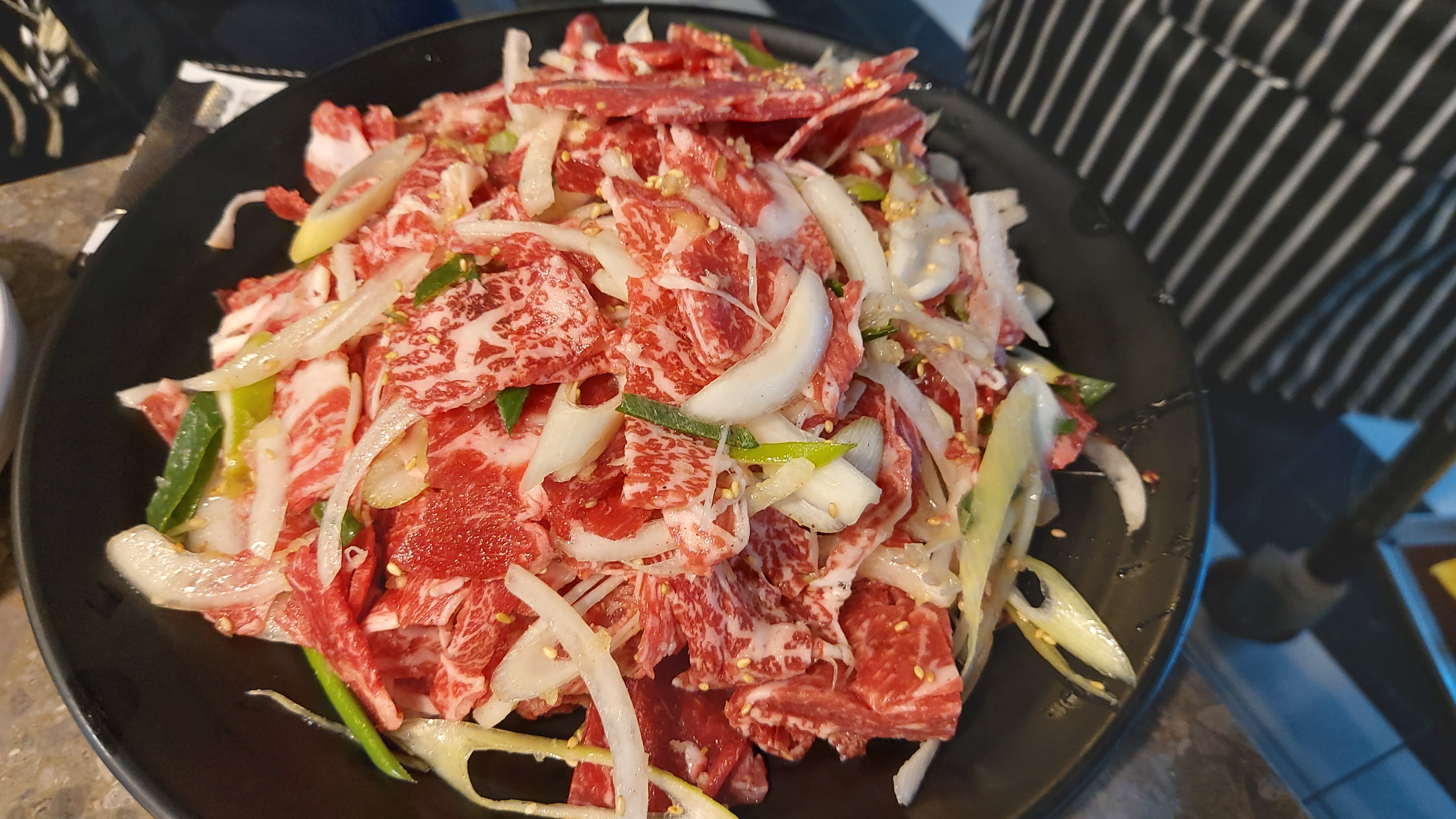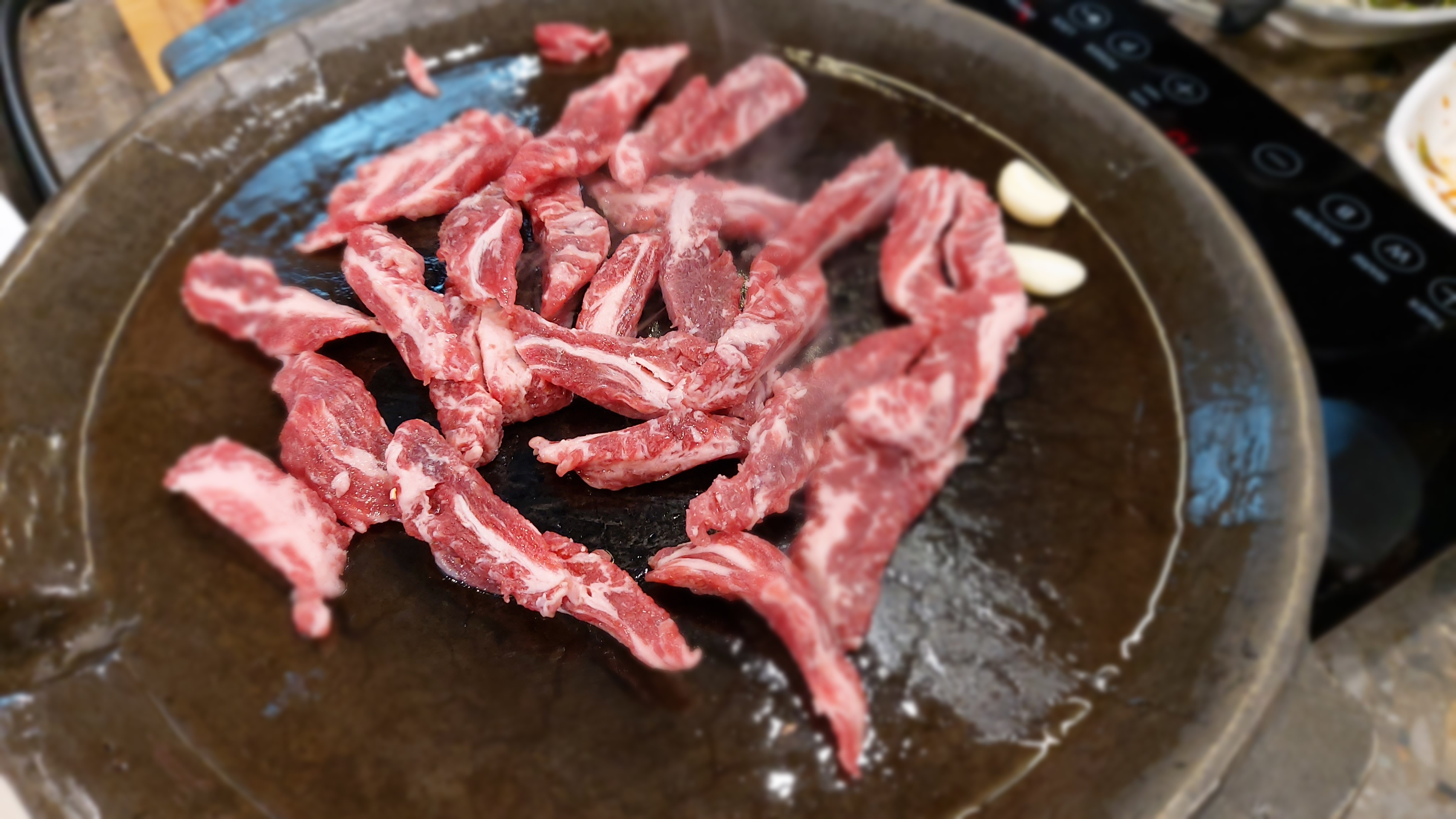 인덕션 위에 철로 만든 구이판이 놓이고 주문한 갈빗살이 나옵니다.
