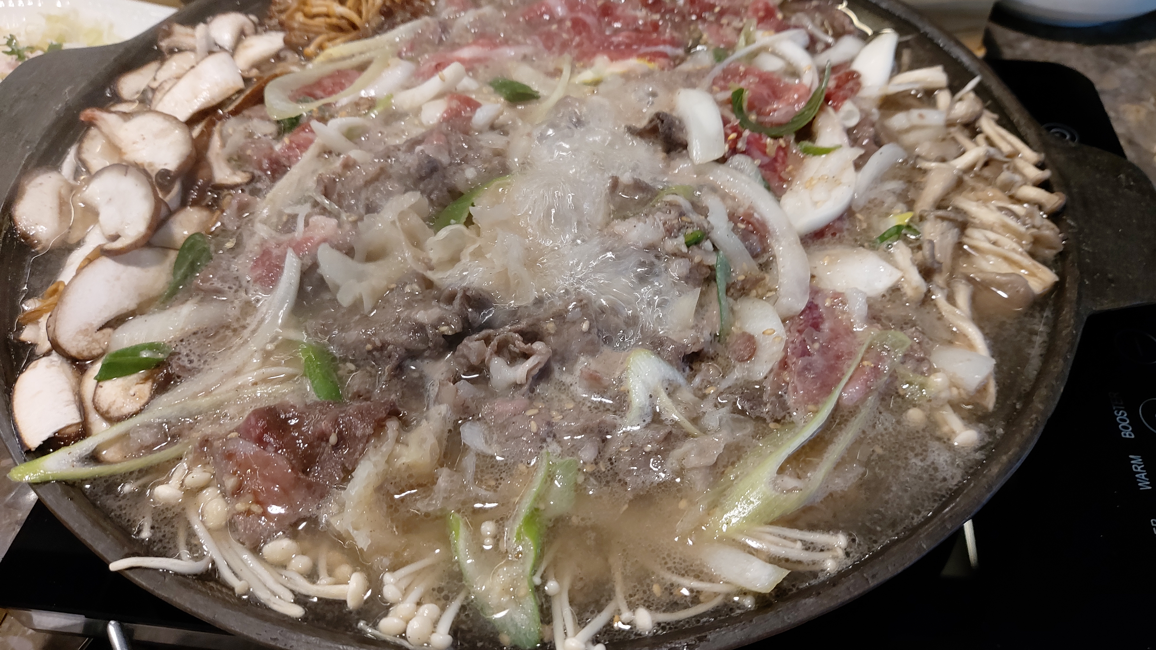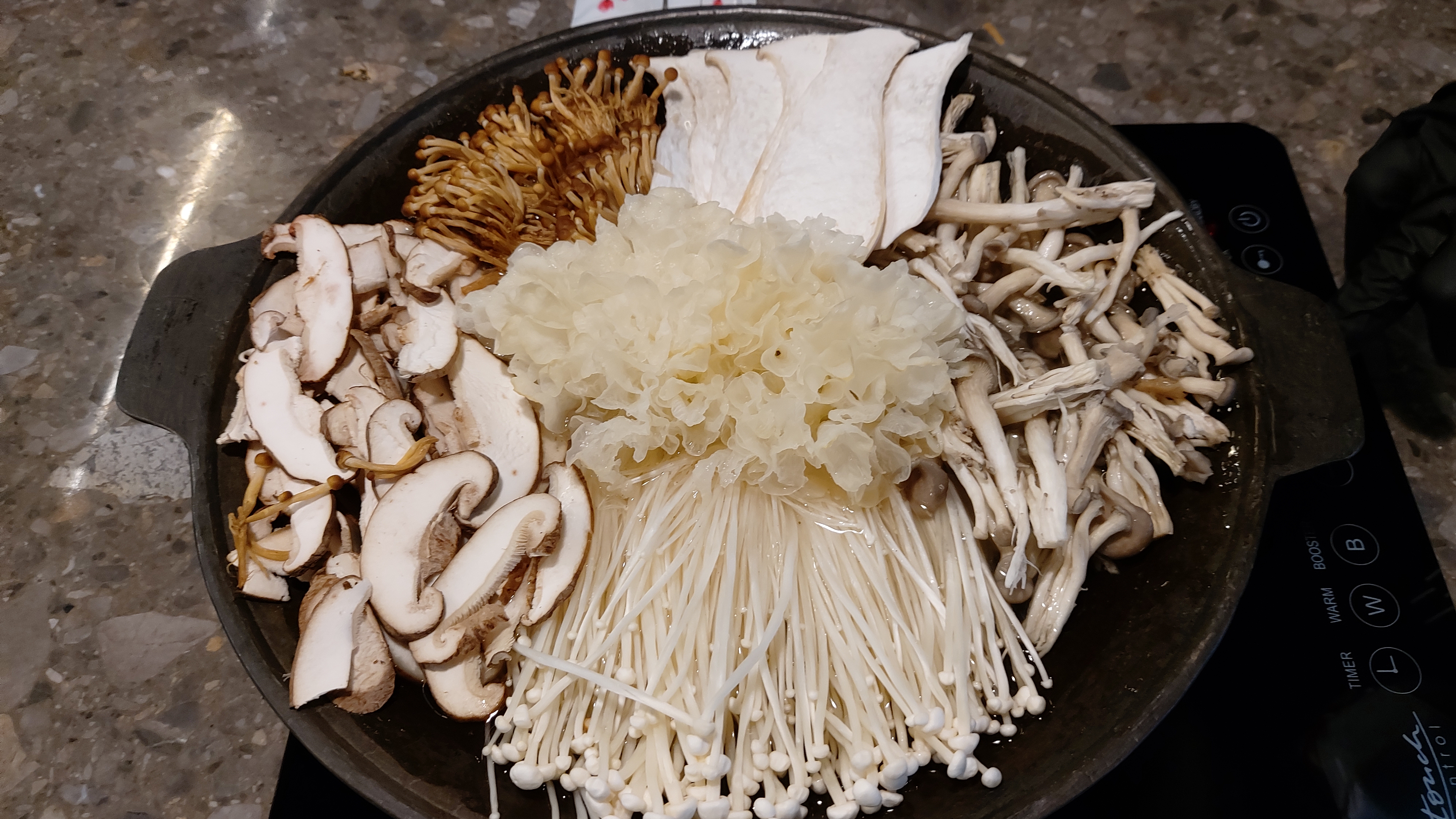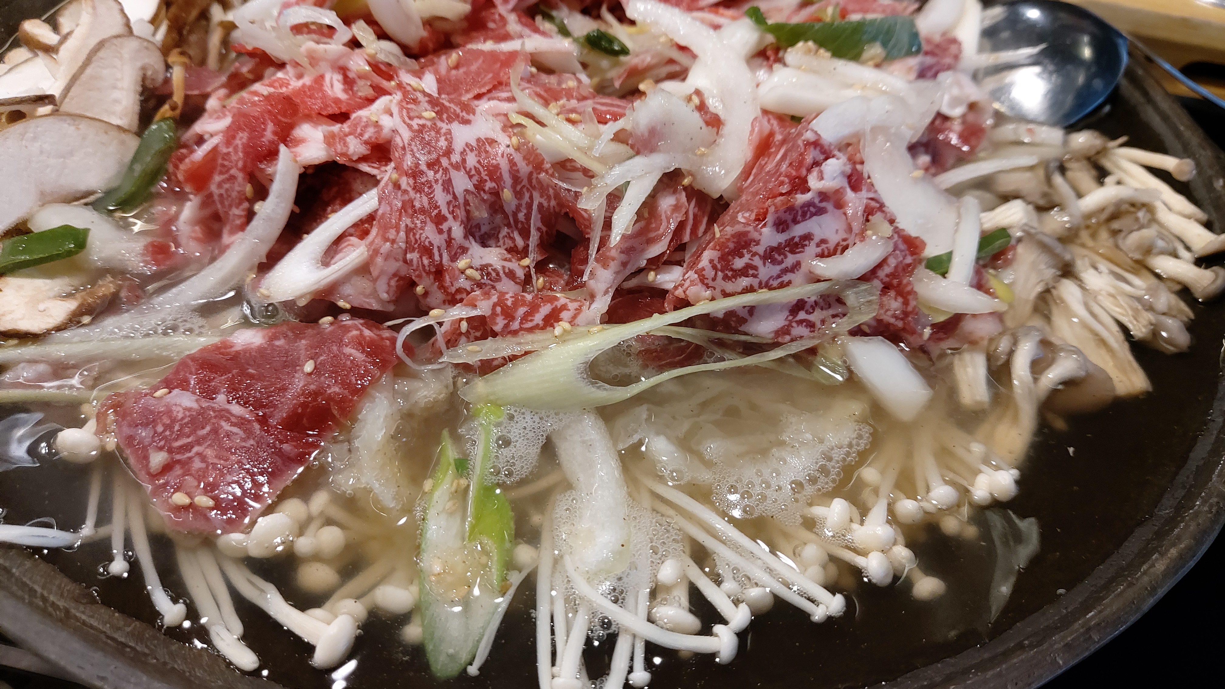 전골냄비에 버섯과 육수가 들어 있고 소고기는 별도로 나옵니다.