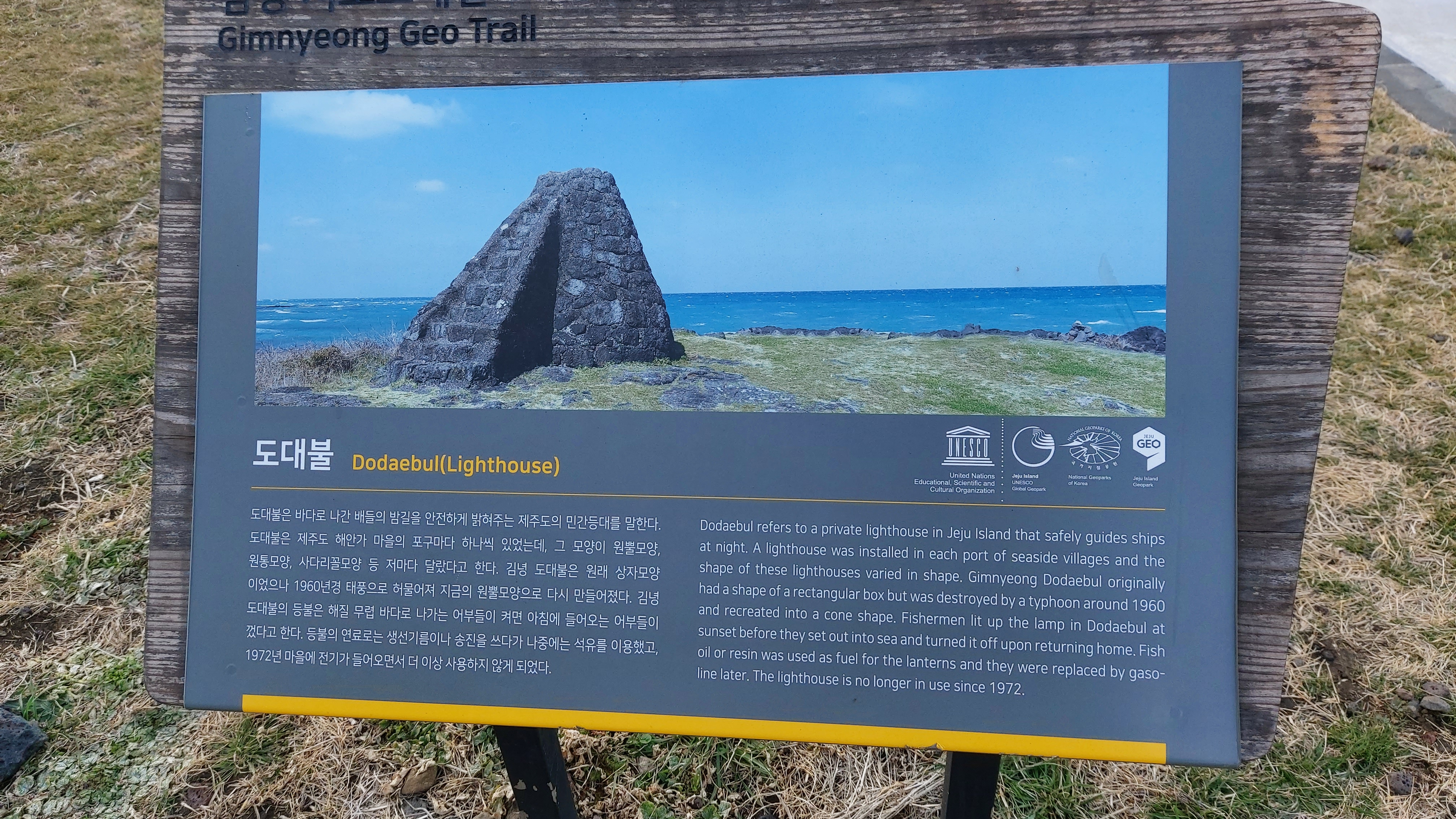 김녕 도대불은 원래 상자 모양이었으나 1960년경 태풍으로 허물어져 지금의 원뿔 모양으로 다시 만들었다고 합니다.