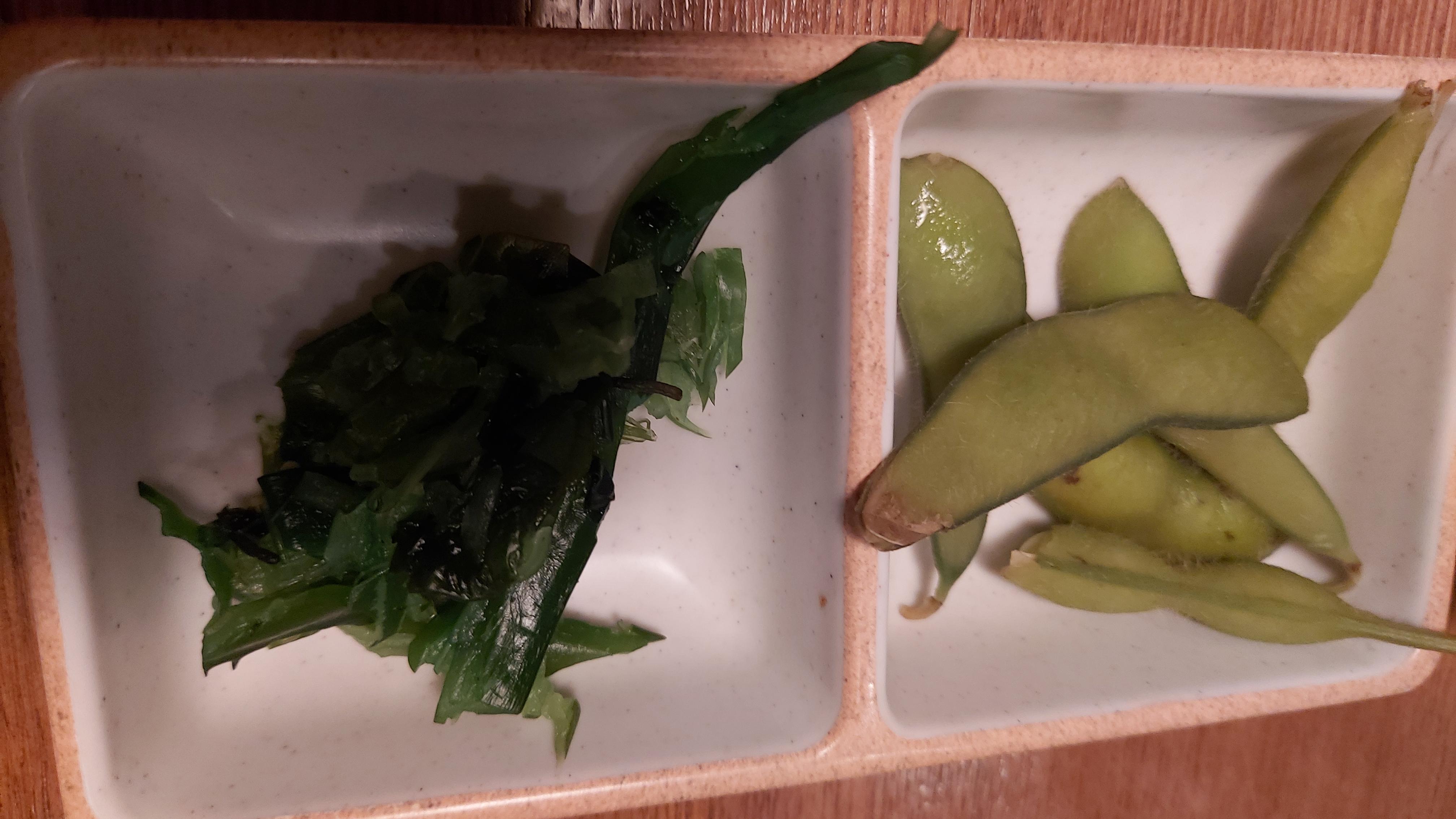 기본 안주로는 콩과 미역 데친 게 나오는군요.