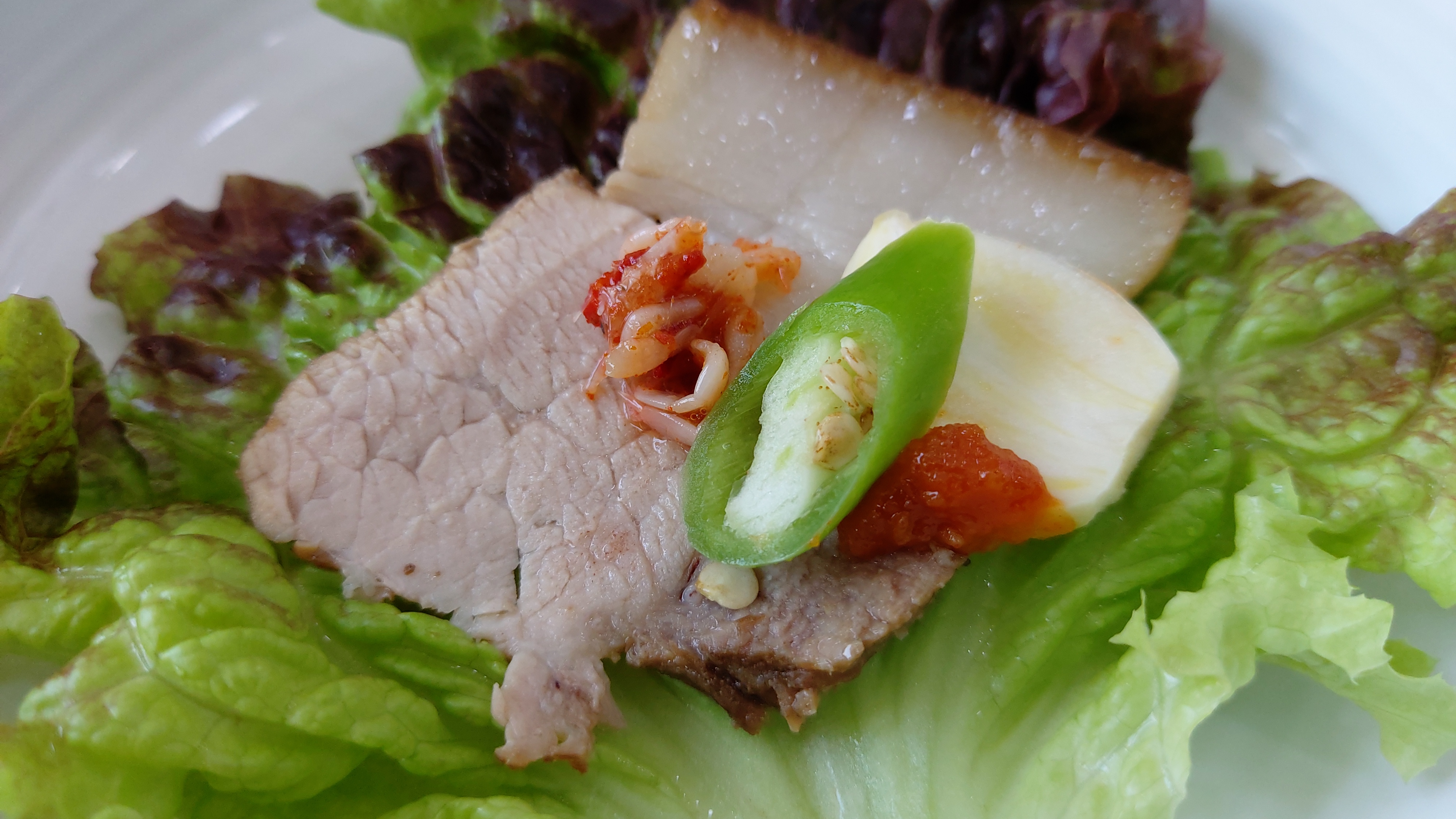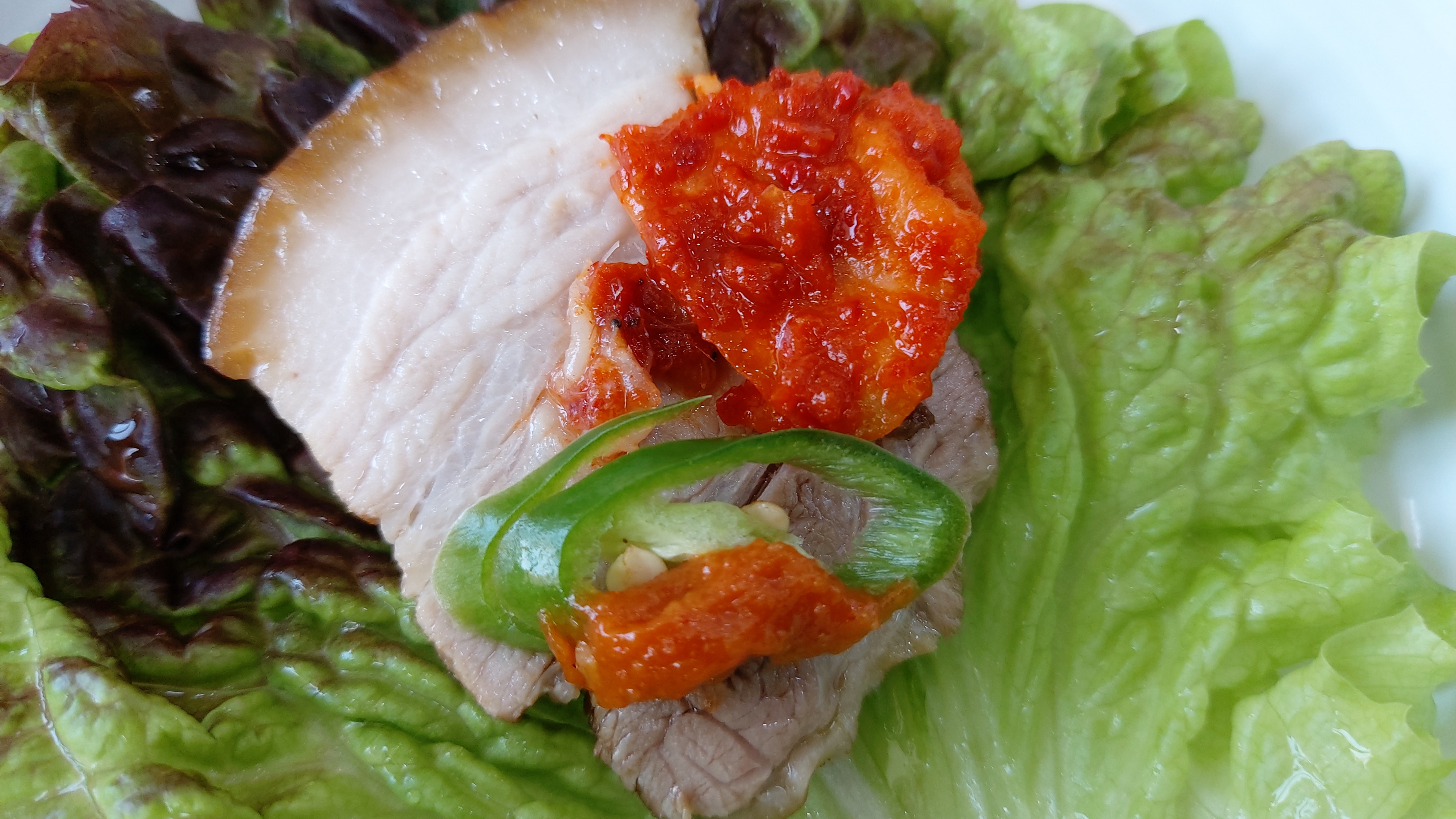 잡내 없이 잘 삶아진 돼지고기 편육에 상추, 명이, 월남고추절임, 오이, 무말랭이무침,