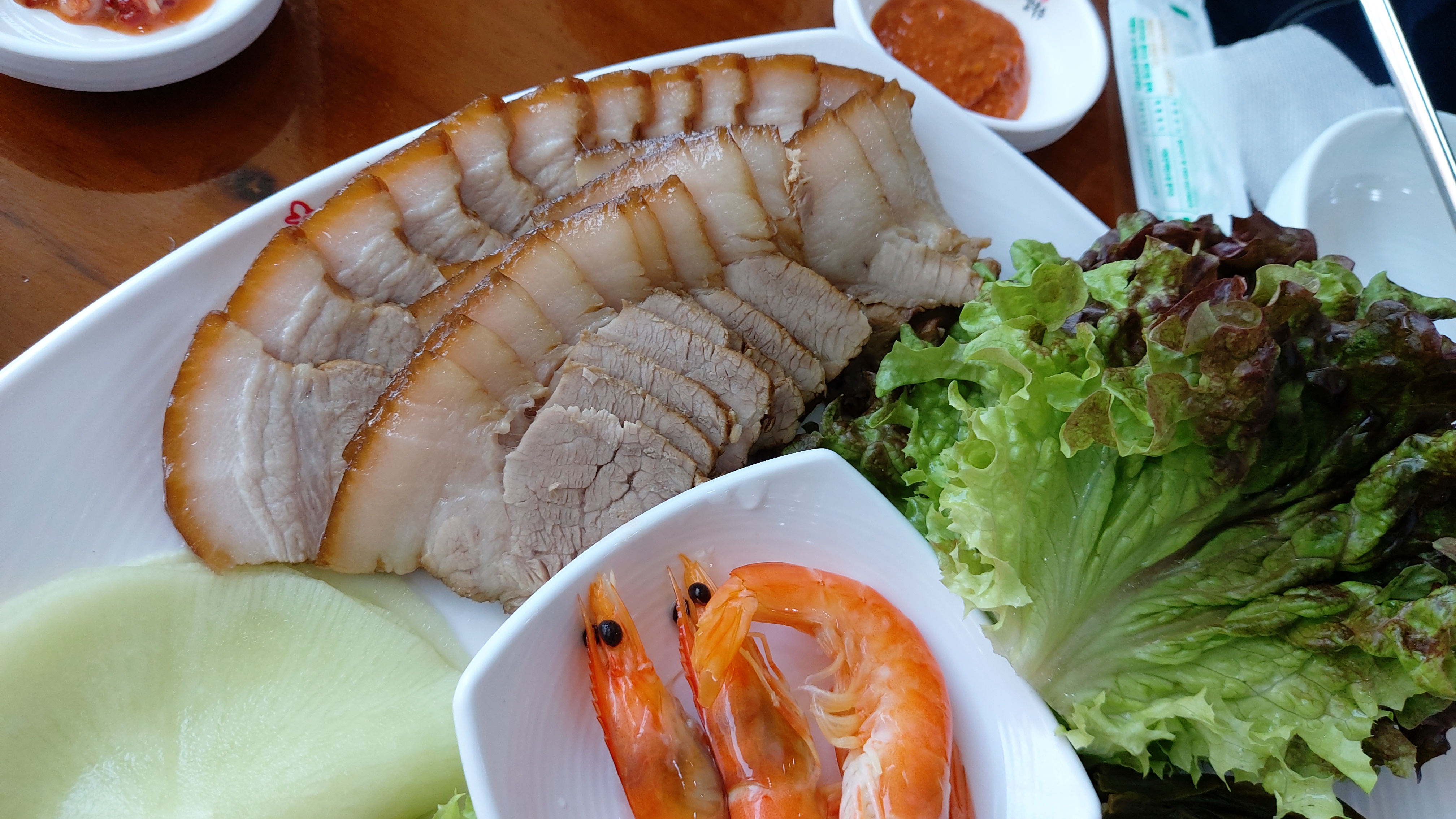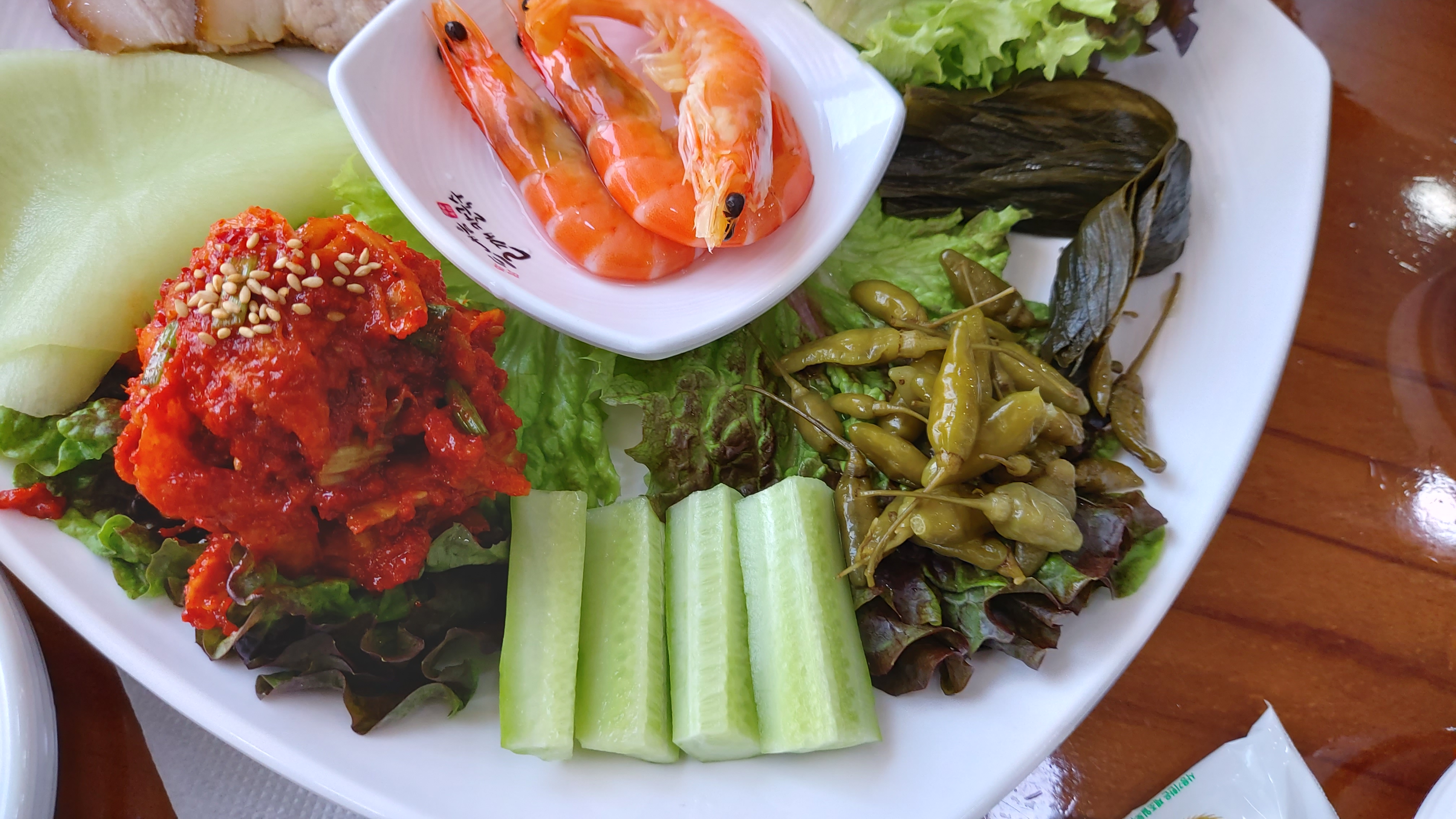 무쌈 등이 화려하게 배열되어 있고 특이하게도 중앙에 삶은 새우도 있더군요.