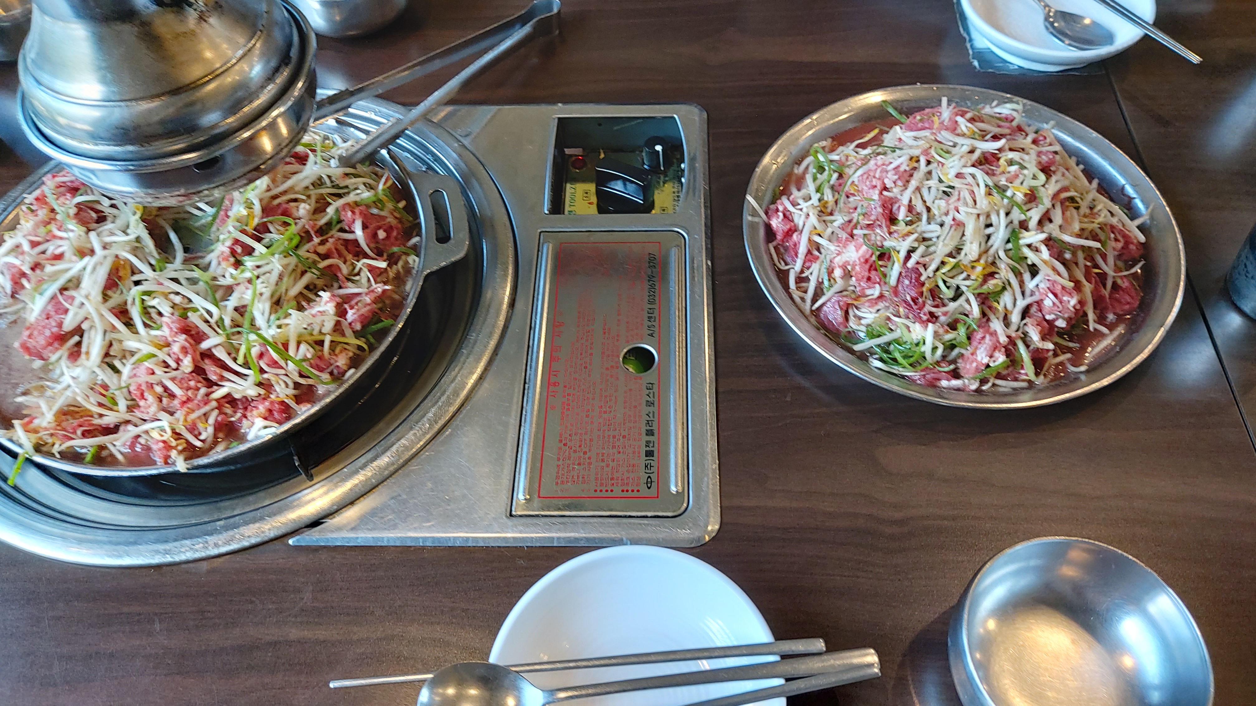 얇게 썬 소고기에 파채와 숙주가 듬뿍 올라가 있는 데 그냥 불판에 얹고 구우면 됩니다.
