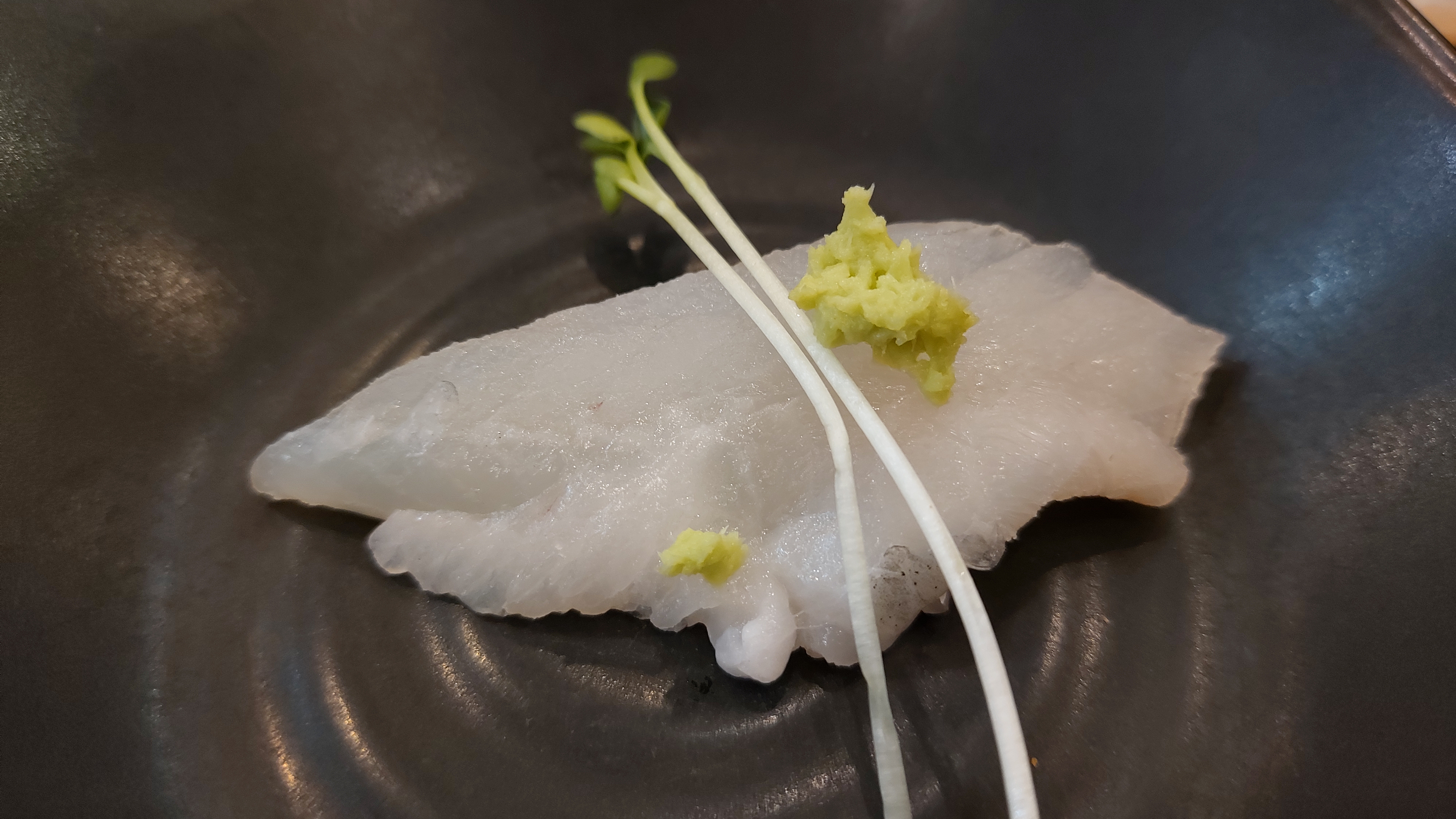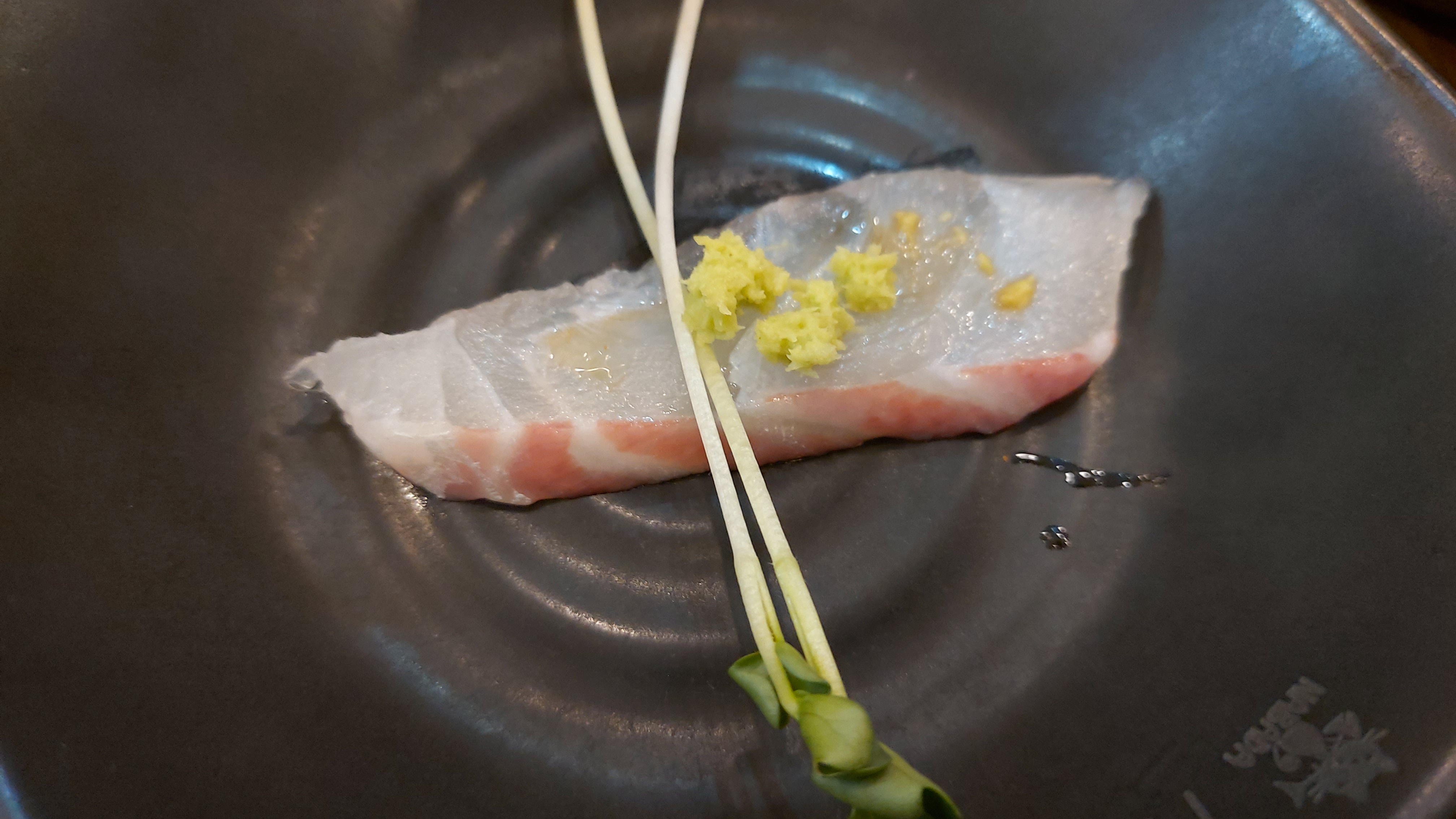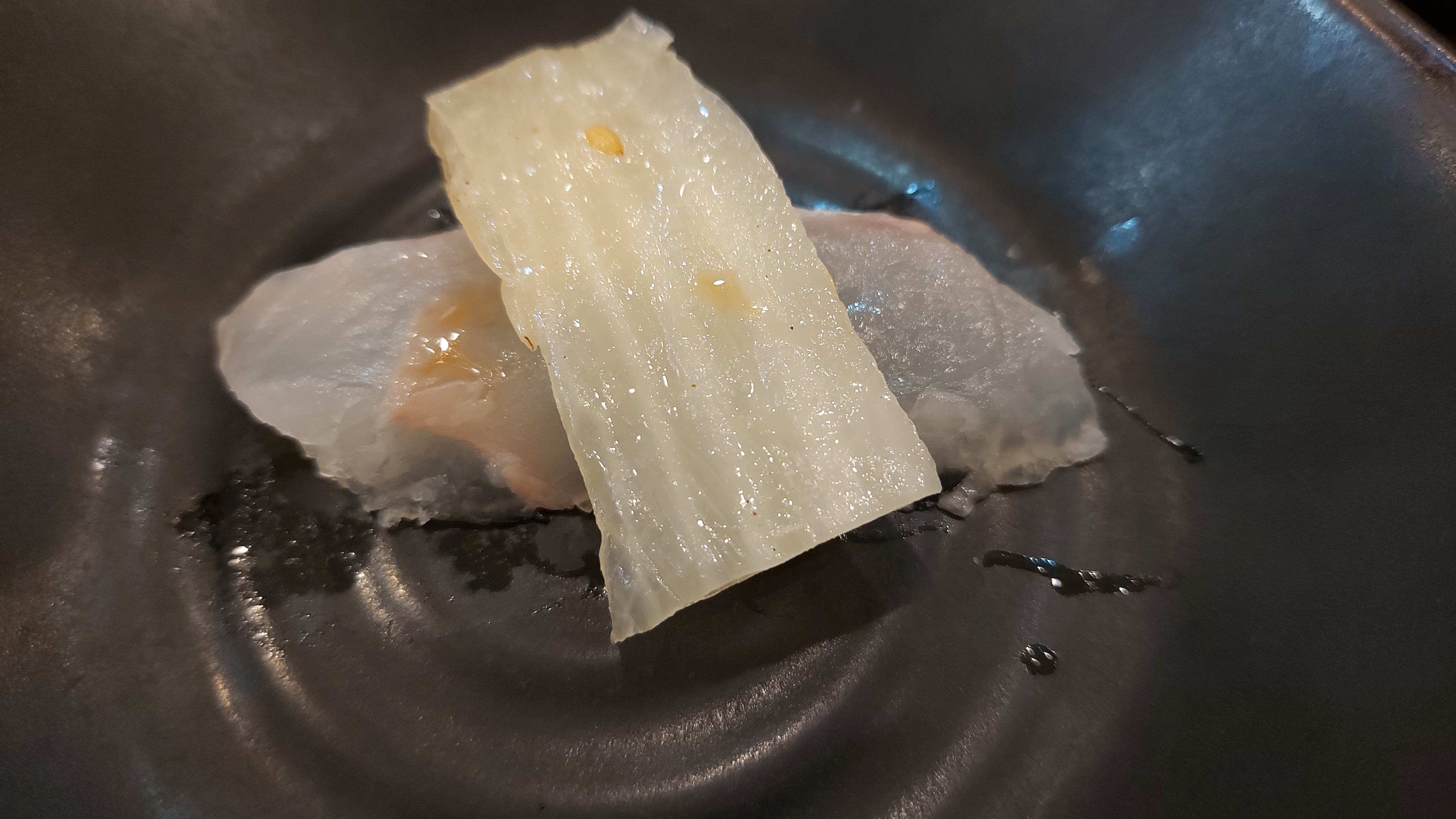 역시 스끼다시용 접시만큼 큰 접시에 옥돌을 올려놓고 그 위에 생선회를 얹어 내왔네요.