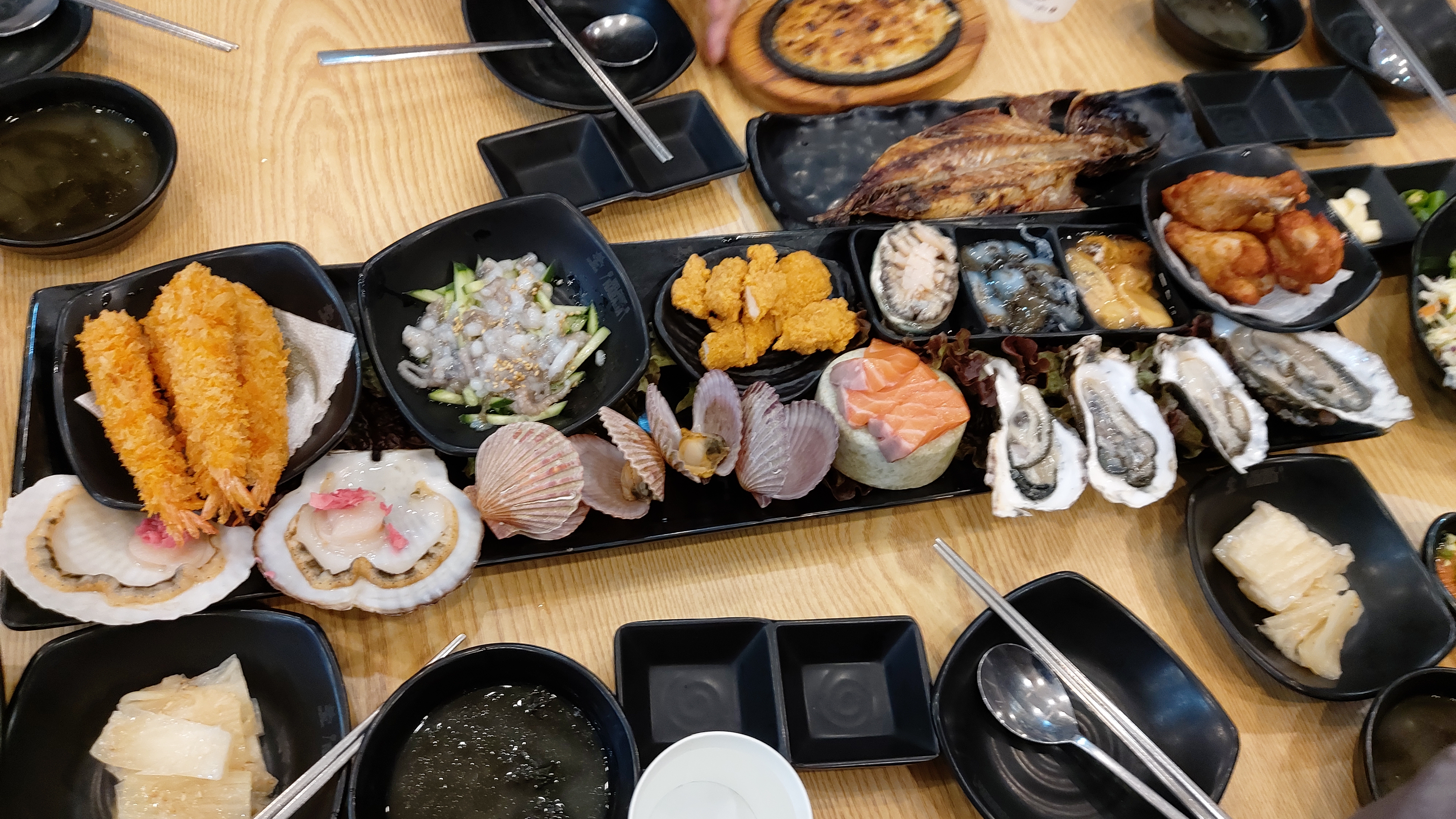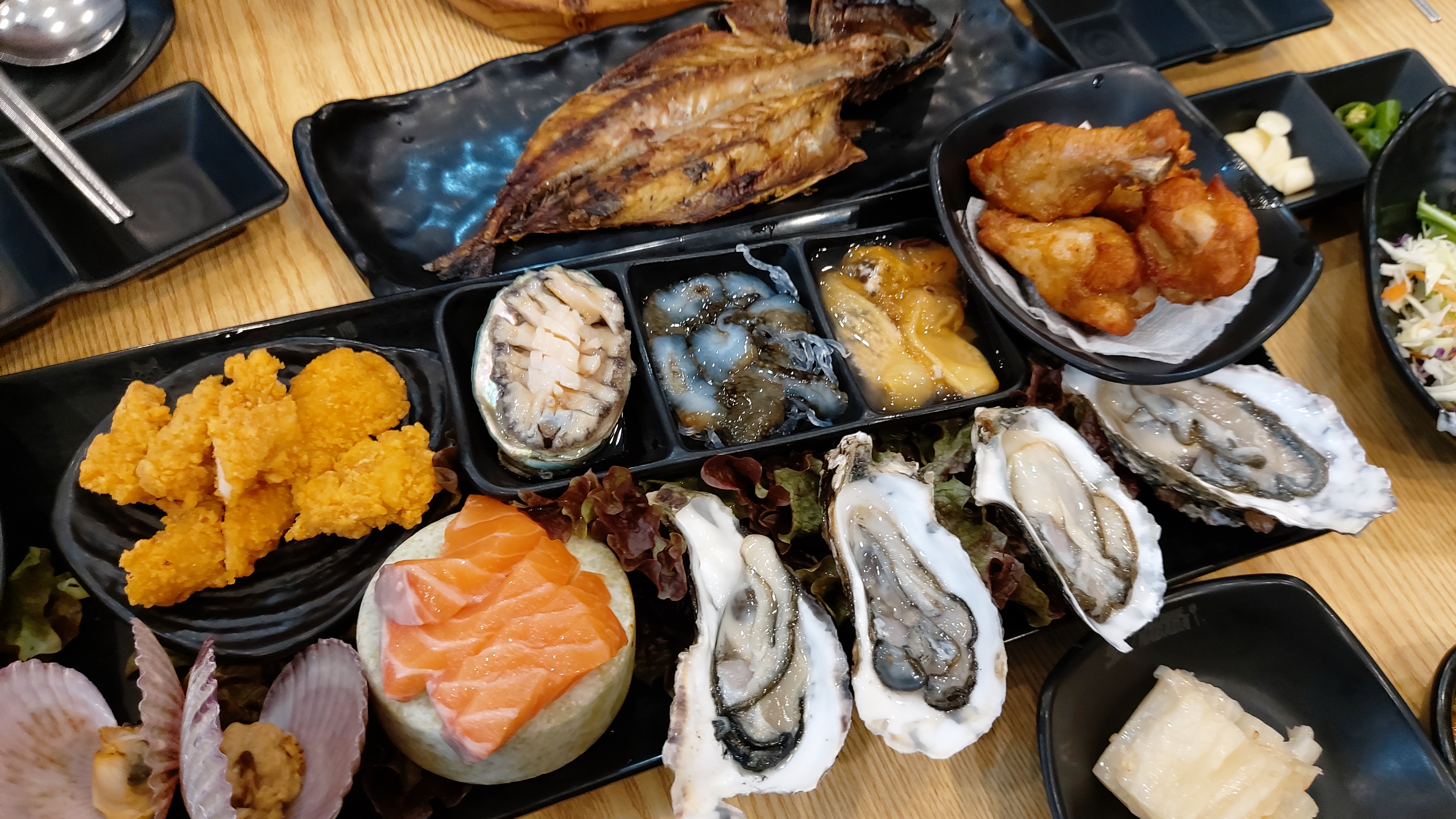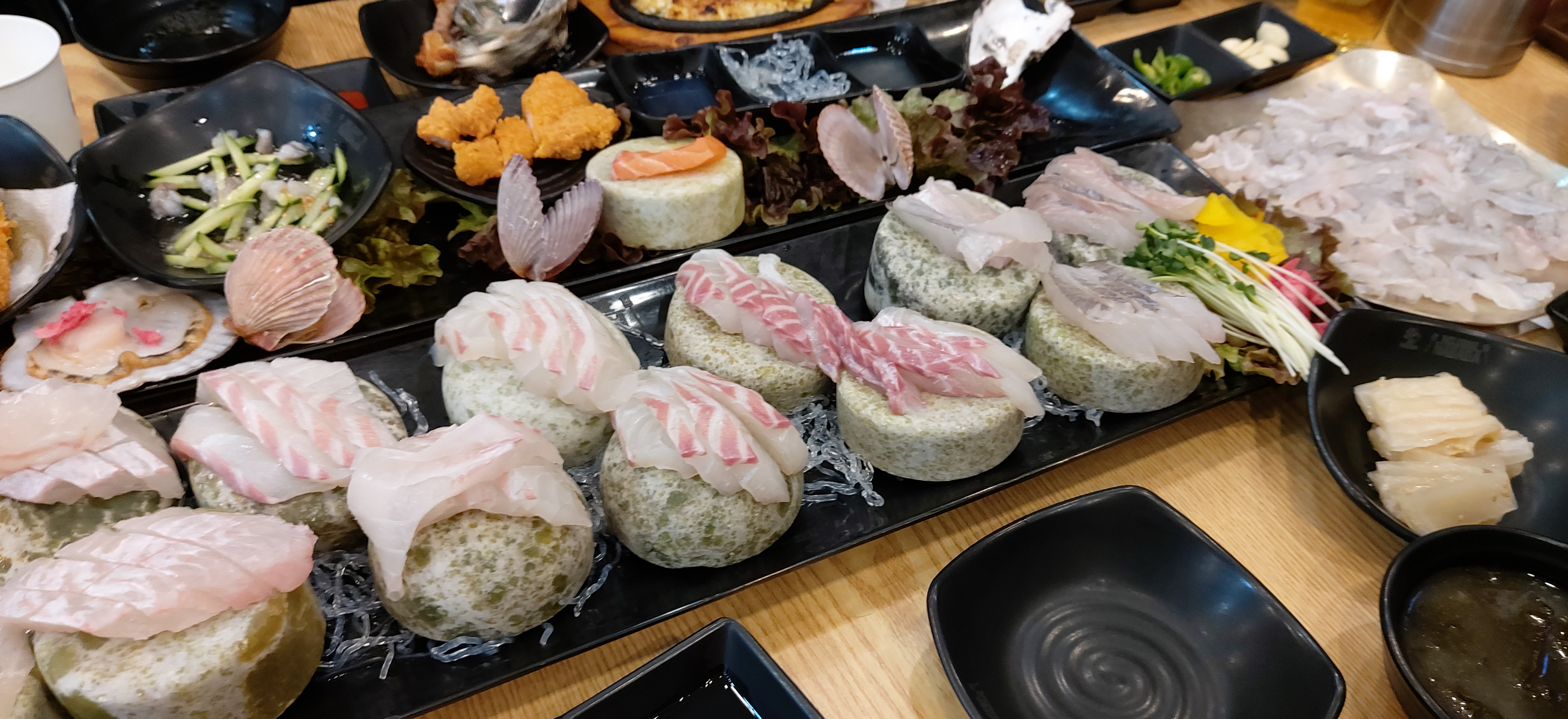 산낙지, 해삼, 전복, 멍게, 연어, 가리비. 석화 등의 조개류, 새우튀김과 닭봉 튀김, 닭다리 튀김 등 다양합니다.