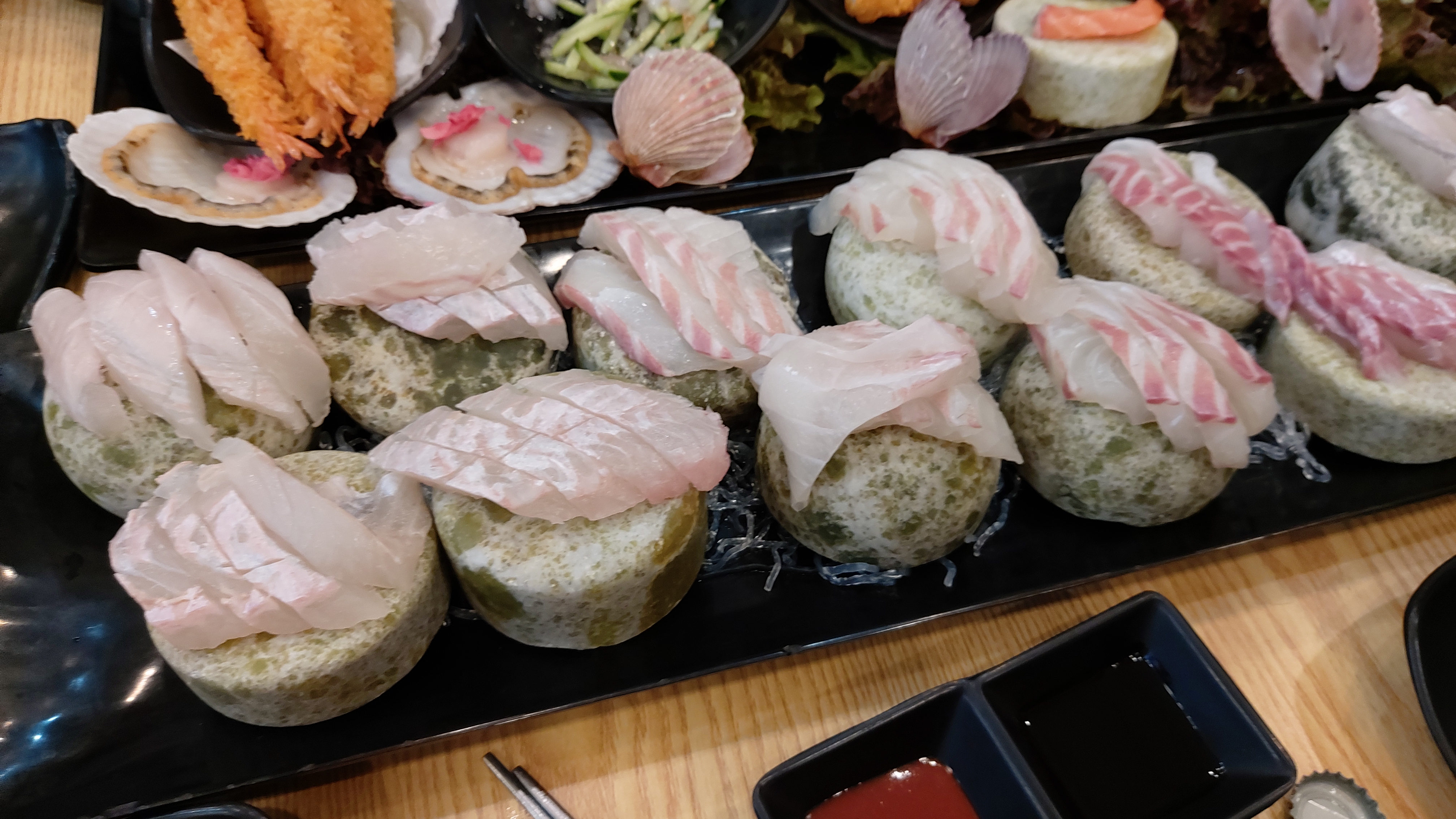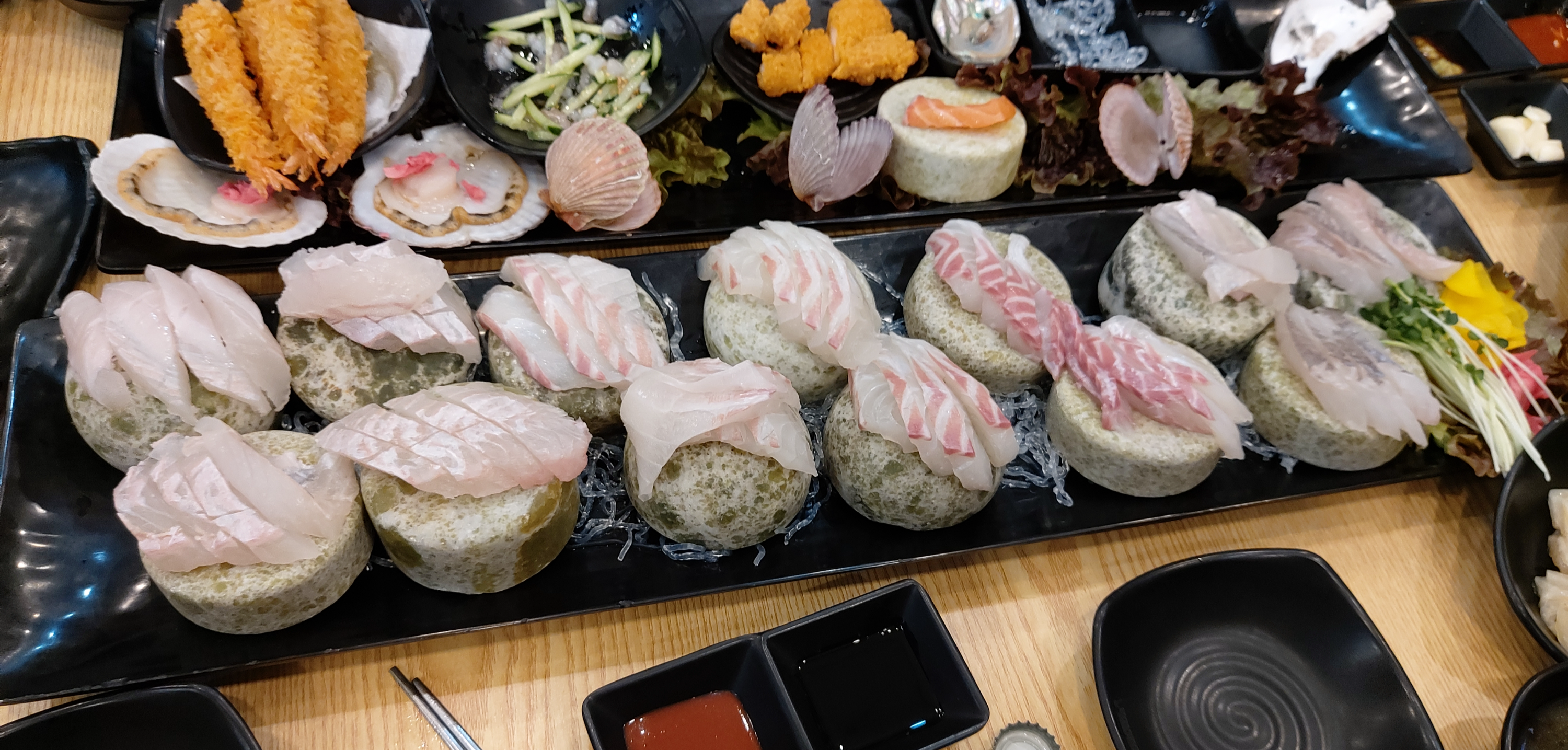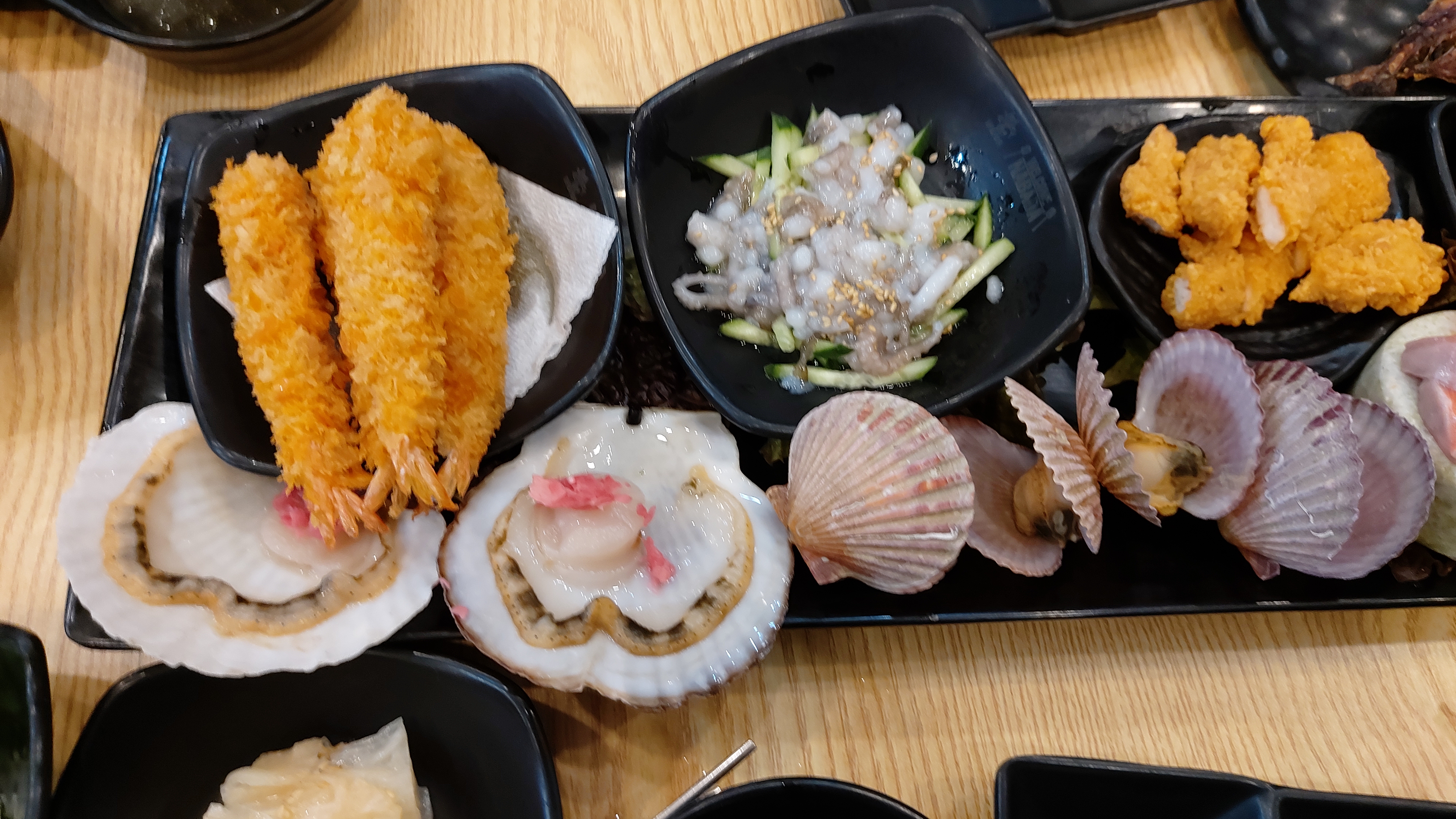 산낙지, 해삼, 전복, 멍게, 연어, 가리비. 석화 등의 조개류, 새우튀김과 닭봉 튀김, 닭다리 튀김 등 다양합니다.