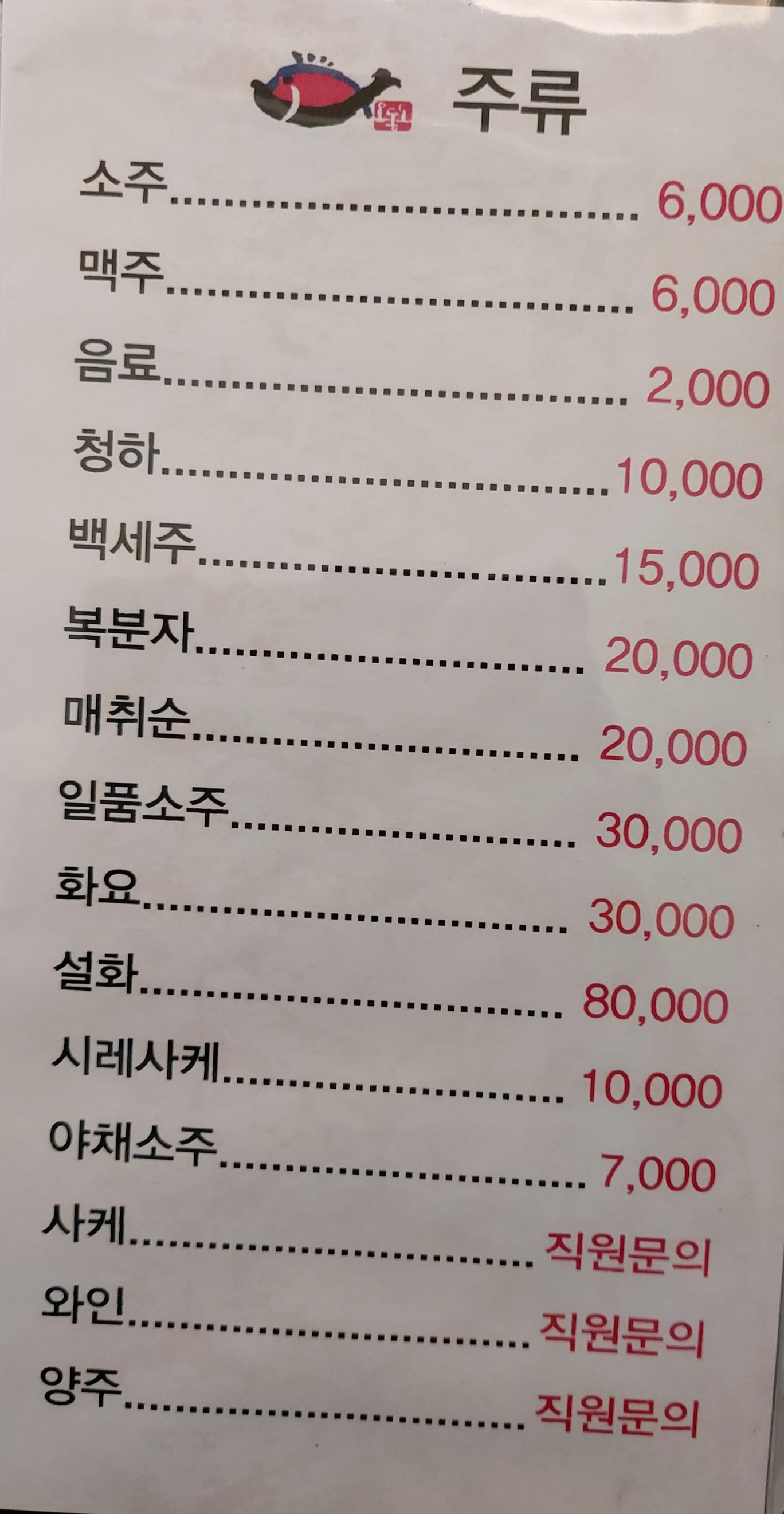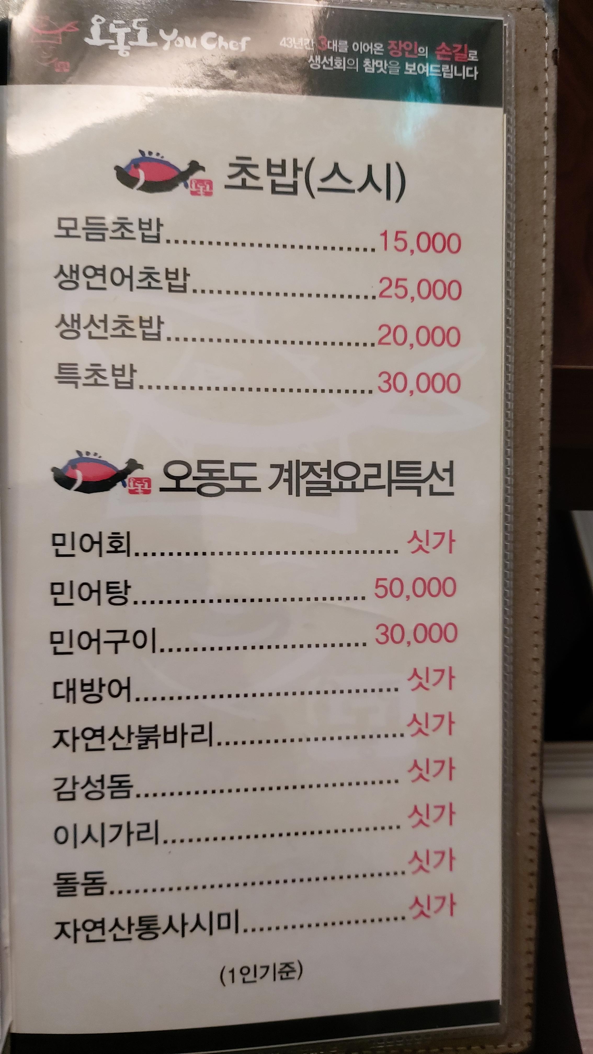 김포 오동도의 차림표입니다.