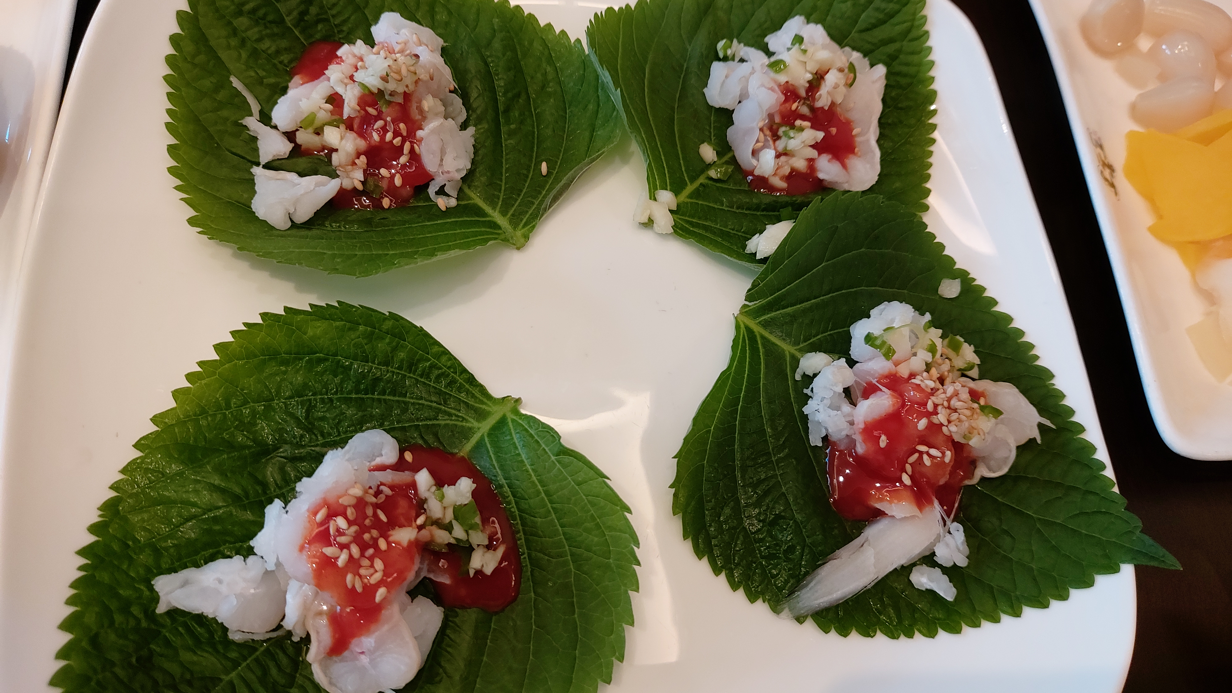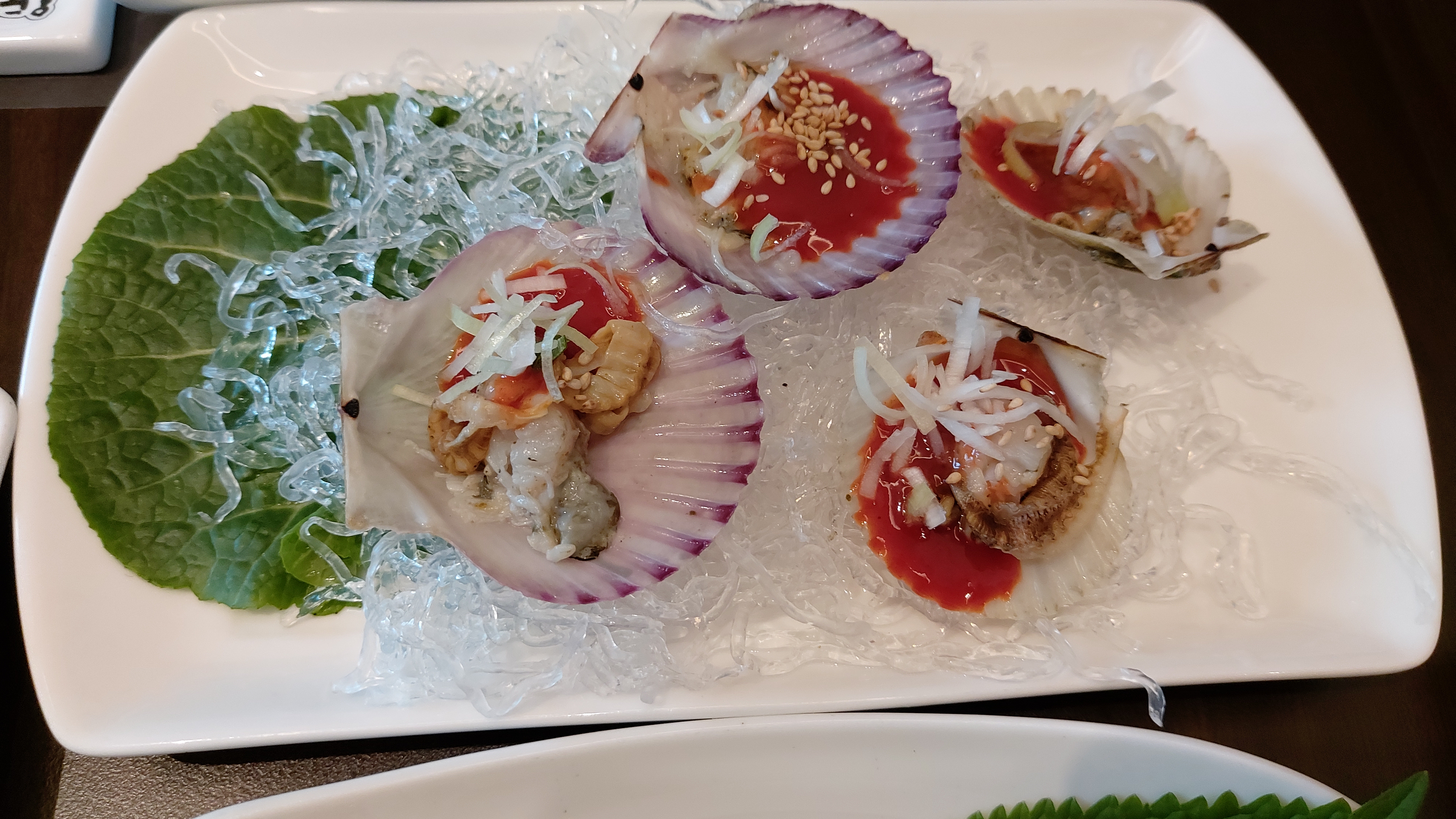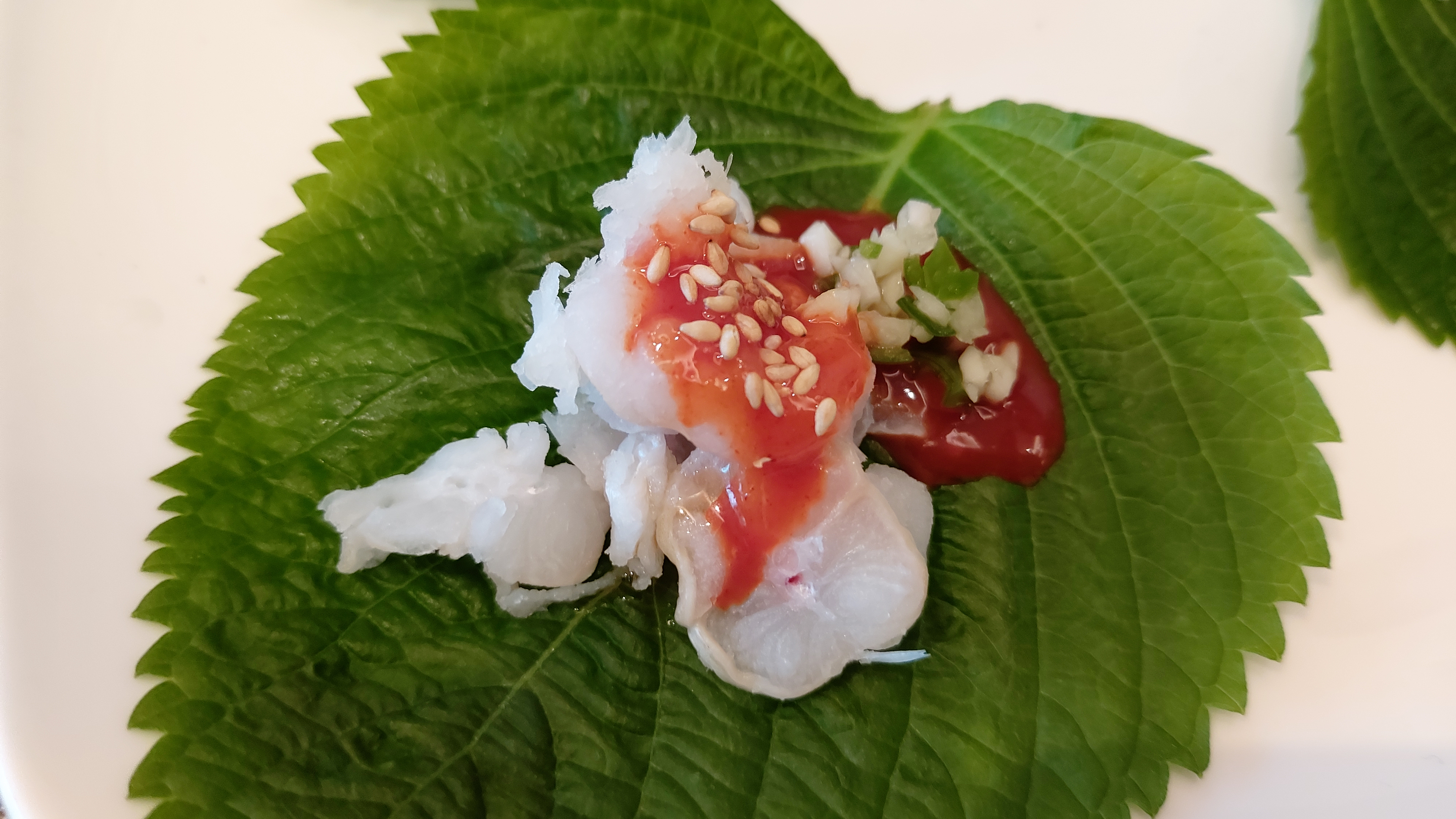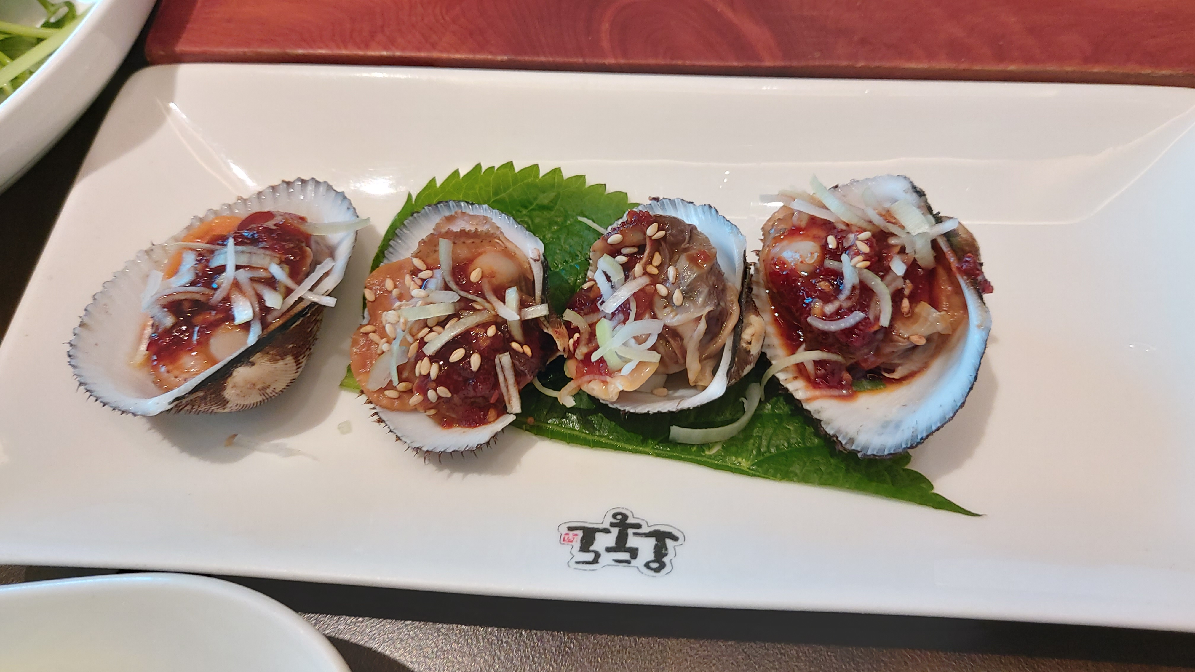 이어서 석화, 가리비, 피꼬막(왕꼬막), 생연어 등이 나오고 깻잎 위에 아나고(붕장어)회도 나오네요.
