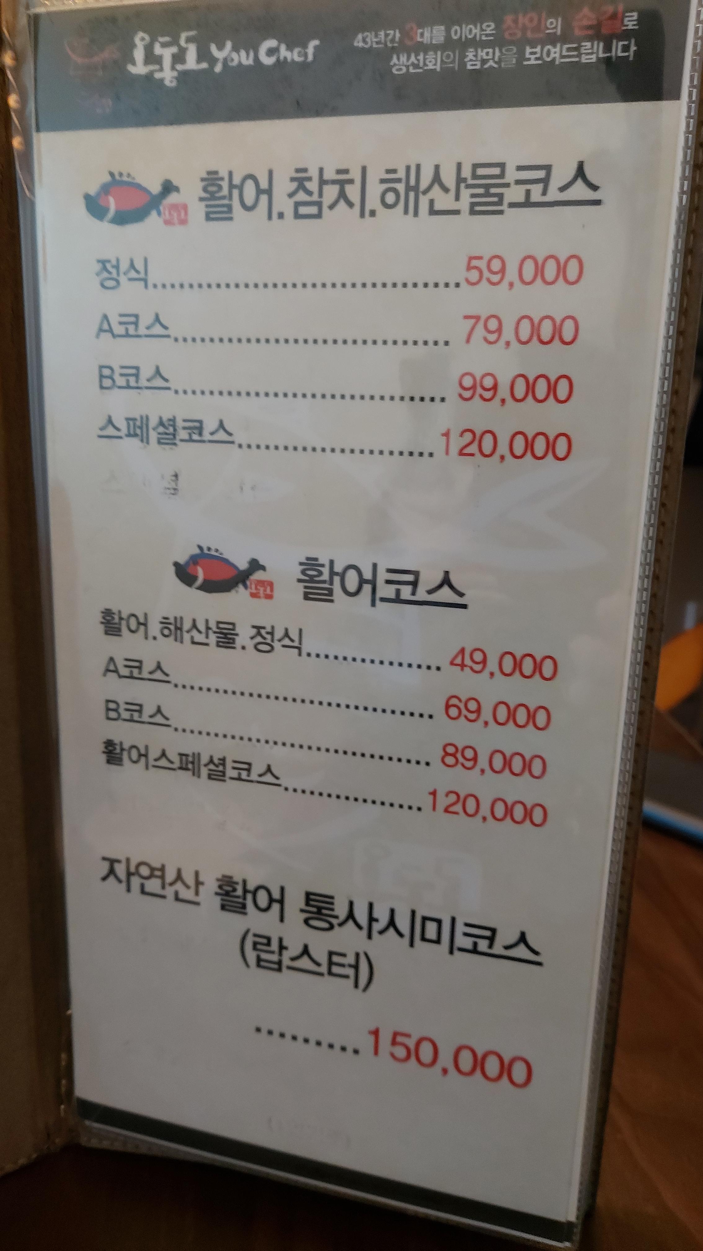 점심에는 점심특선(30,000원)이 있고 그 외 코스요리는 활어해산물정식(49,000원)부터 시작합니다.