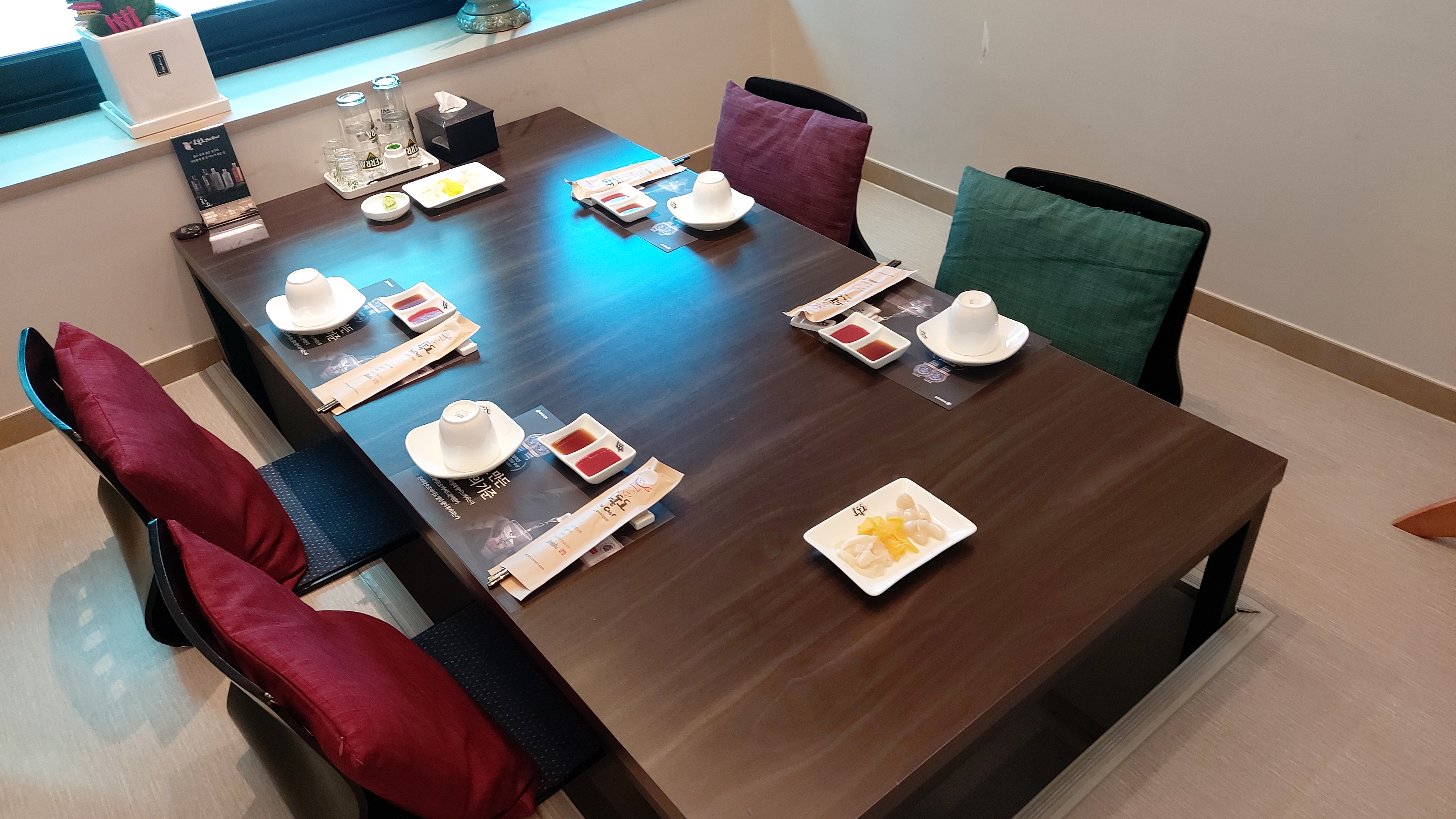 온돌처럼 보이지만 탁자 밑으로 속이 파여 있어 다리를 쭉 피고 앉을 수 있어 편리하고 좋습니다.