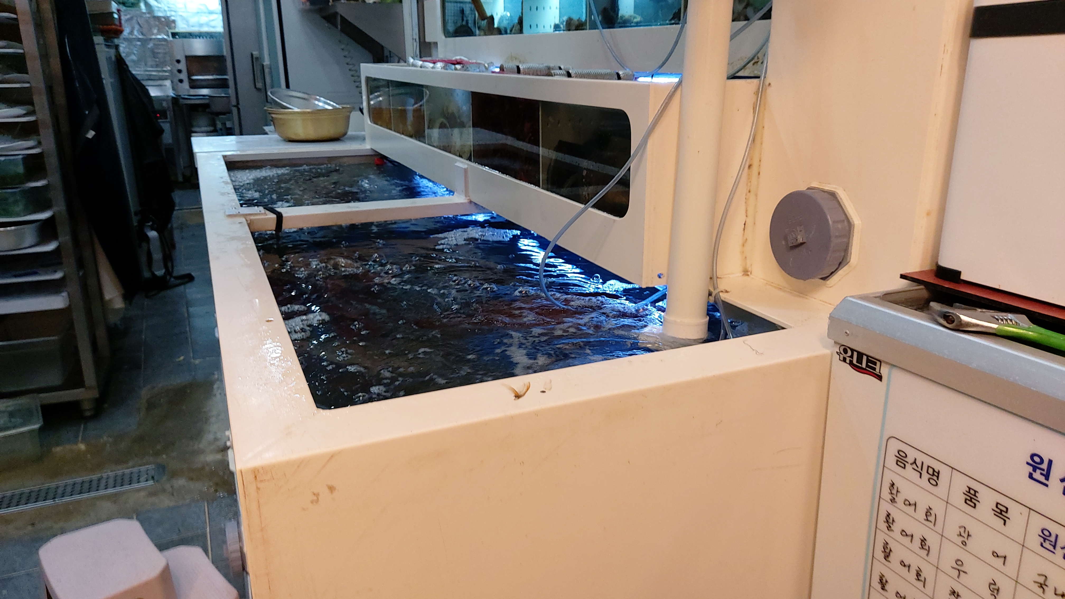 나오며 주방을 들여다보니 주방 안에 큼직한 수족관이 보이는군요.
