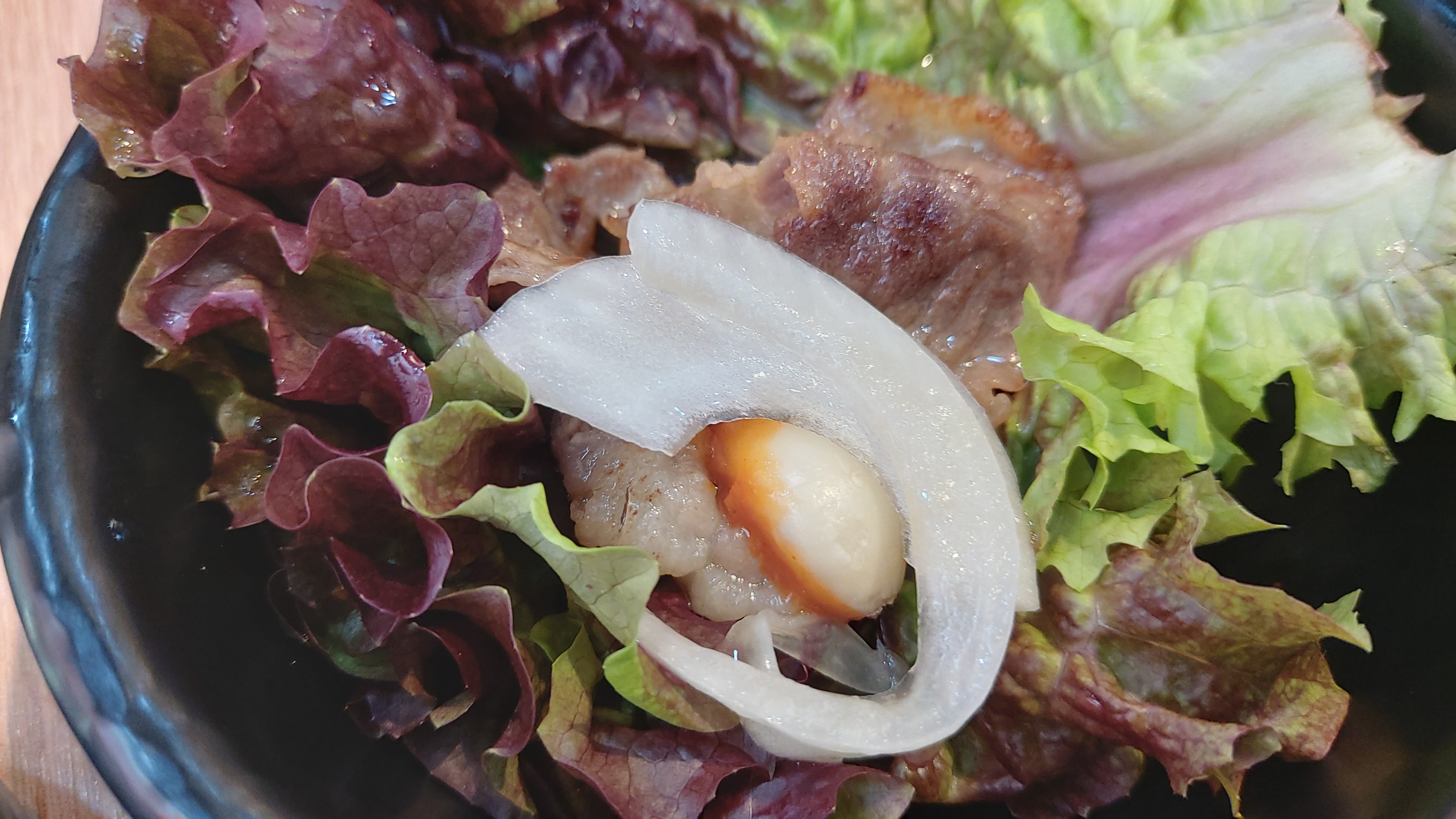 새송이버섯 위에 살포시 얹혀 있는 것은 서비스로 나온 수제 떡갈비 한 점이고요.