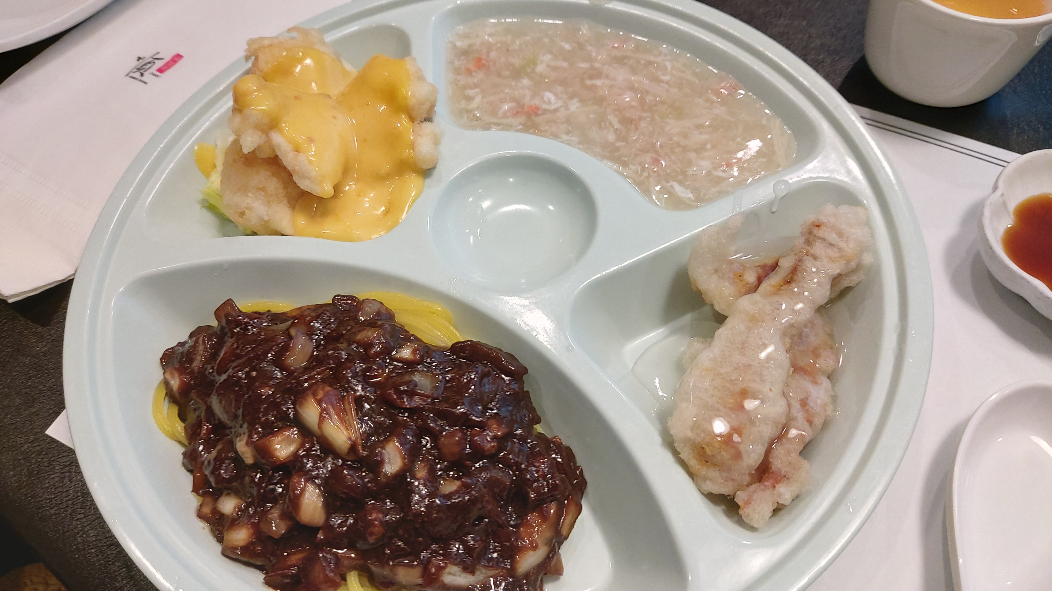 탕수육에 크림 새우, 게살 수프에 짜장면이 나온 것 같군요.
