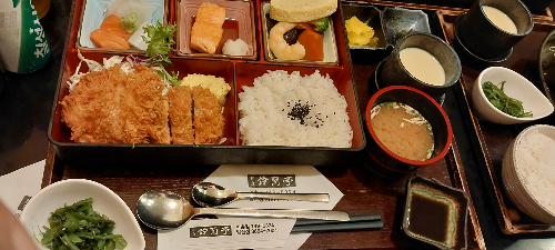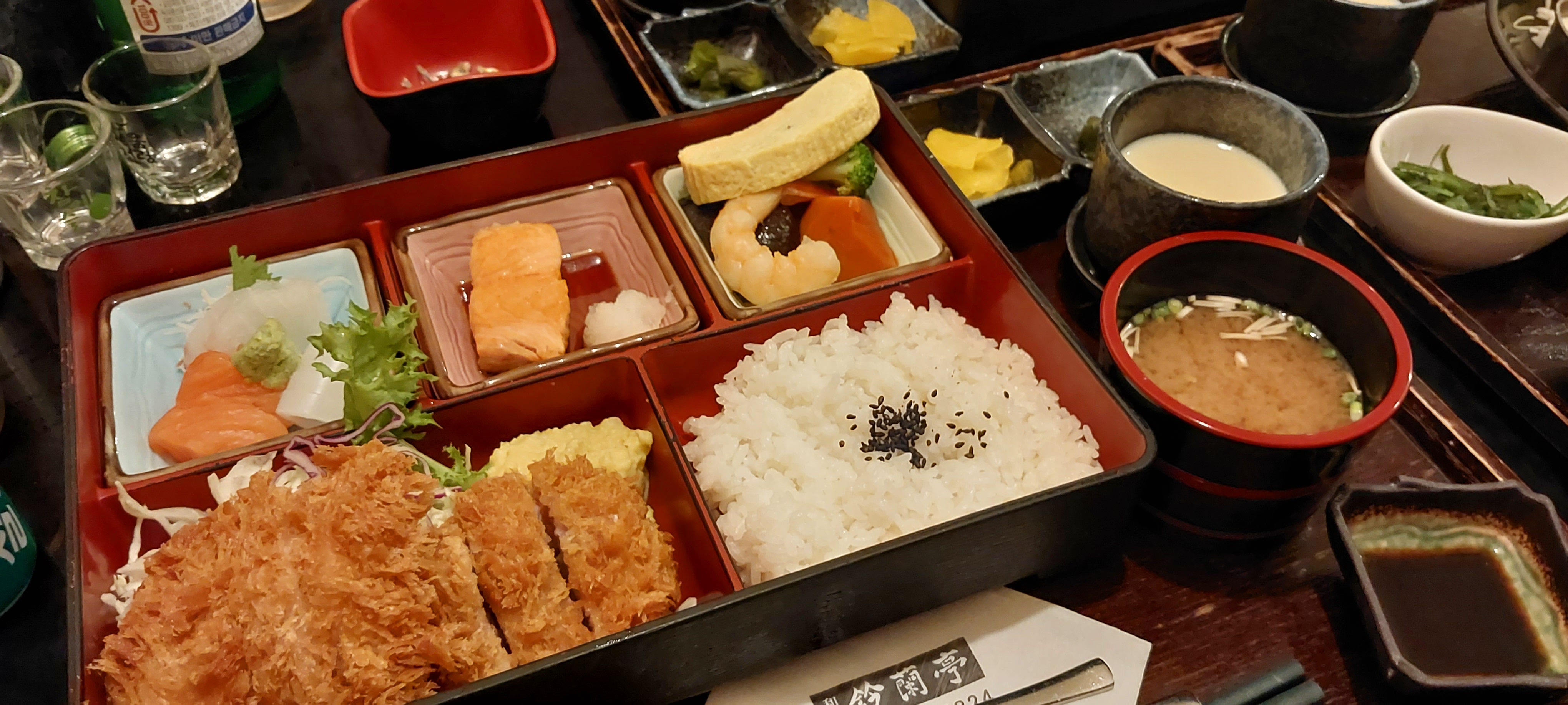 고바찌, 모둠가스(새우 2p, 생선 & 안심까스), 야채, 자왕무시, 츠케모노, 밥, 된장국으로 구성되어 있습니다.