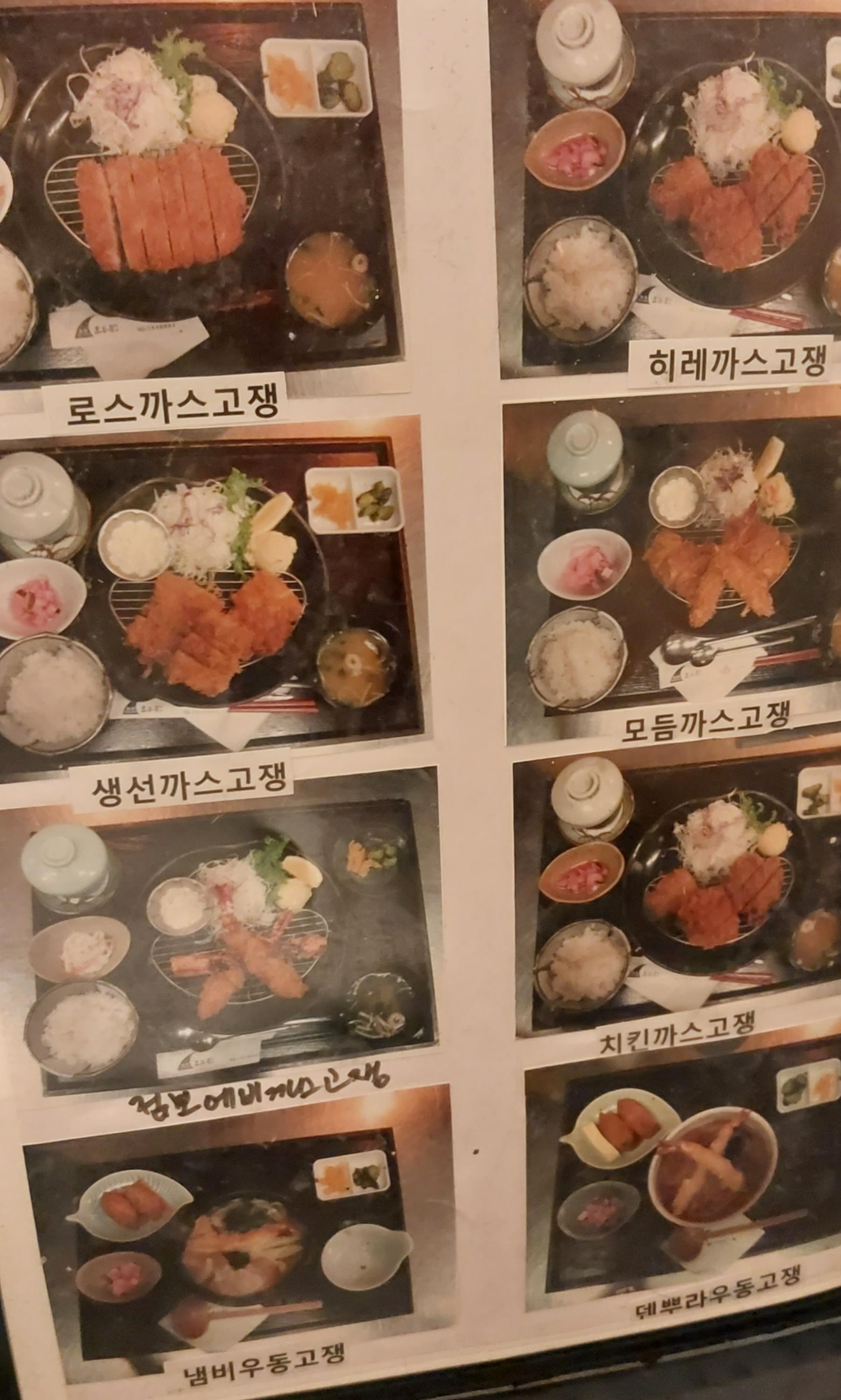 고바찌(한 가지만 소량으로 제공되는 전채요리), 사시미, 조림, 연어구이, 안심까스, 치킨까스, 계란말이,