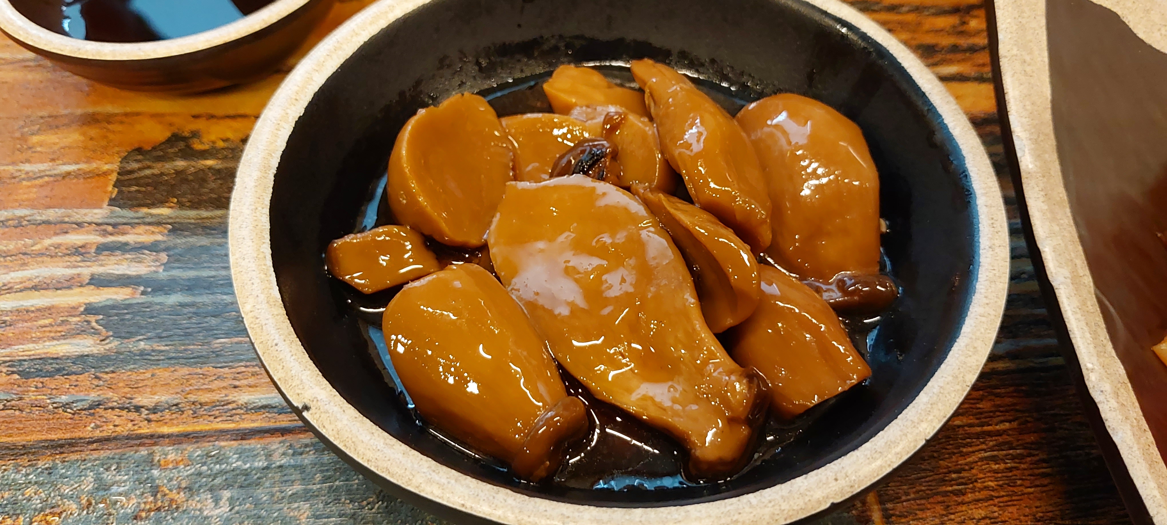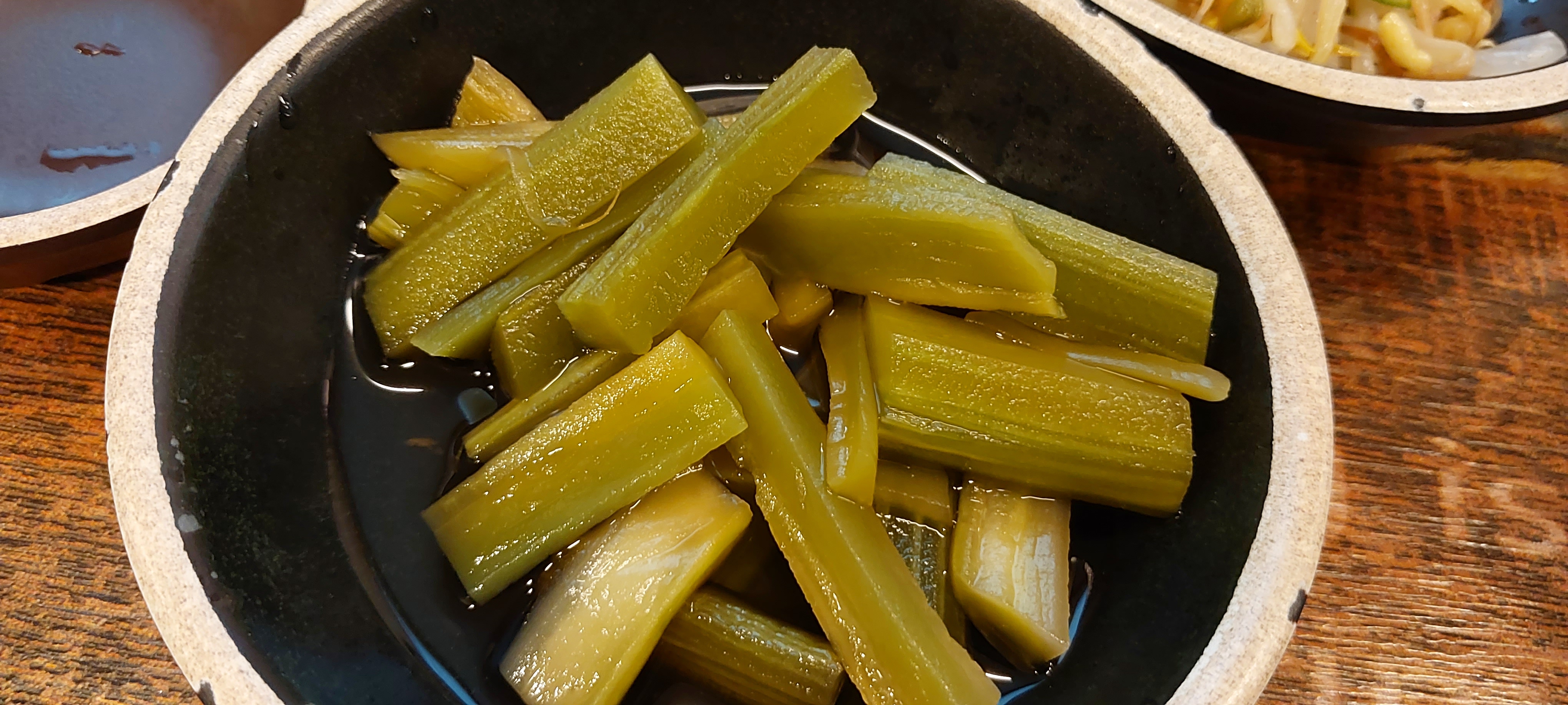 아삭하고 꼬들꼬들한 궁채, 버섯과 마늘 조림?, 기름에 살짝 볶은 묵은지 등 좋으네요.