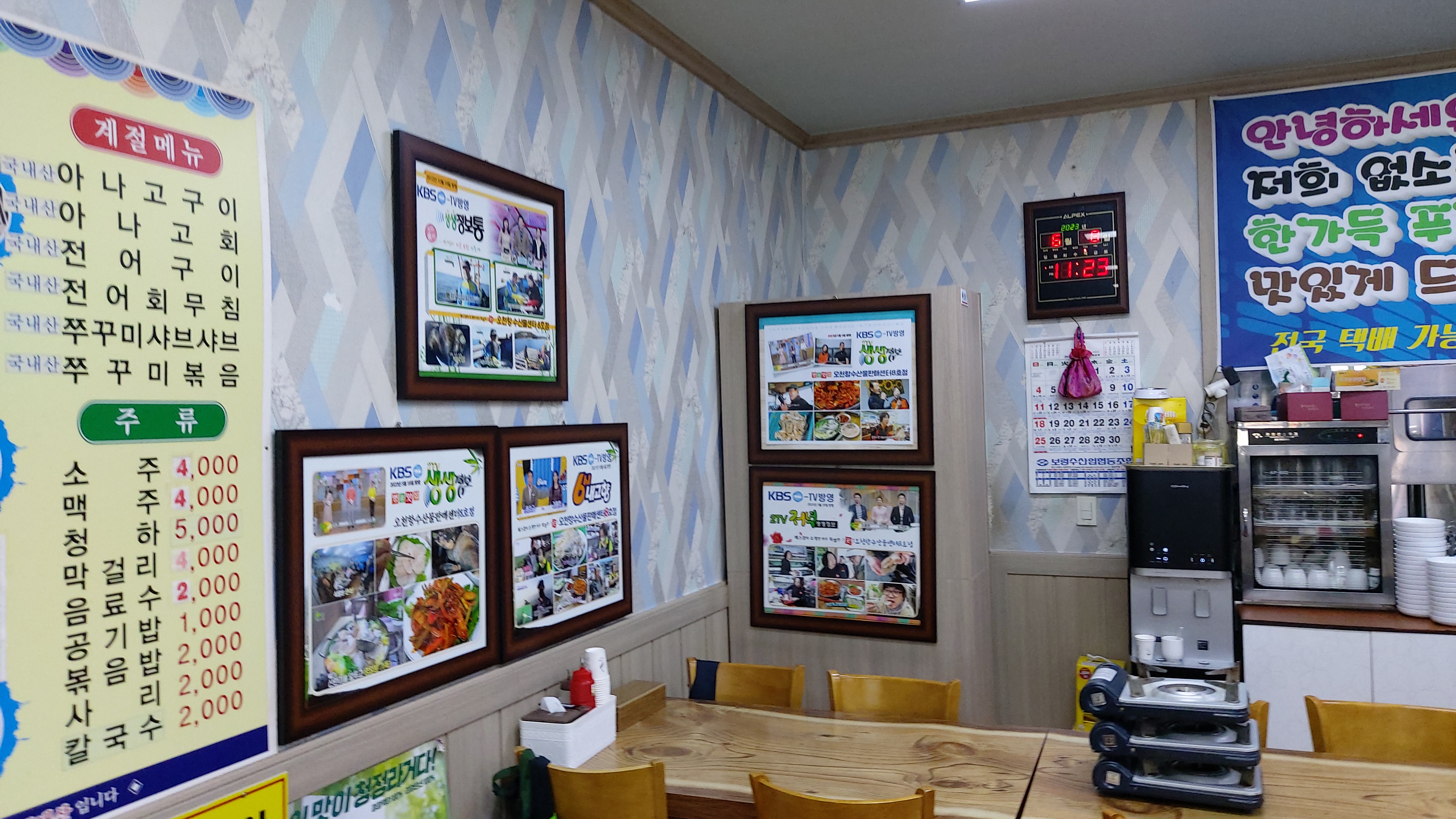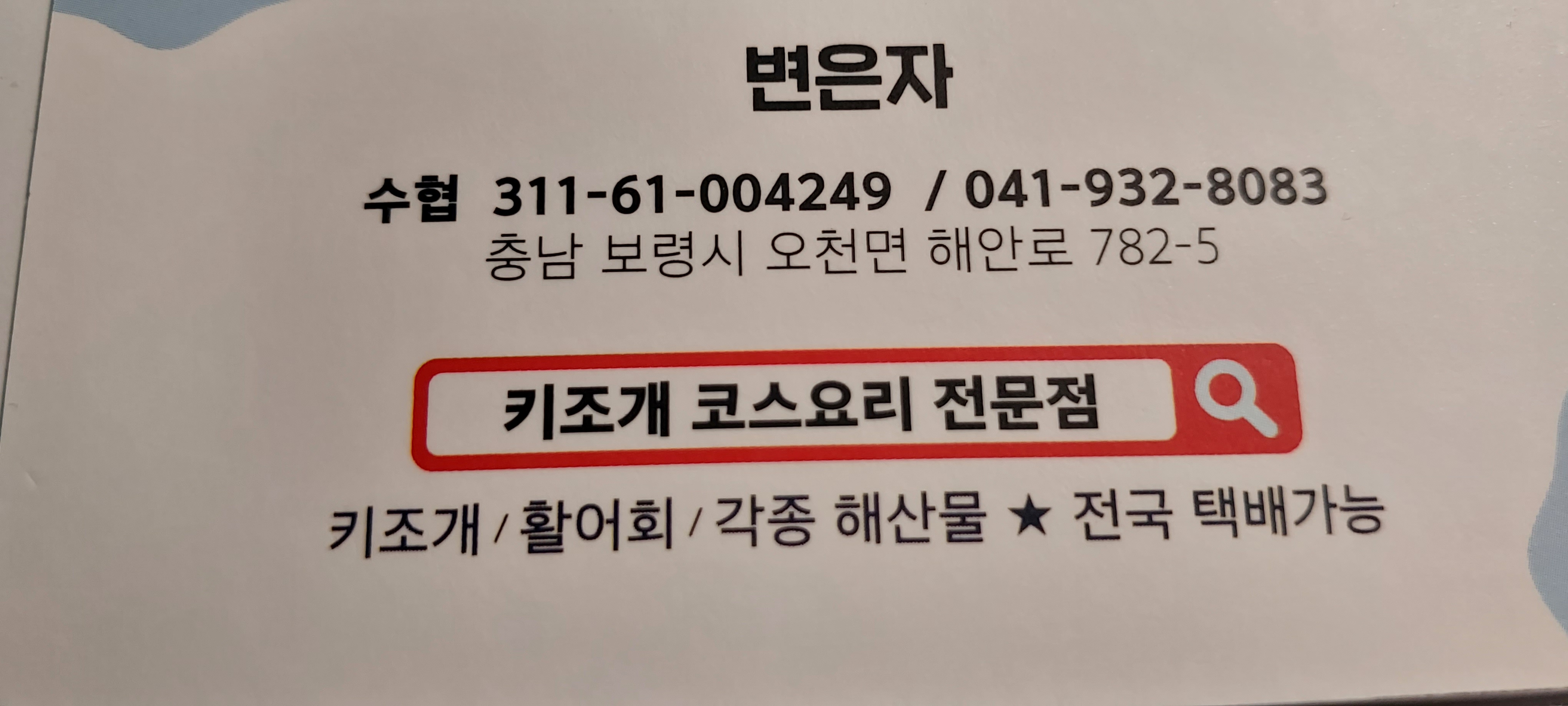 식당 이름은 오천항수산물센터 8호점, 자연산 키조개 전문점입니다.