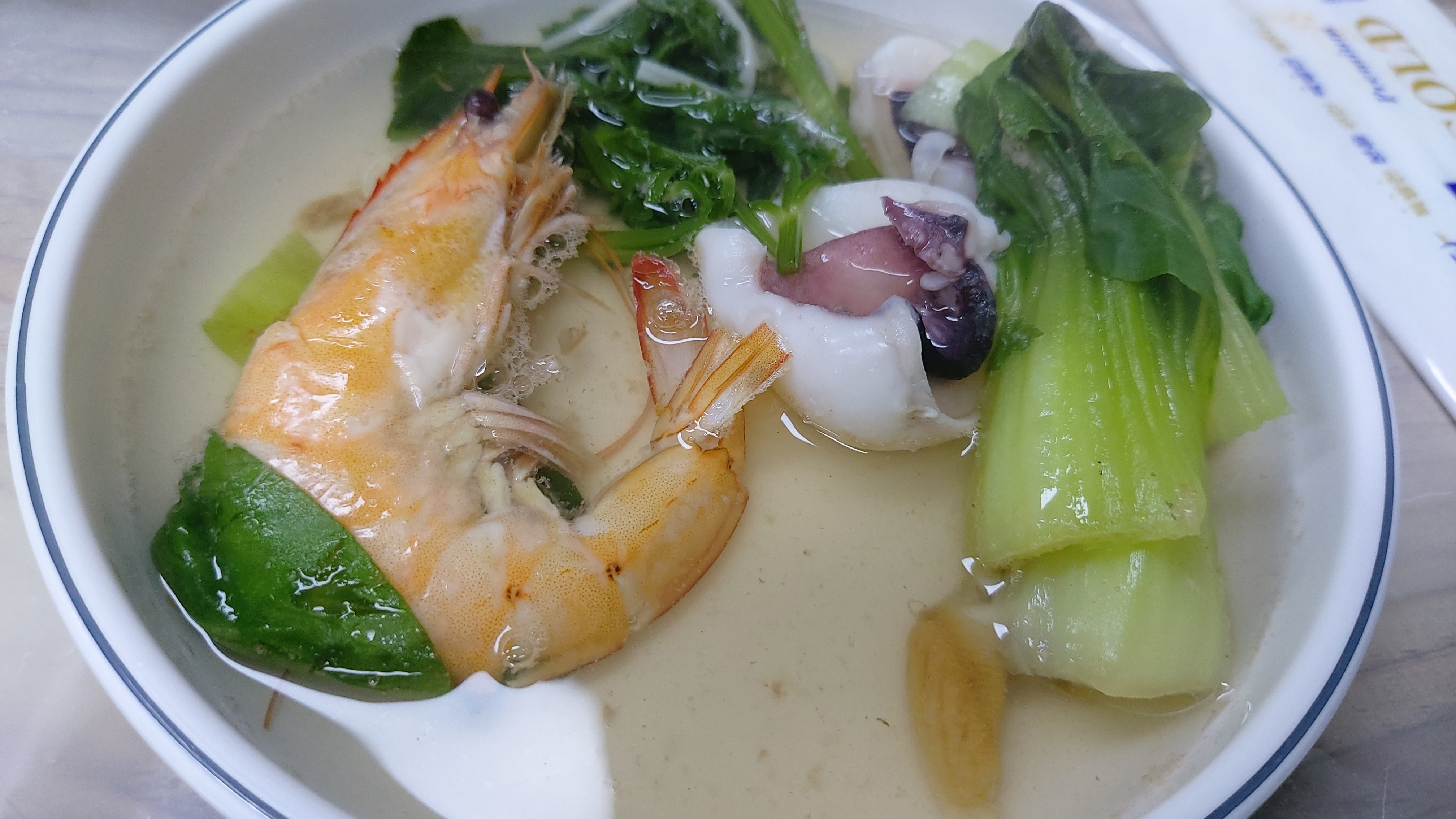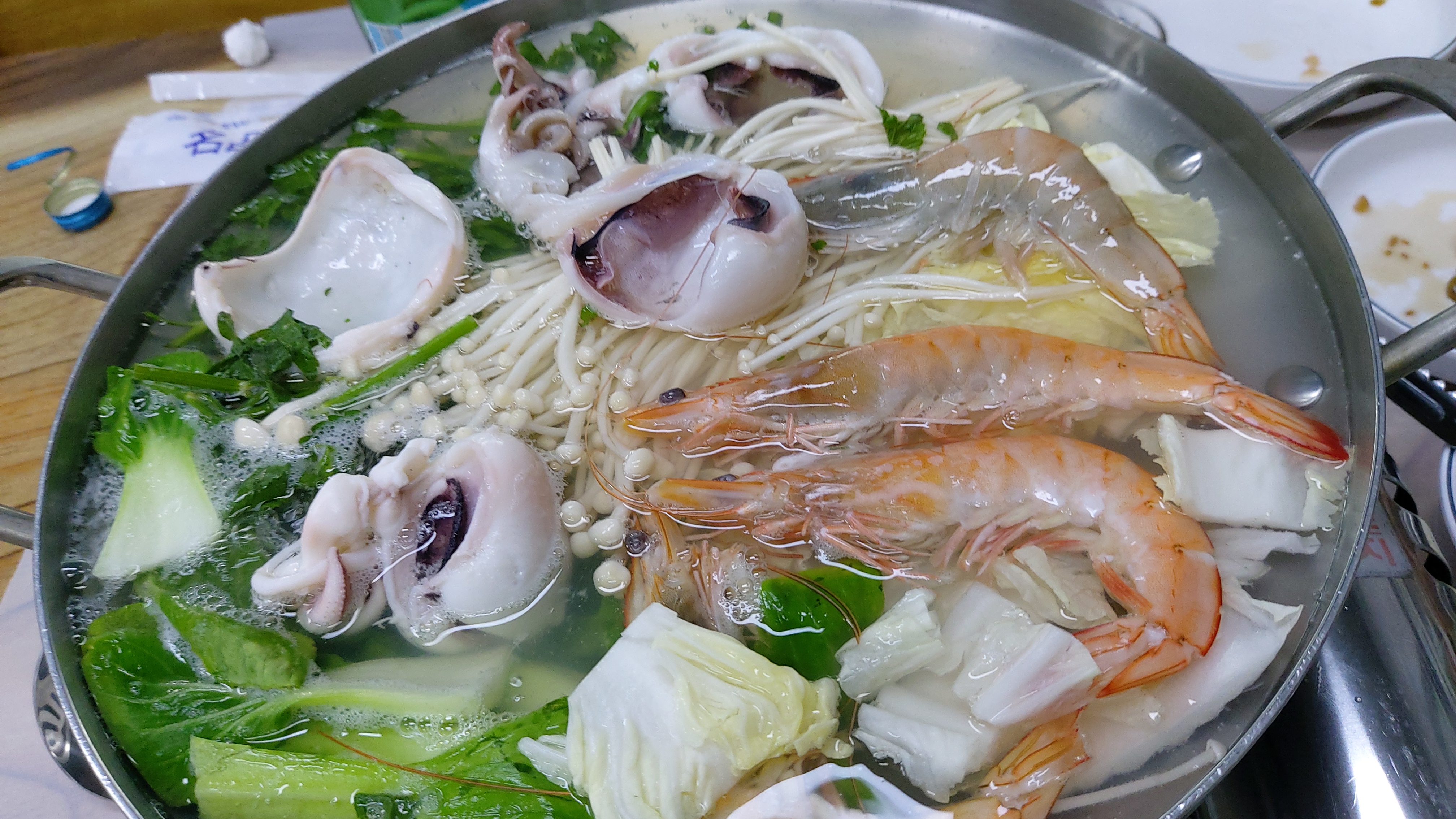 배추, 청경채, 버섯 등 신선한 야채에 대하, 갑오징어 등 해산물을 넣고 충분히 끓입니다.