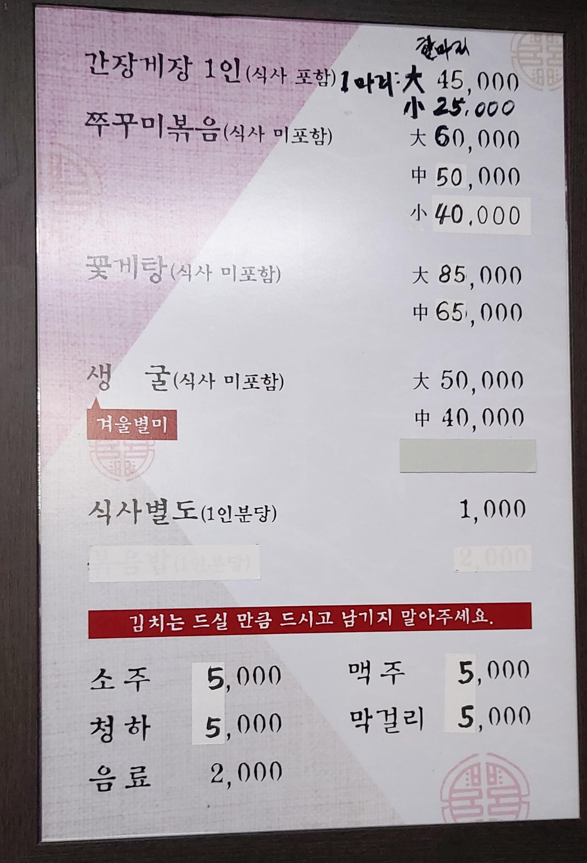이 날은 간장게장 대 2 마리에 쭈꾸미볶음 중짜리 하나 이렇게 주문합니다.