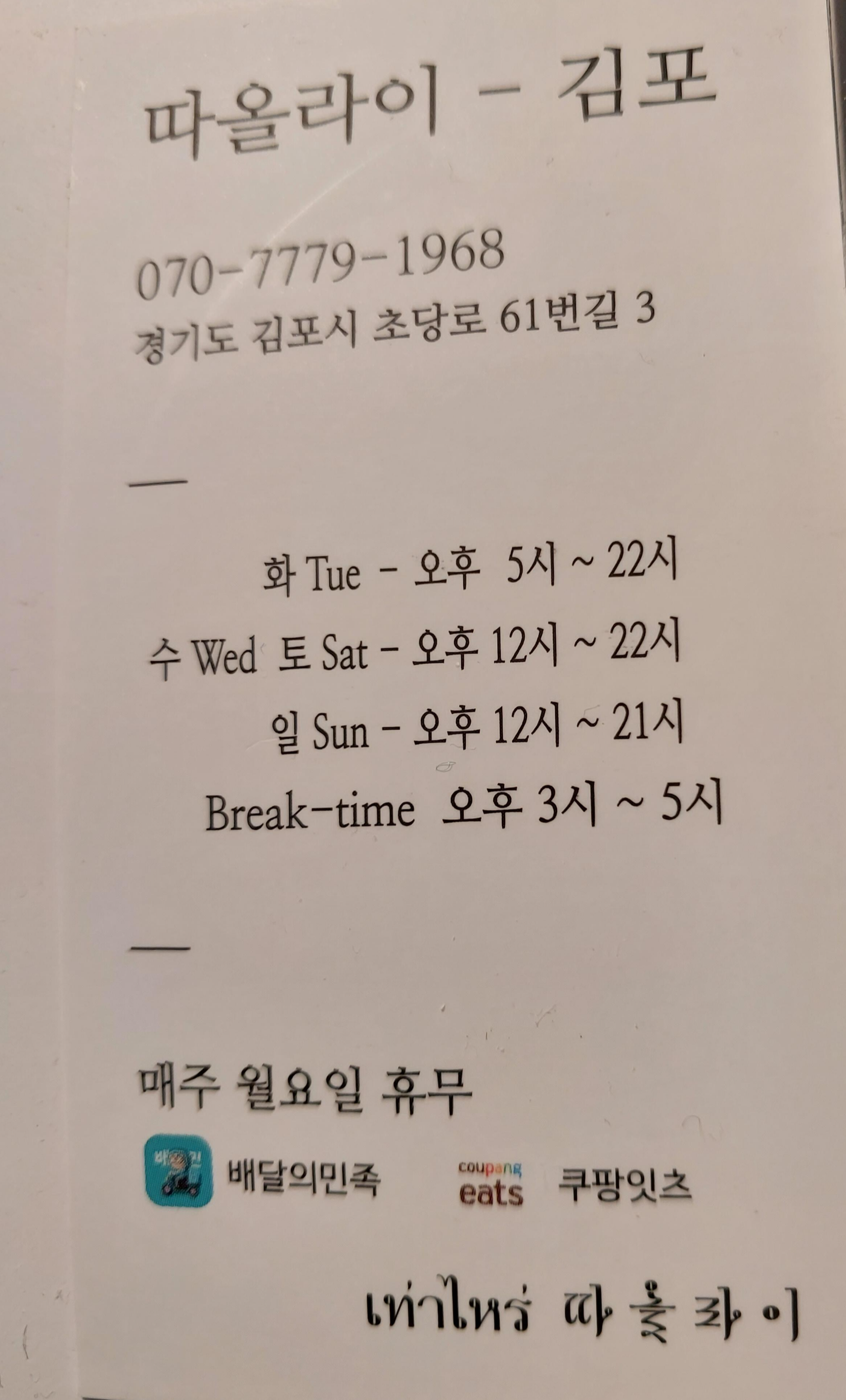 김포 따올라이는 김포시 장기동 먹자골목 김포한강 중앙공원 쪽에 있습니다.