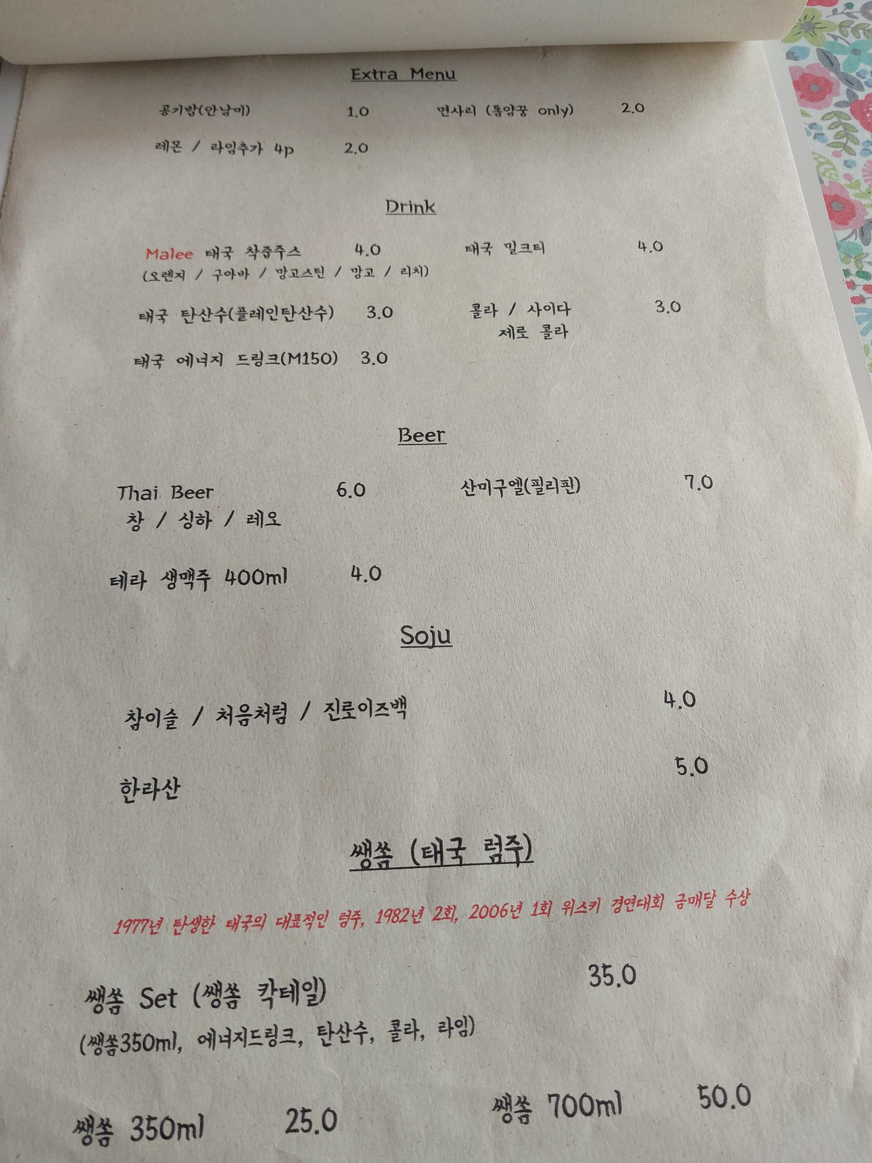 그런데 아들이 혼자 마시기가 좀 그런지 메뉴를 들쳐 보더니 "아빠, 이 집에 쌩쏨(Sang Som)이 있는데