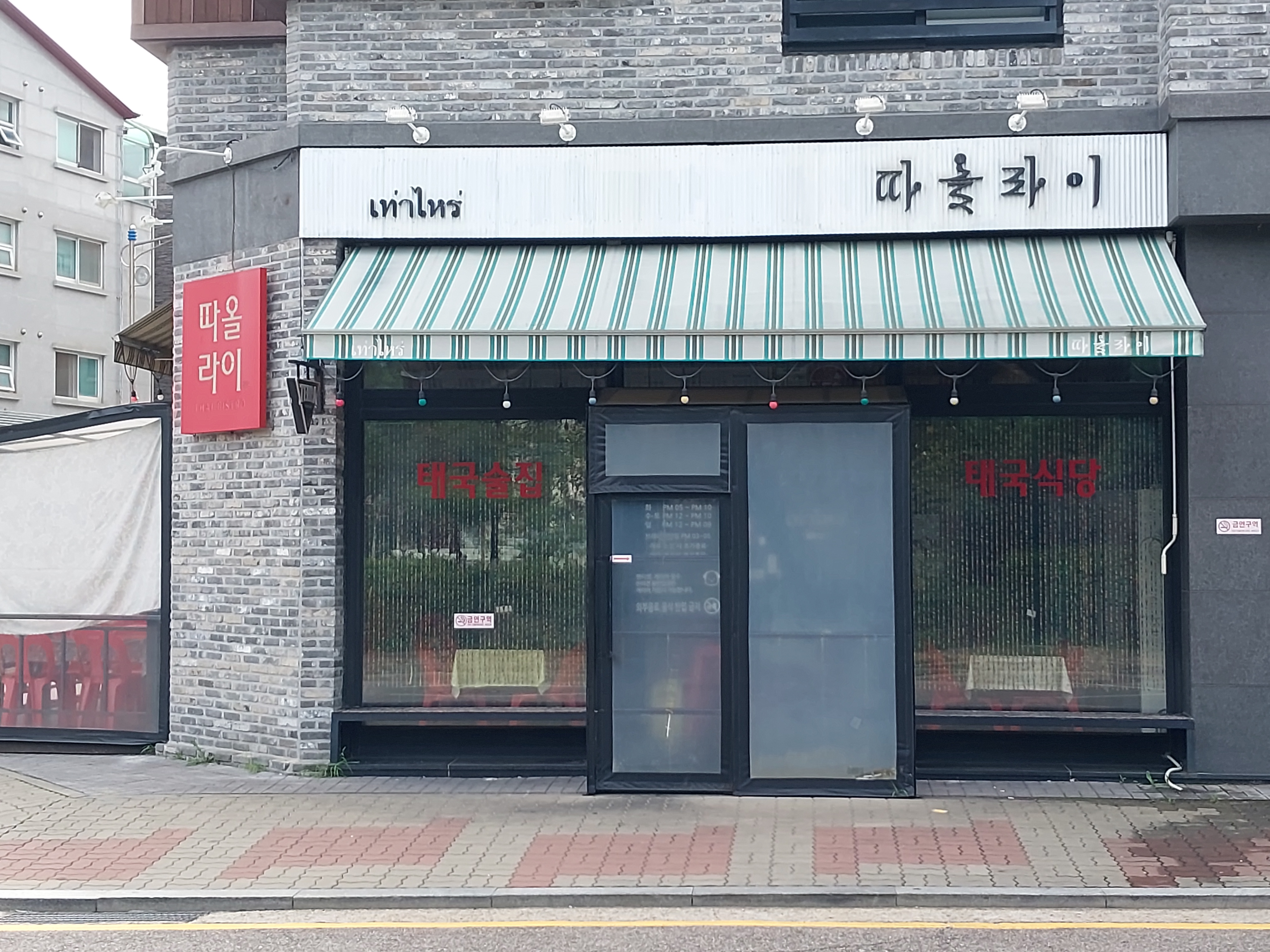 창문에 태국 술집, 태국 식당이라고 붙어 있습니다.