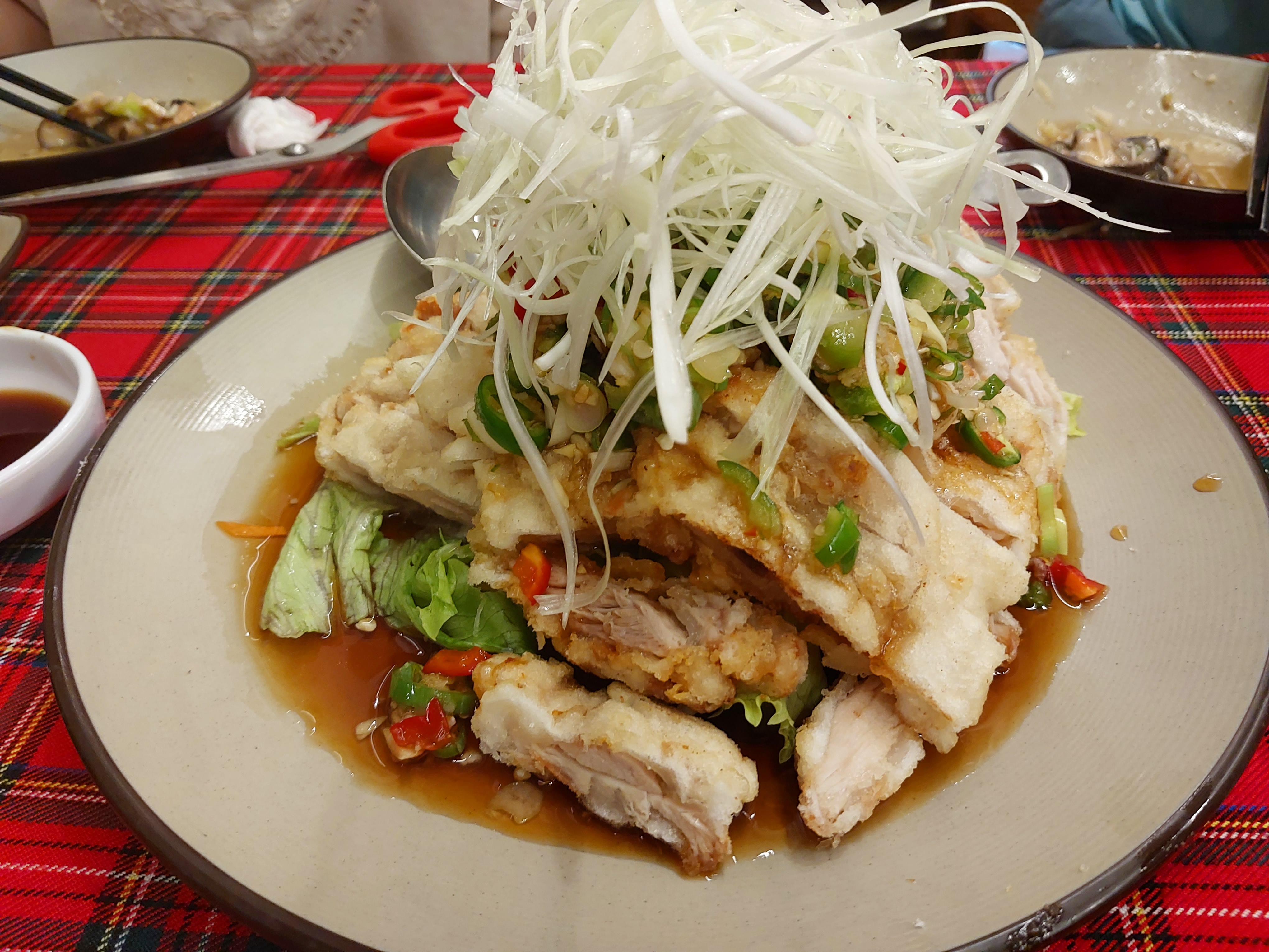 채소 위에 튀긴 닭고기와 파채를 얹은 후, 청고추와 홍고추를 곁들인 간장 소스를 부어 나오는 요리입니다.