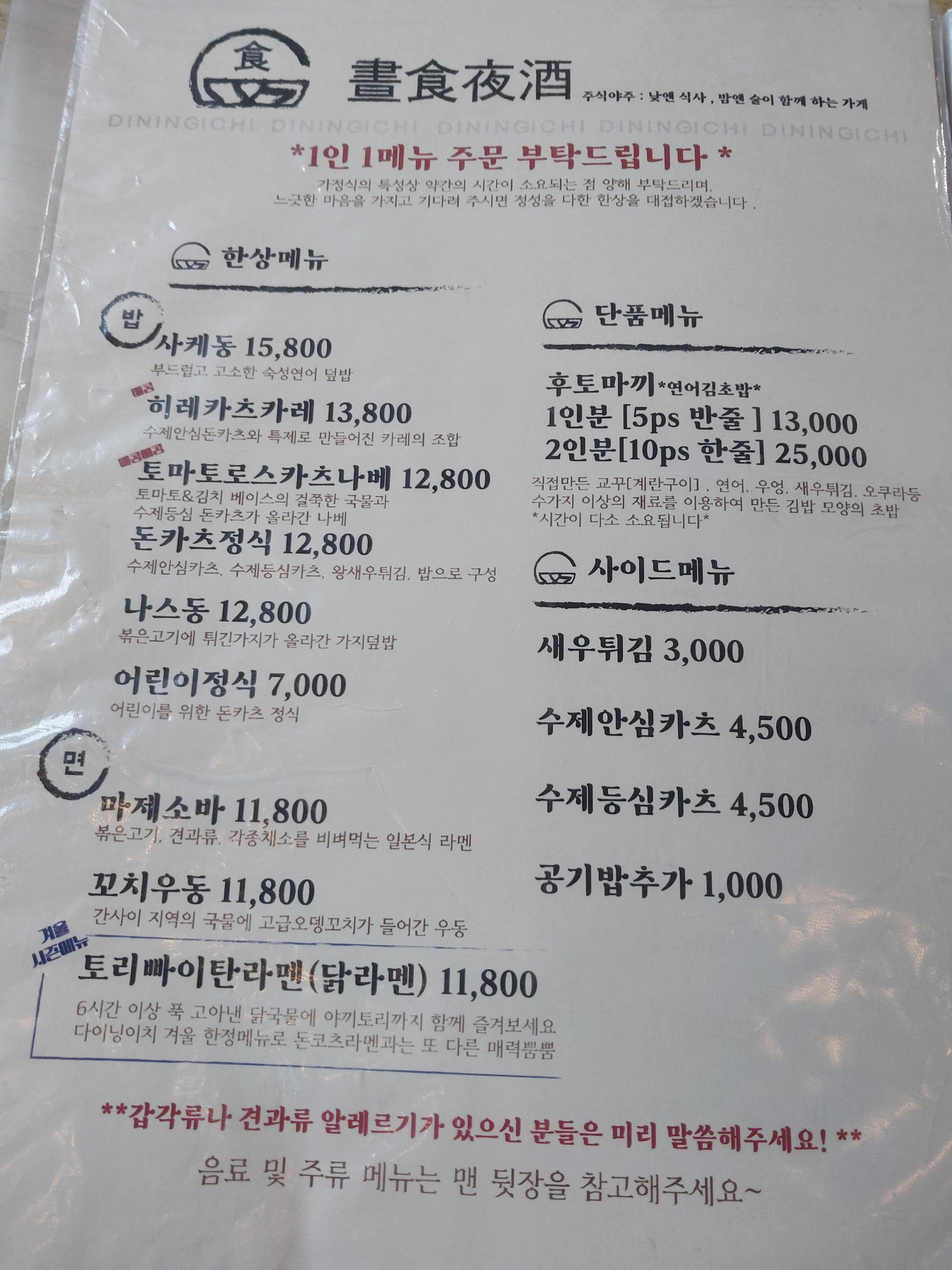 주간 식사 메뉴와 저녁 이자카야 메뉴입니다.