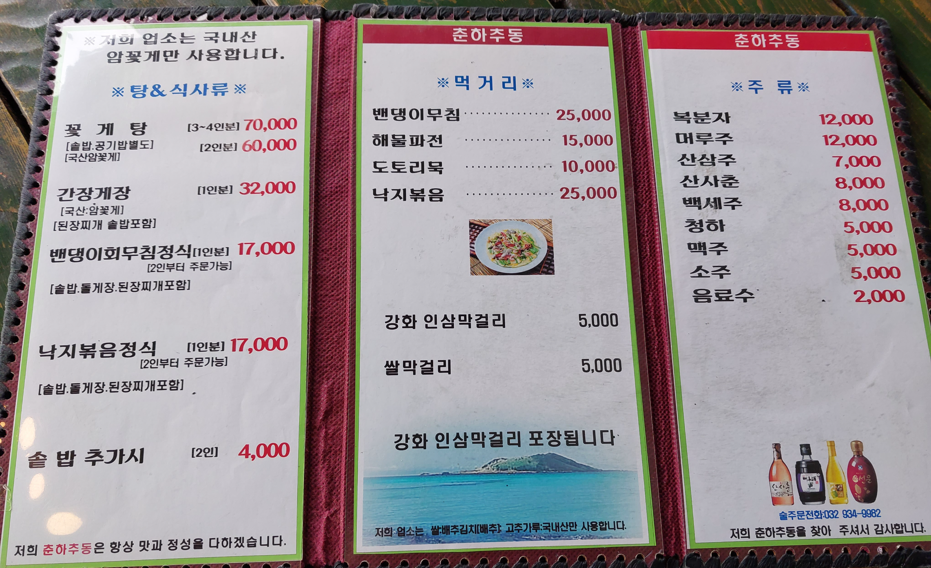 (꽃게탕 3인분 70,000원 4인분 80,000원 정식류 18,000원))
