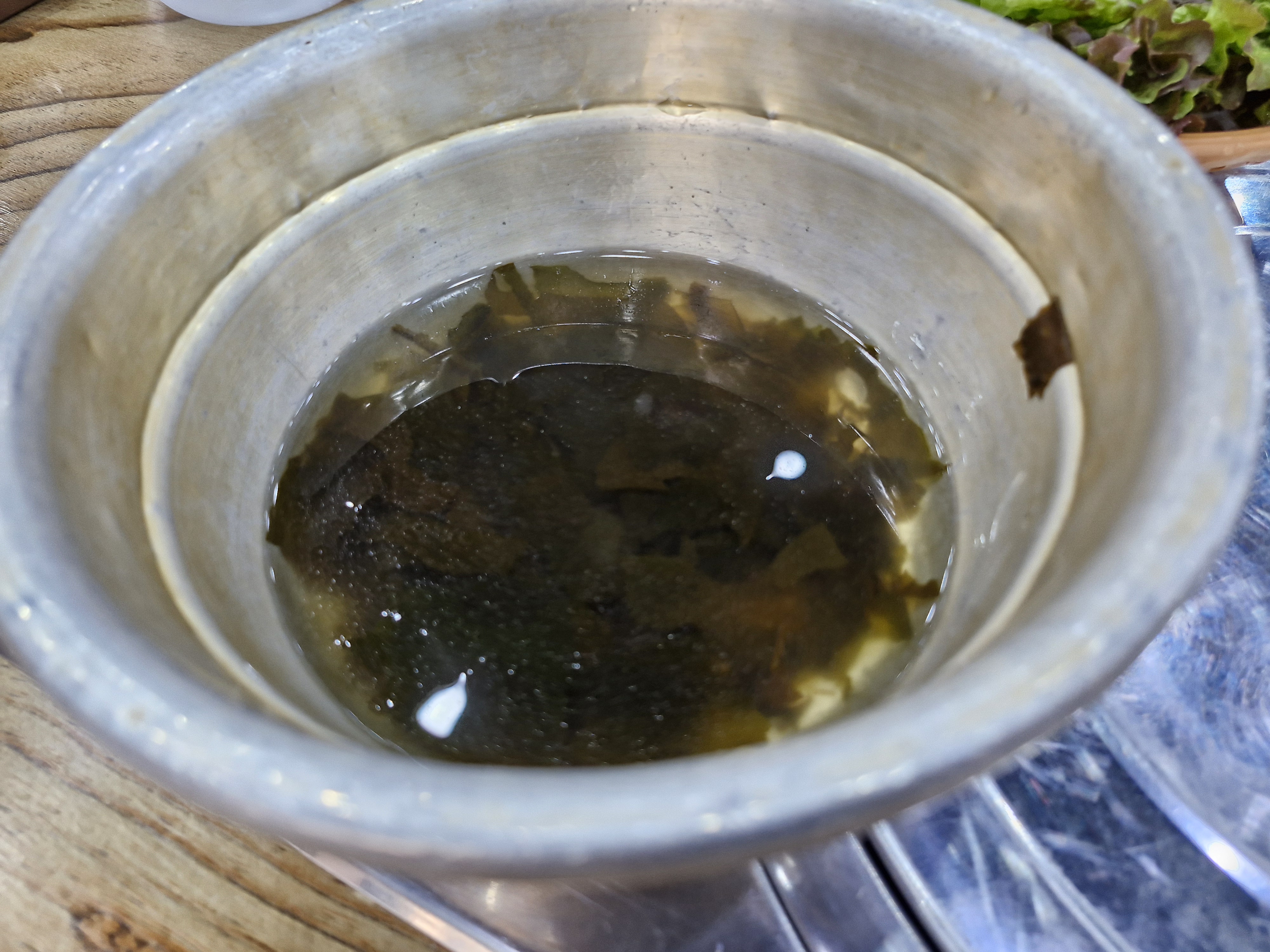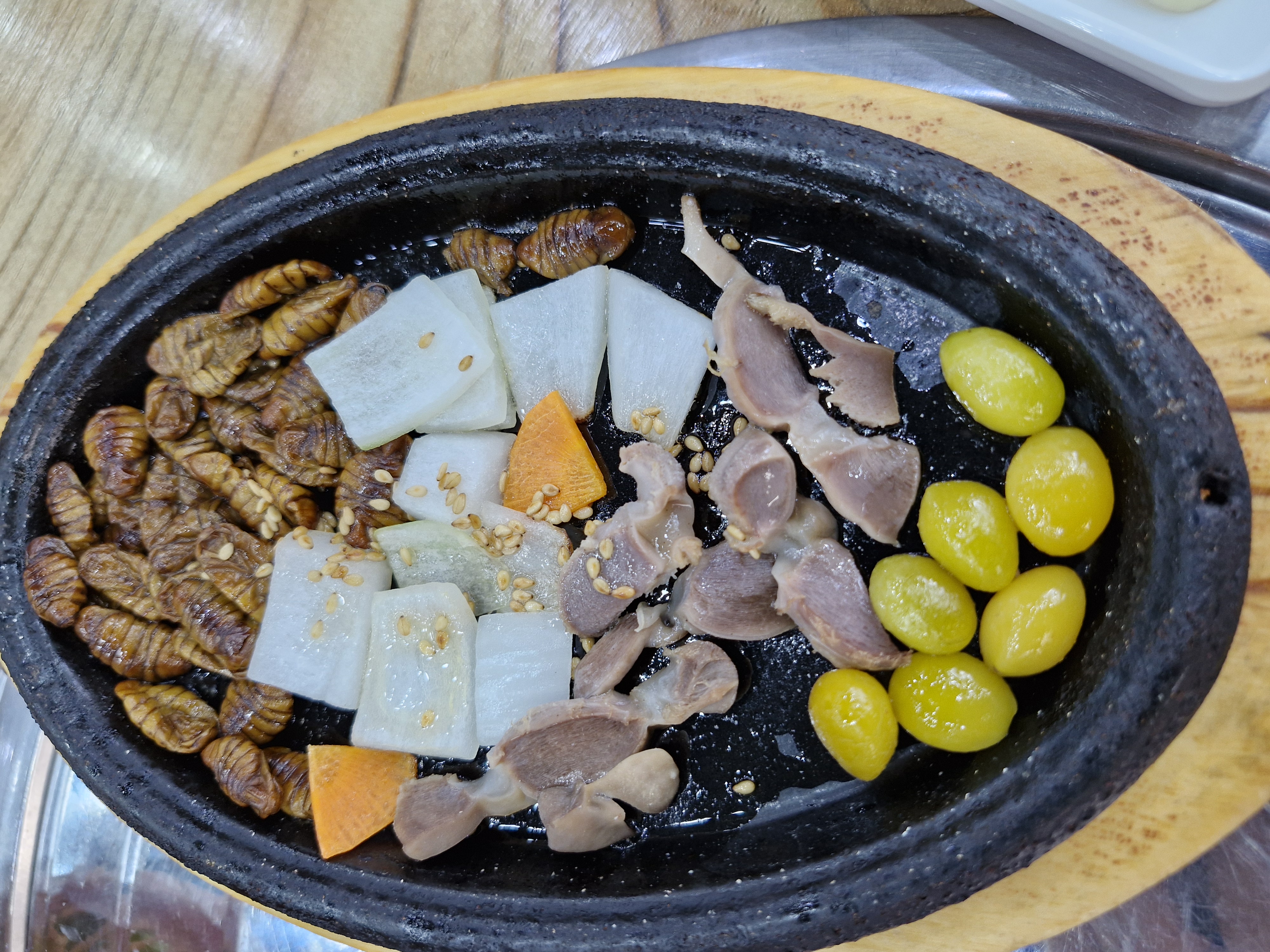 삶은 콩, 샐러드, 미역국에 번데기, 작은 가자미 한 마리, 근위볶음 등이 올라가 있는 철판이 하나 나오는군요.