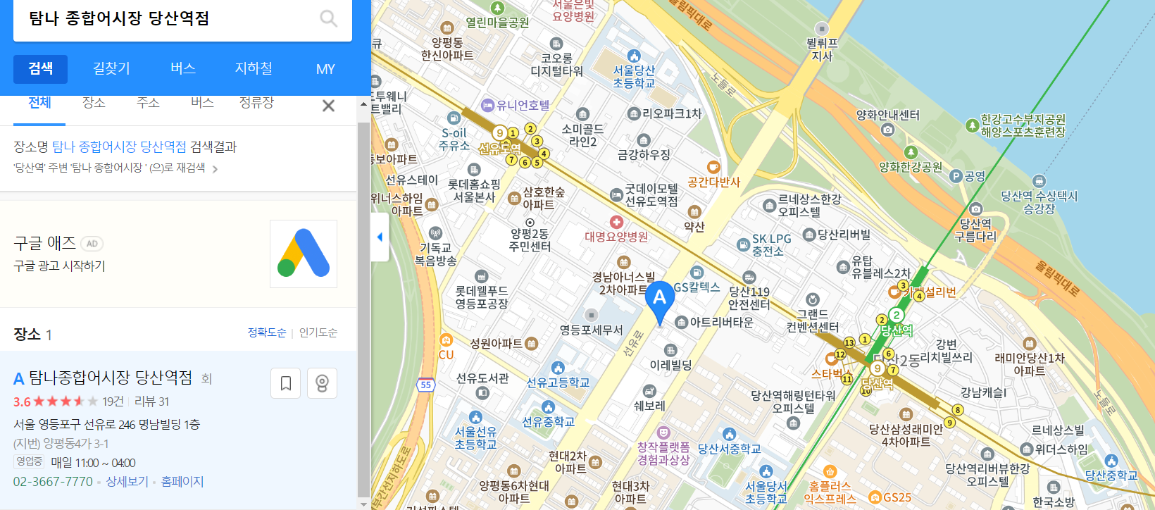 탐나종합어시장 당산역점은 양평동사거리에서 남쪽으로 150m 정도 내려와 영등포세무서 맞은편이고