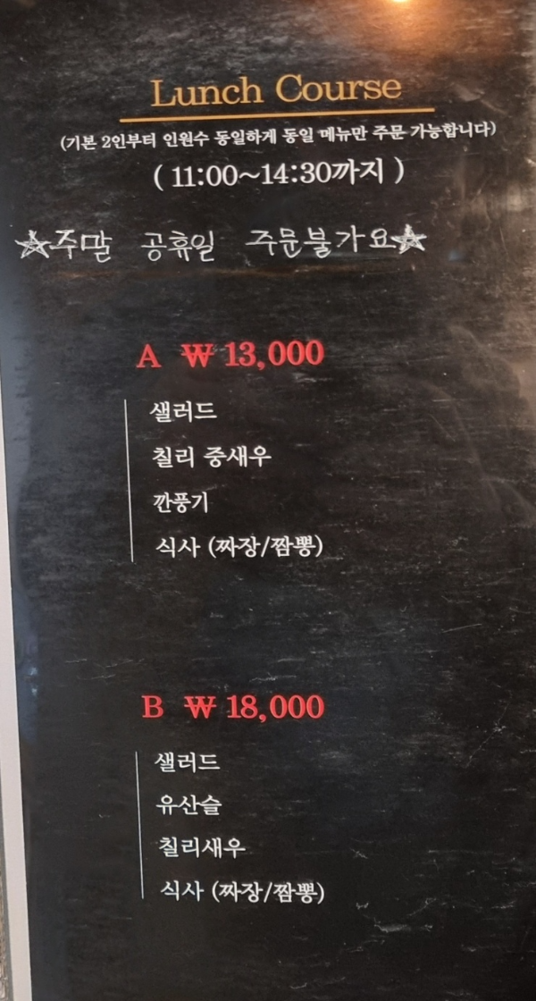 대체적으로 가격이 착한 편이고 다른 중국집에 비해 요리 종류가 적습니다.