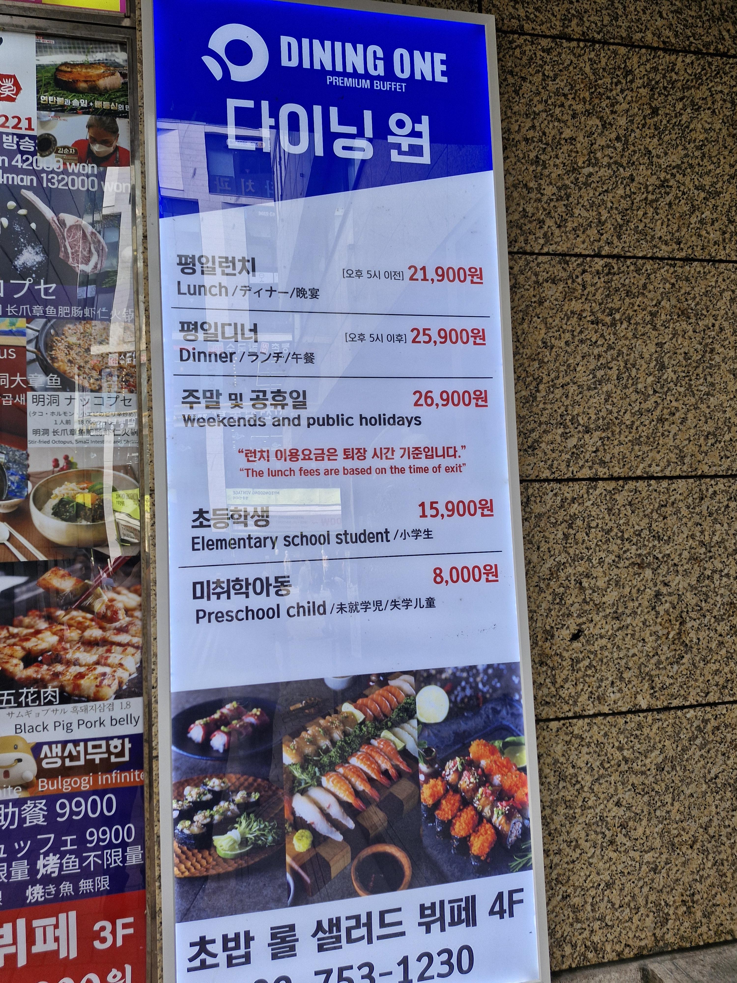 초밥, 롤, 샐러드 뷔페인 다이닝원의 영업시간은 매일 오전 11시부터 오후 9시 30분까지이고